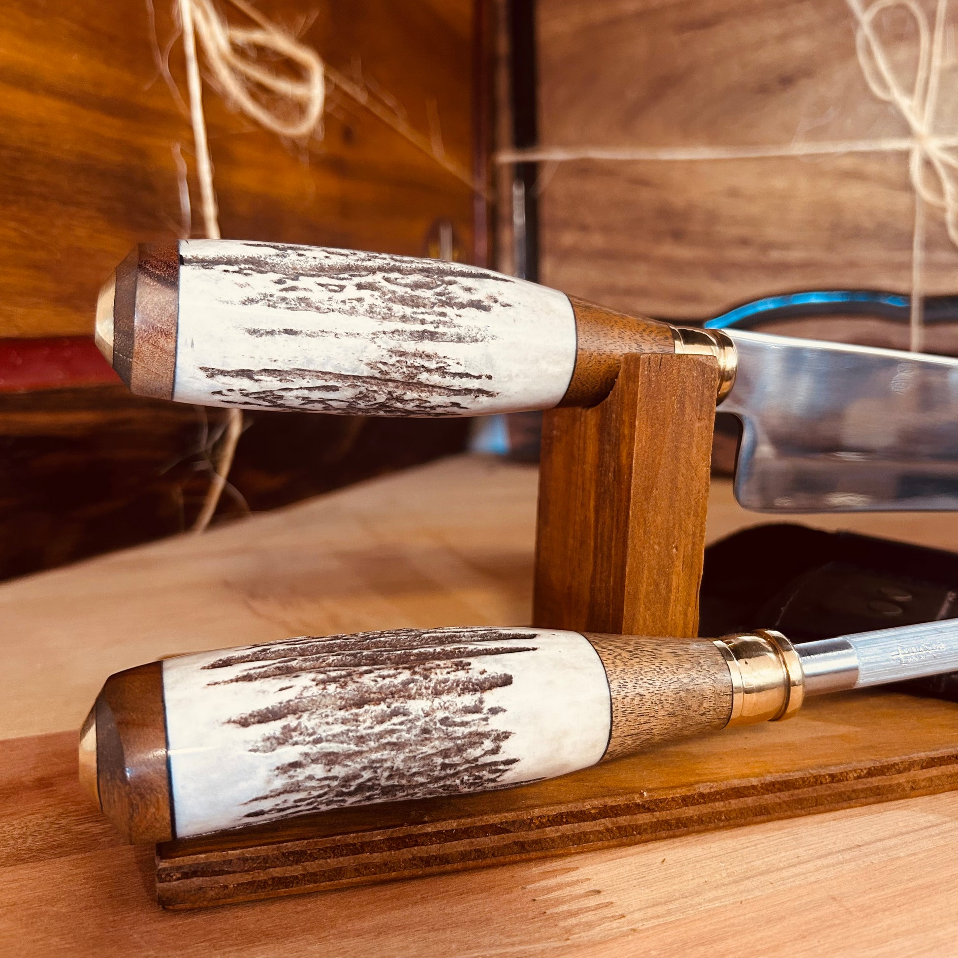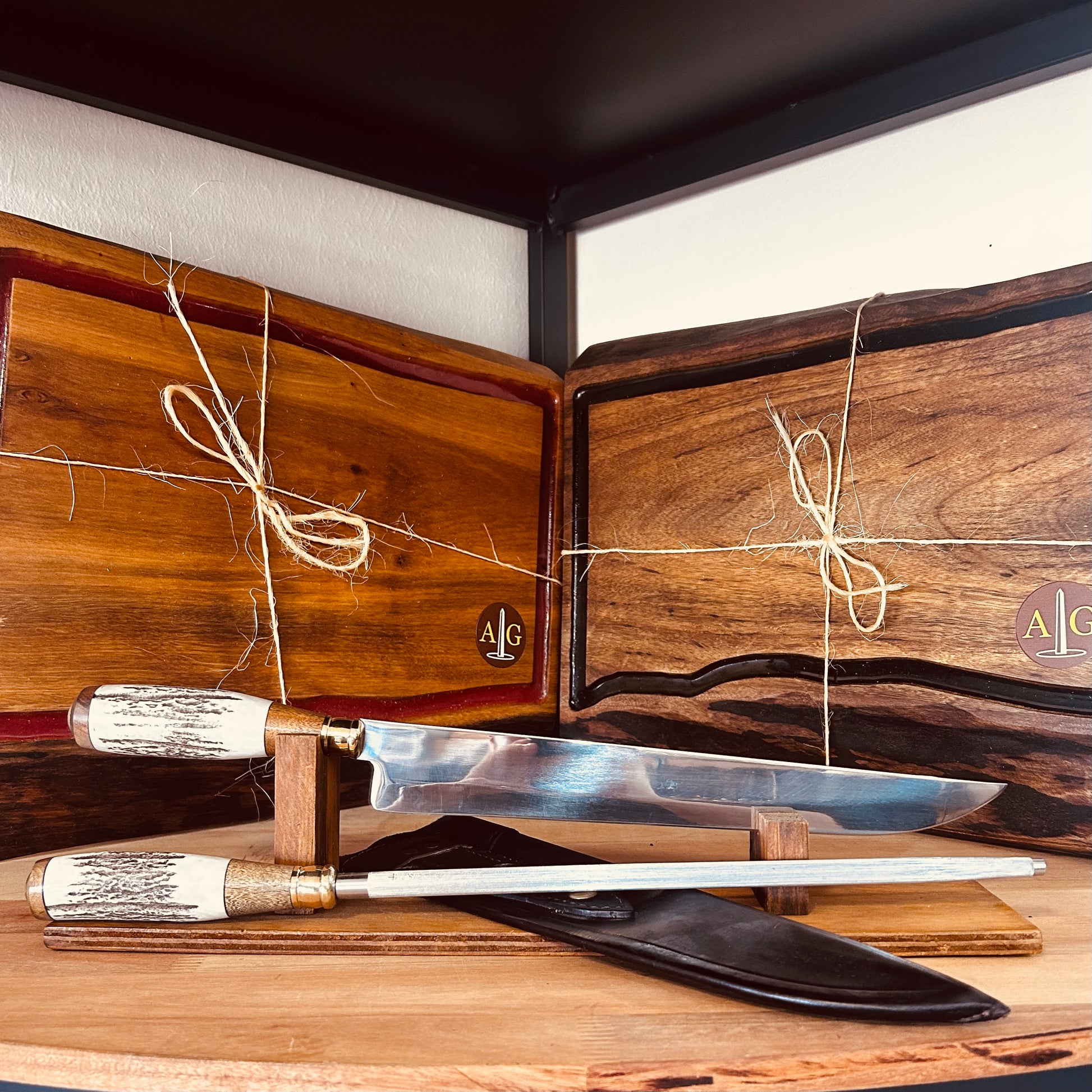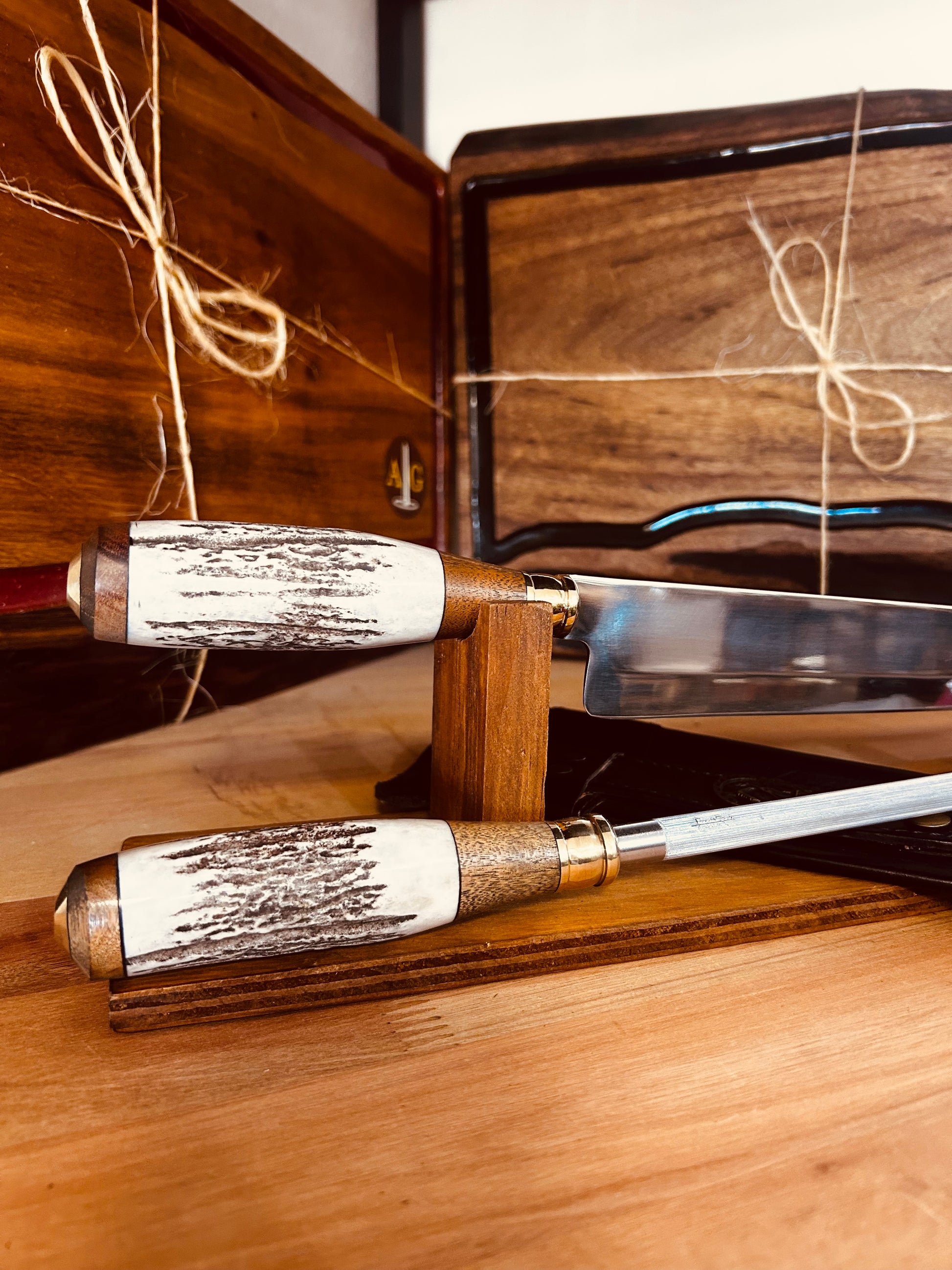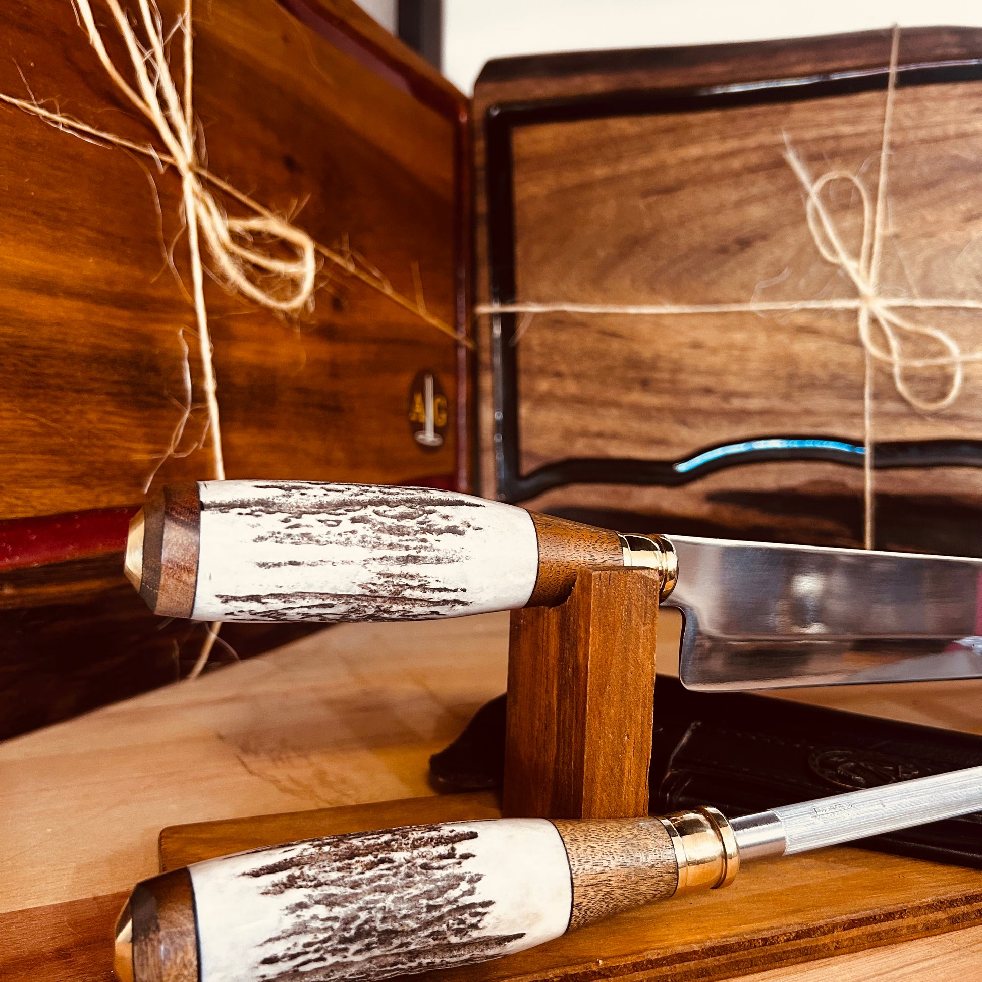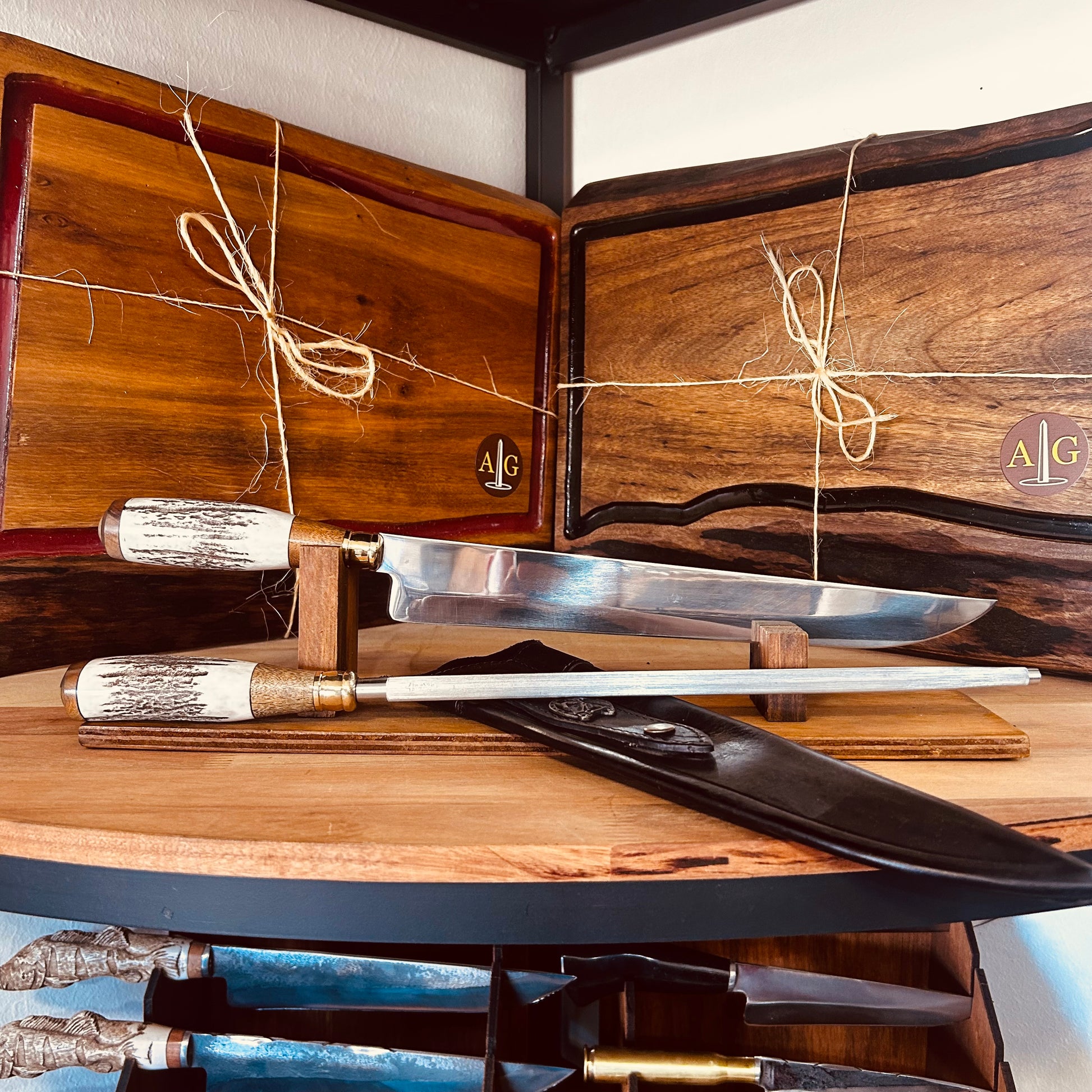 Un set distinguido que combina elegancia y alto rendimiento. Cuchillo y chaira con mango trabajado en asta de ciervo natural, que garantizan resistencia, durabilidad y un acabado de lujo. La hoja, forjada en acero inoxidable templado, ofrece un filo preciso y duradero, ideal para quienes valoran un corte eficiente y seguro.