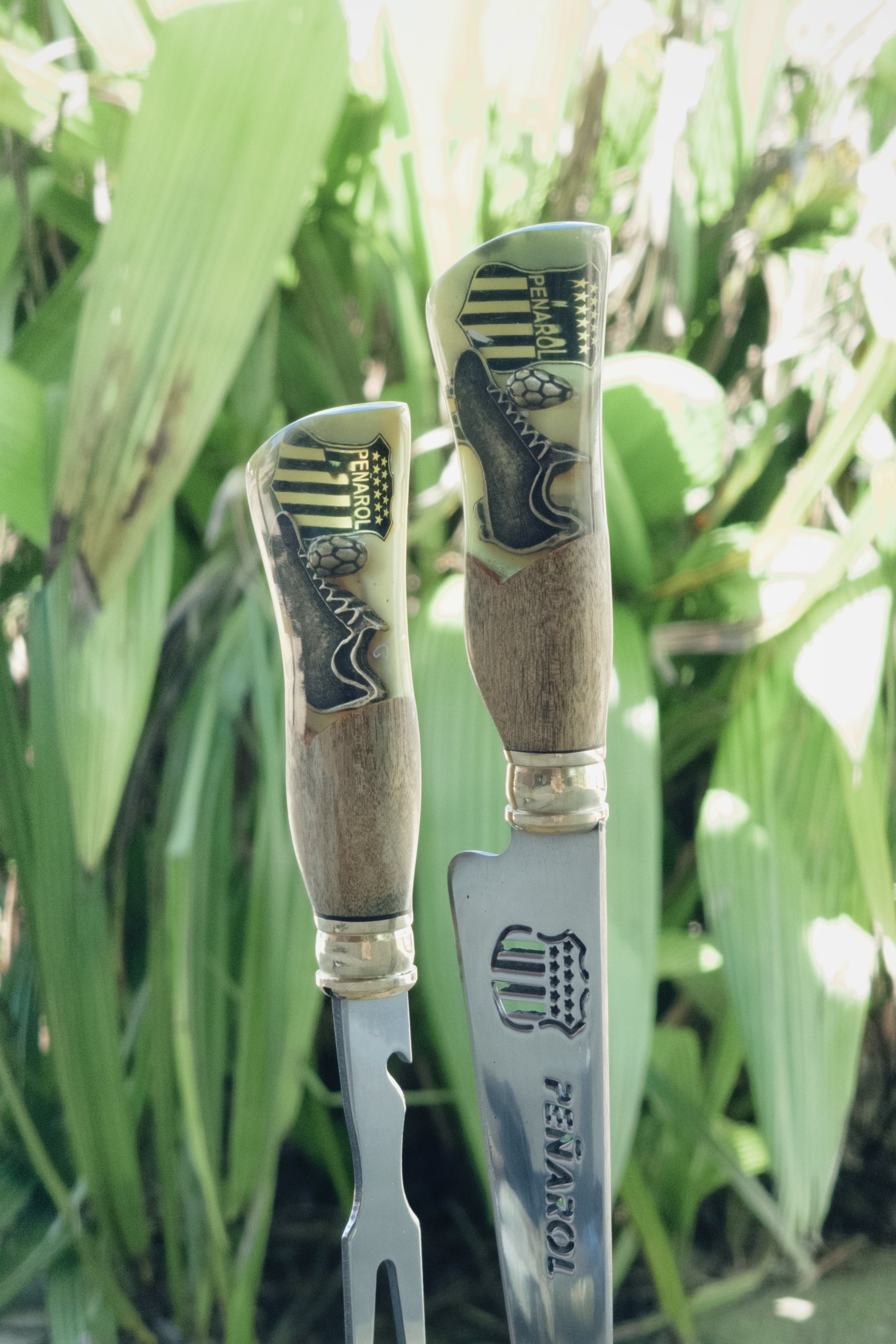 Cuchillo y pincho de dos puntas artesanal, con lámina en acero inoxidable, calada, pulida y de 25, cm de largo. Mango en resina epoxi y botón de aluminio. Acompaña vaina en cuero.