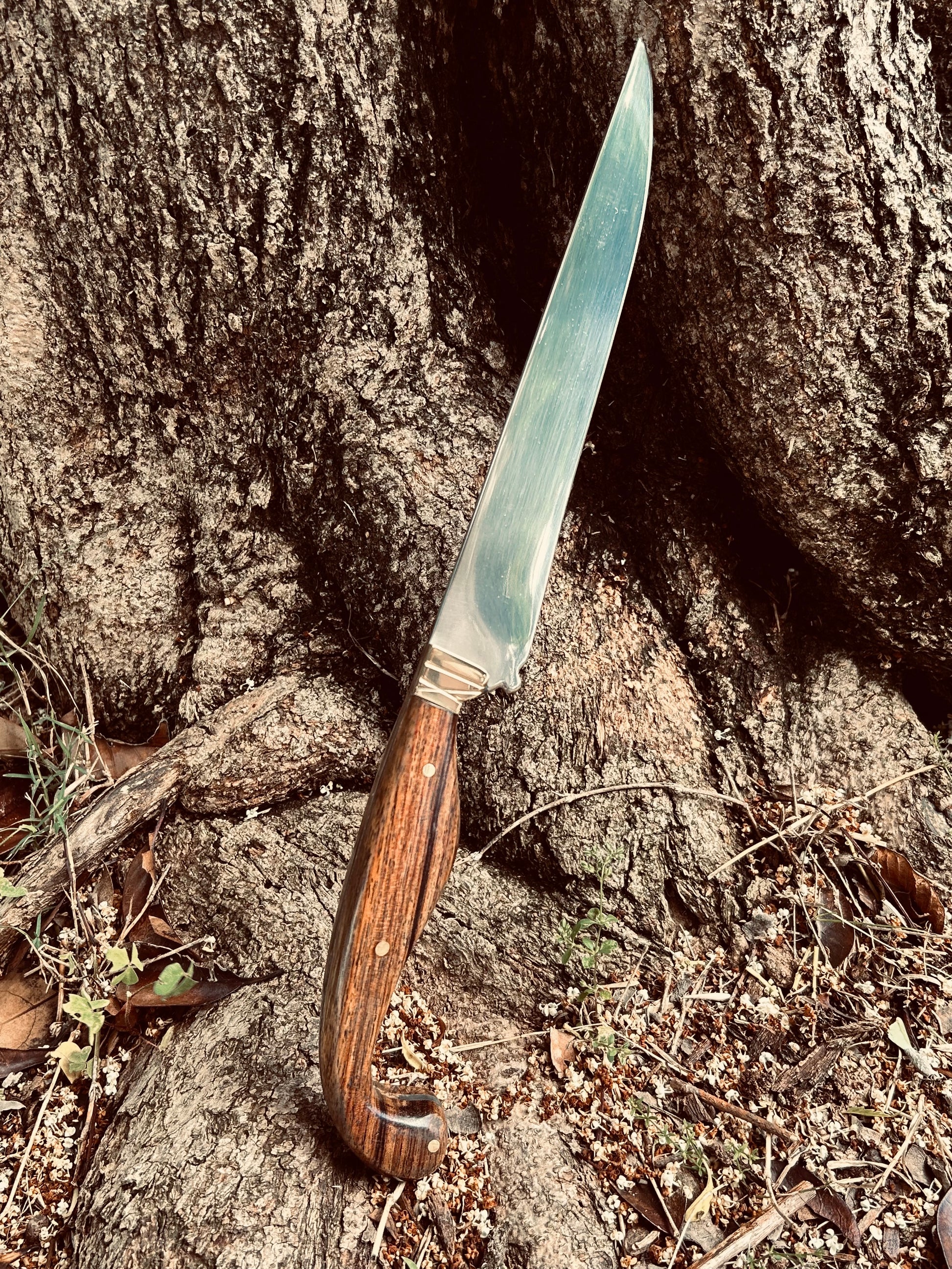Cuhcillo con mango sorocaba en madera imbuia con boton. Hoja en acero inoxidable, acompañado de su vaina.
