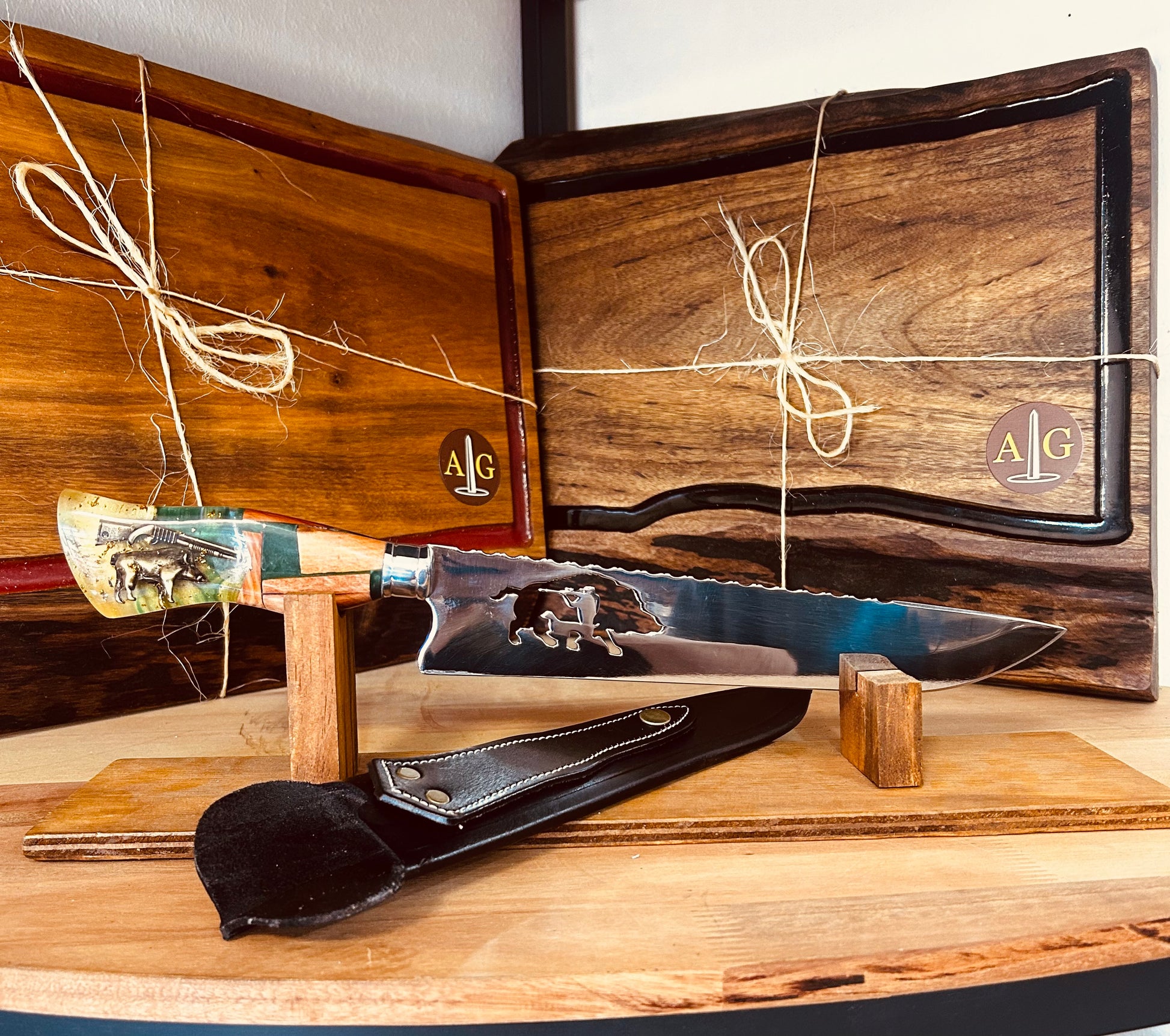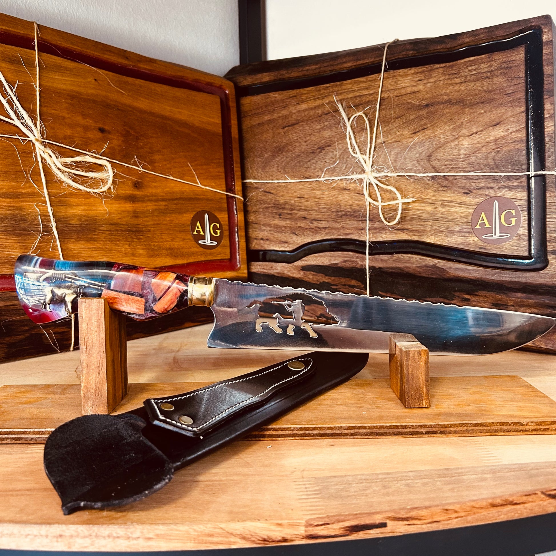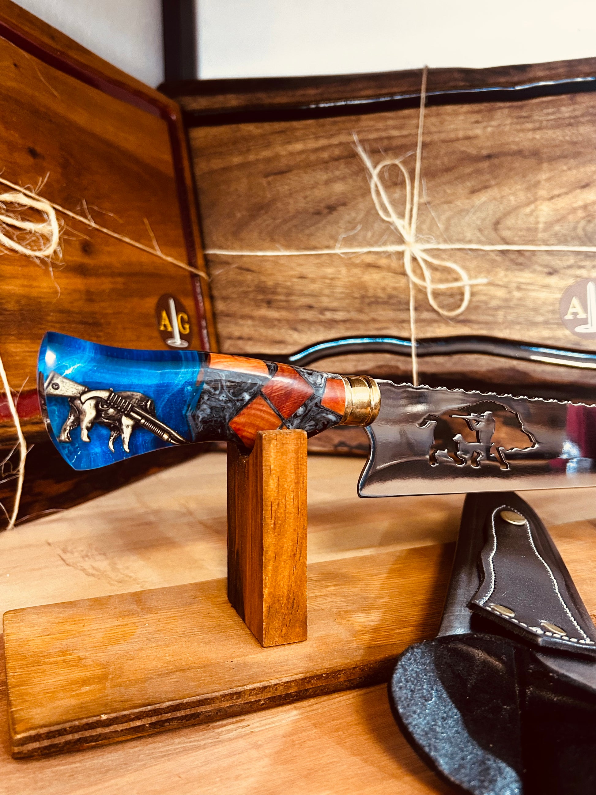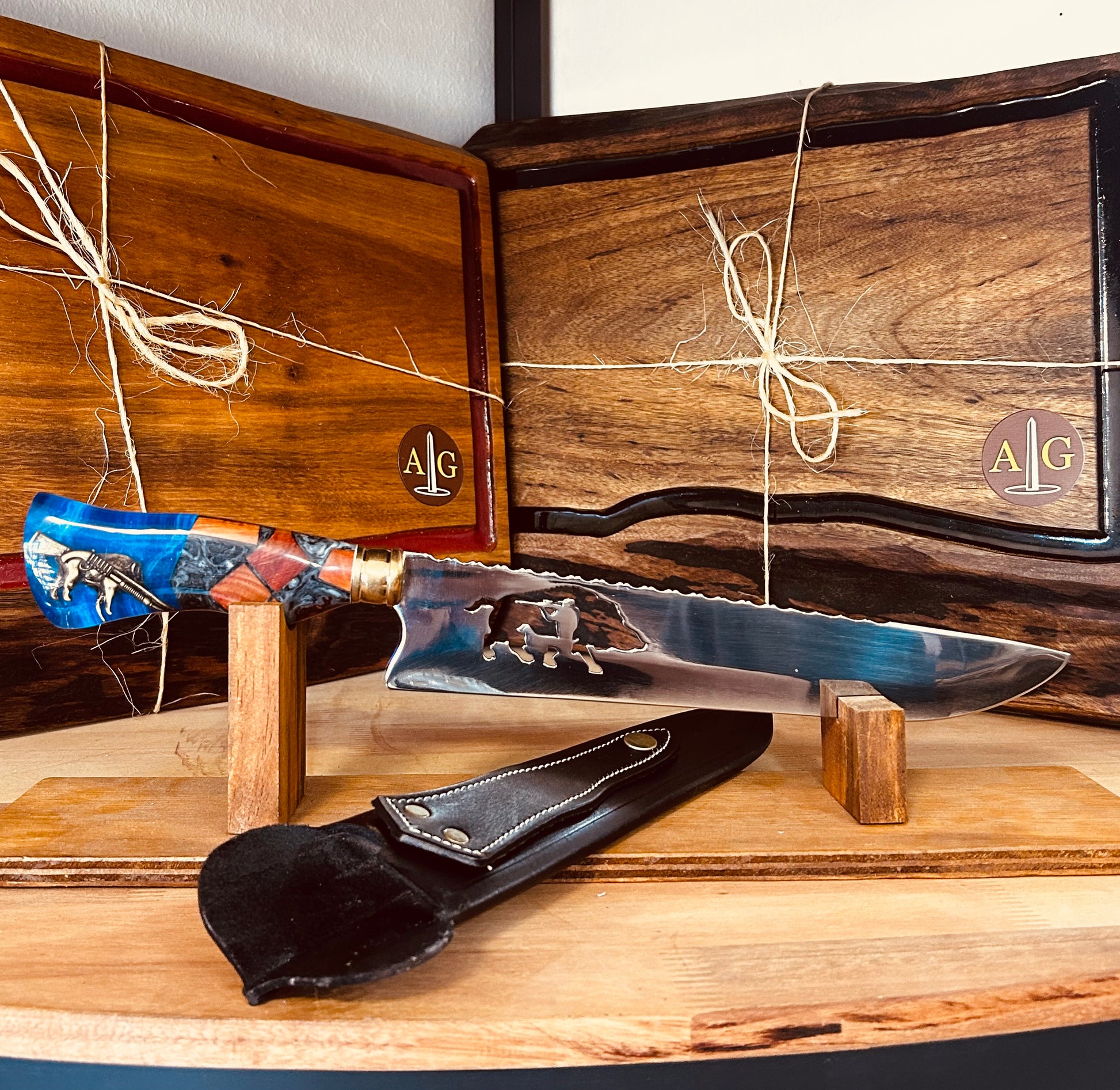 Cuchillo con hoja de acero inoxidable, mango hibrido (resina epoxi con madera) y vaina en cuero. Hoja y mango personalizados con diseño de cazador y jabalí. Esta pieza es ideal para el corte de carne y alimentos varios, resultando ser muy practico en la parrilla.