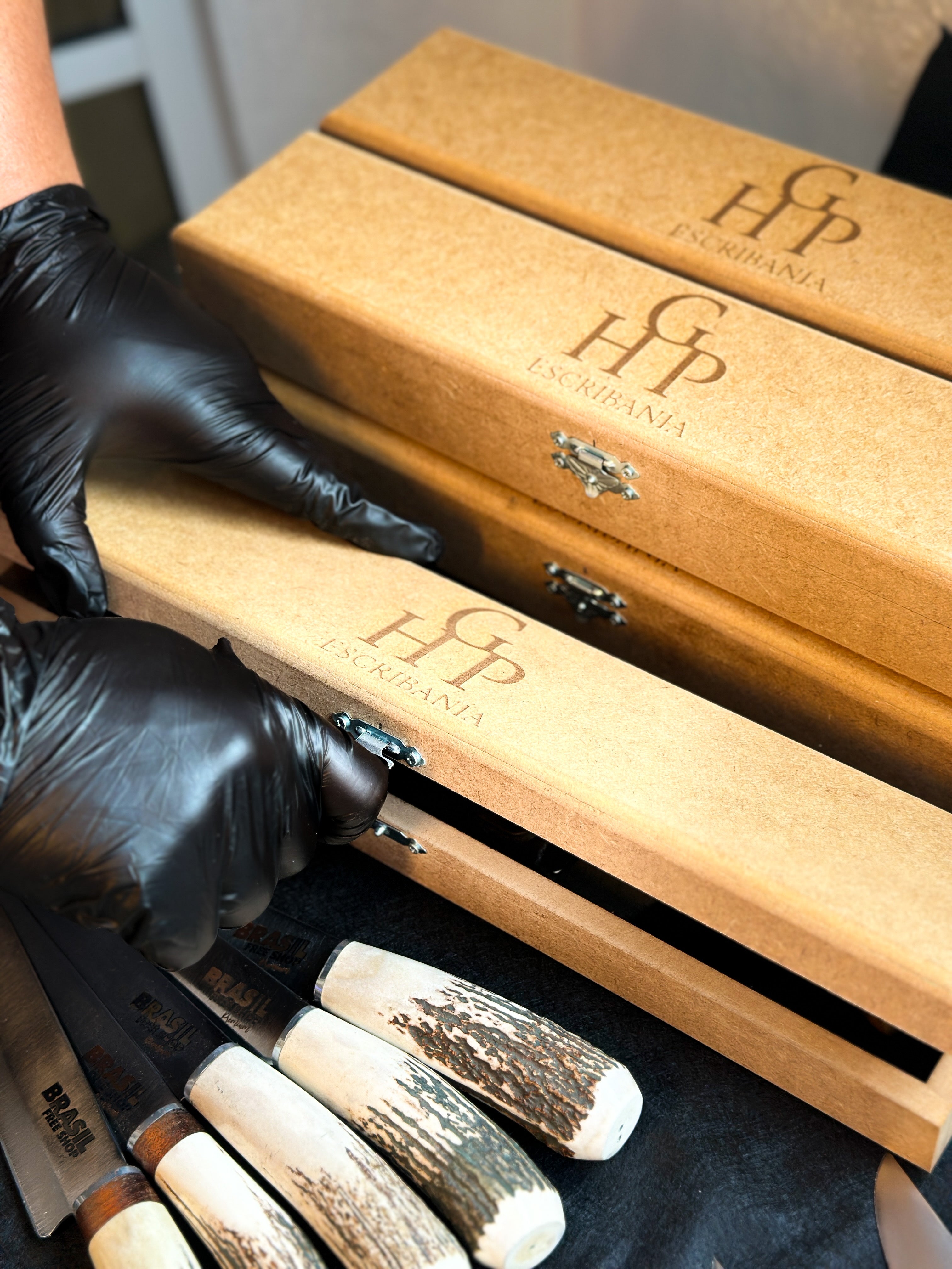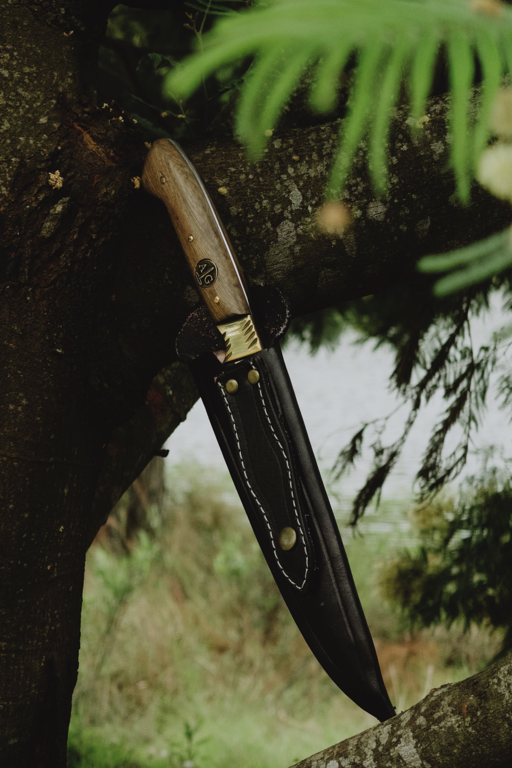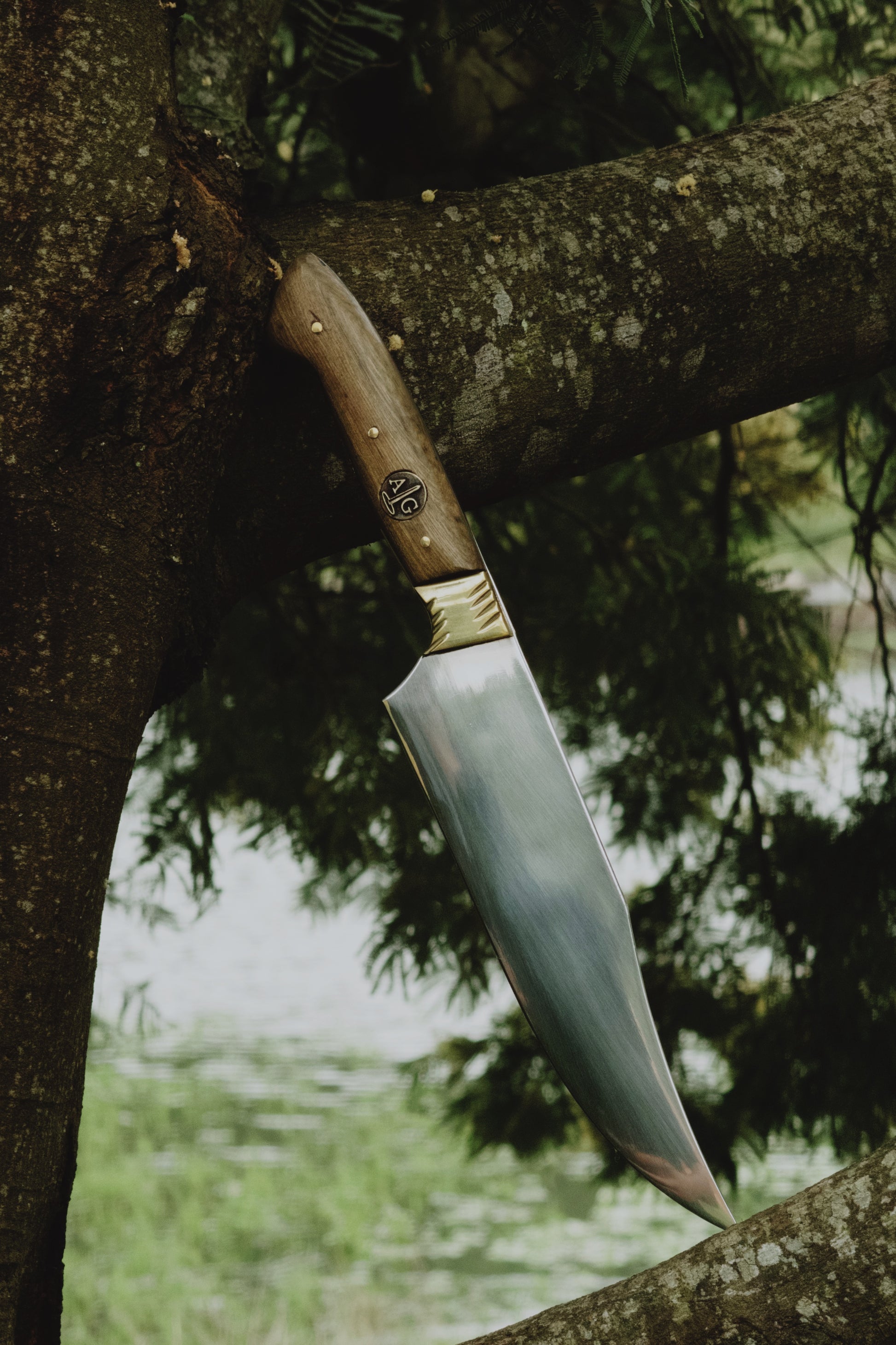 Cuhcilla con mango chato en madera imbuia con boton y pin exclusivo de la linea Arteygaucho. Hoja larga, elaborada en acero inoxidable, acompañado de su vaina.