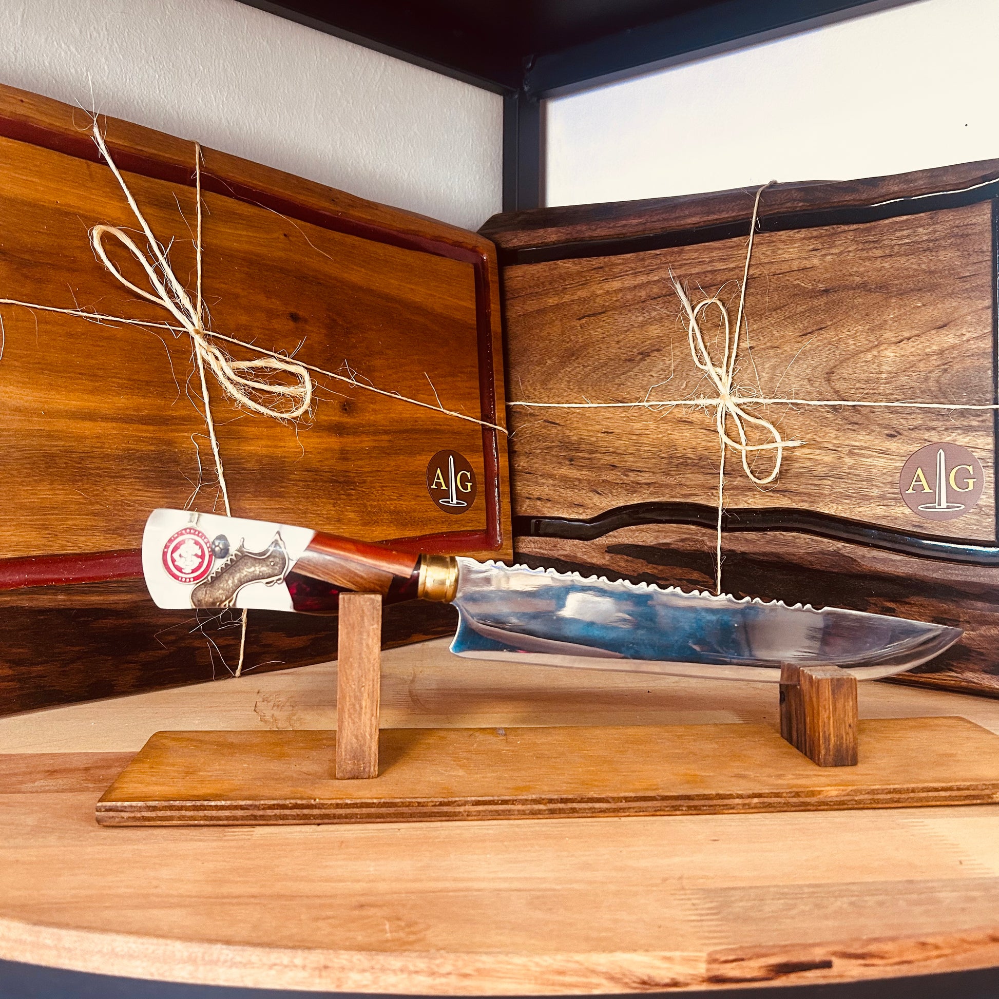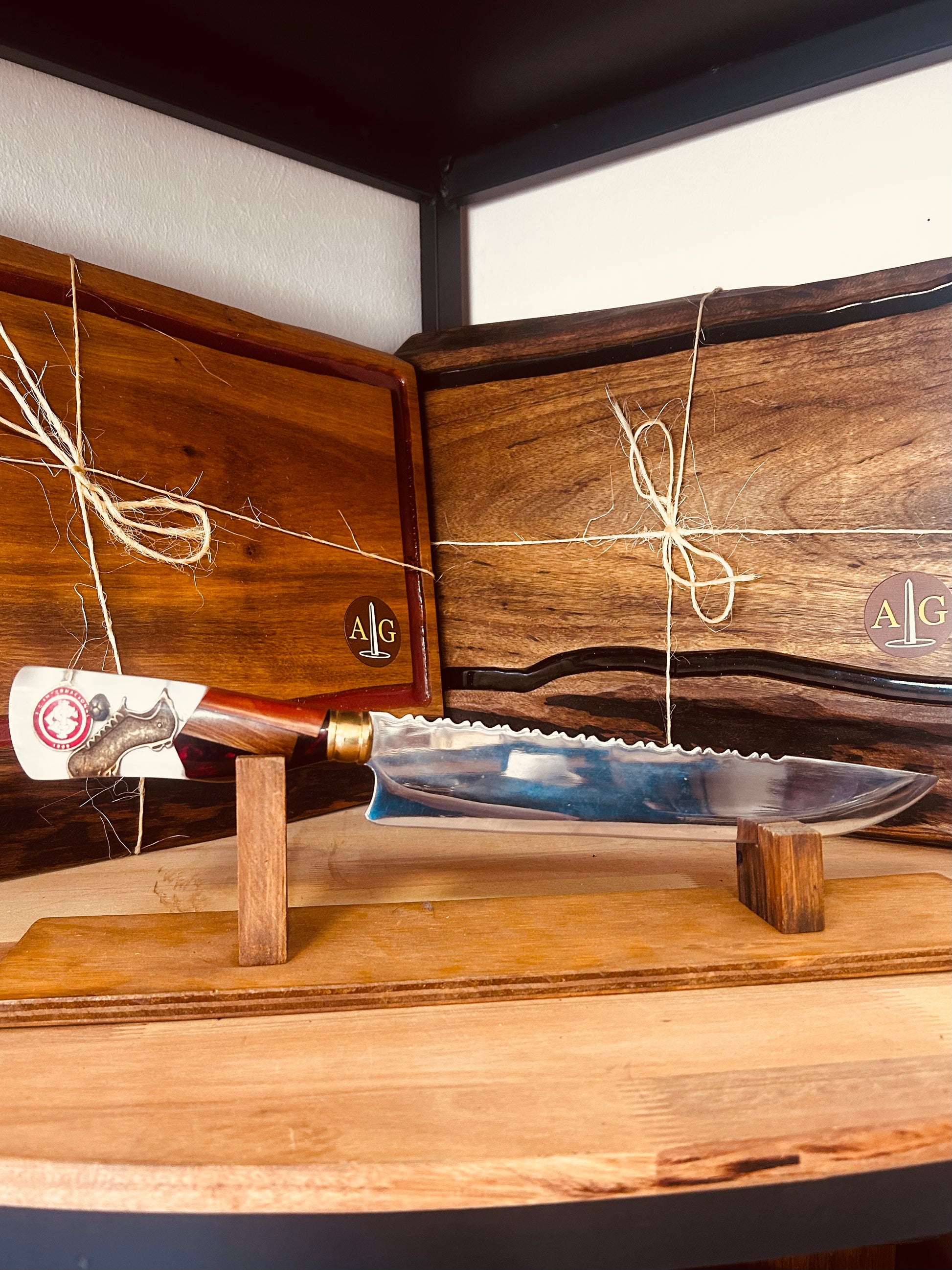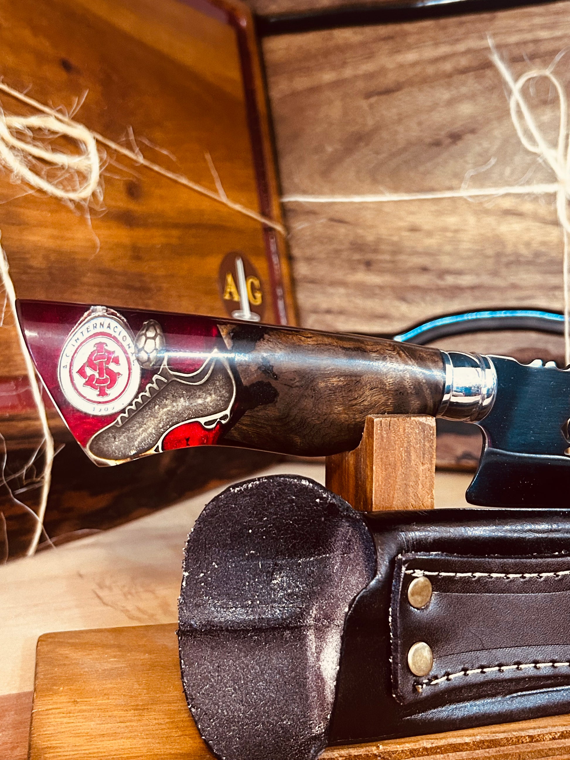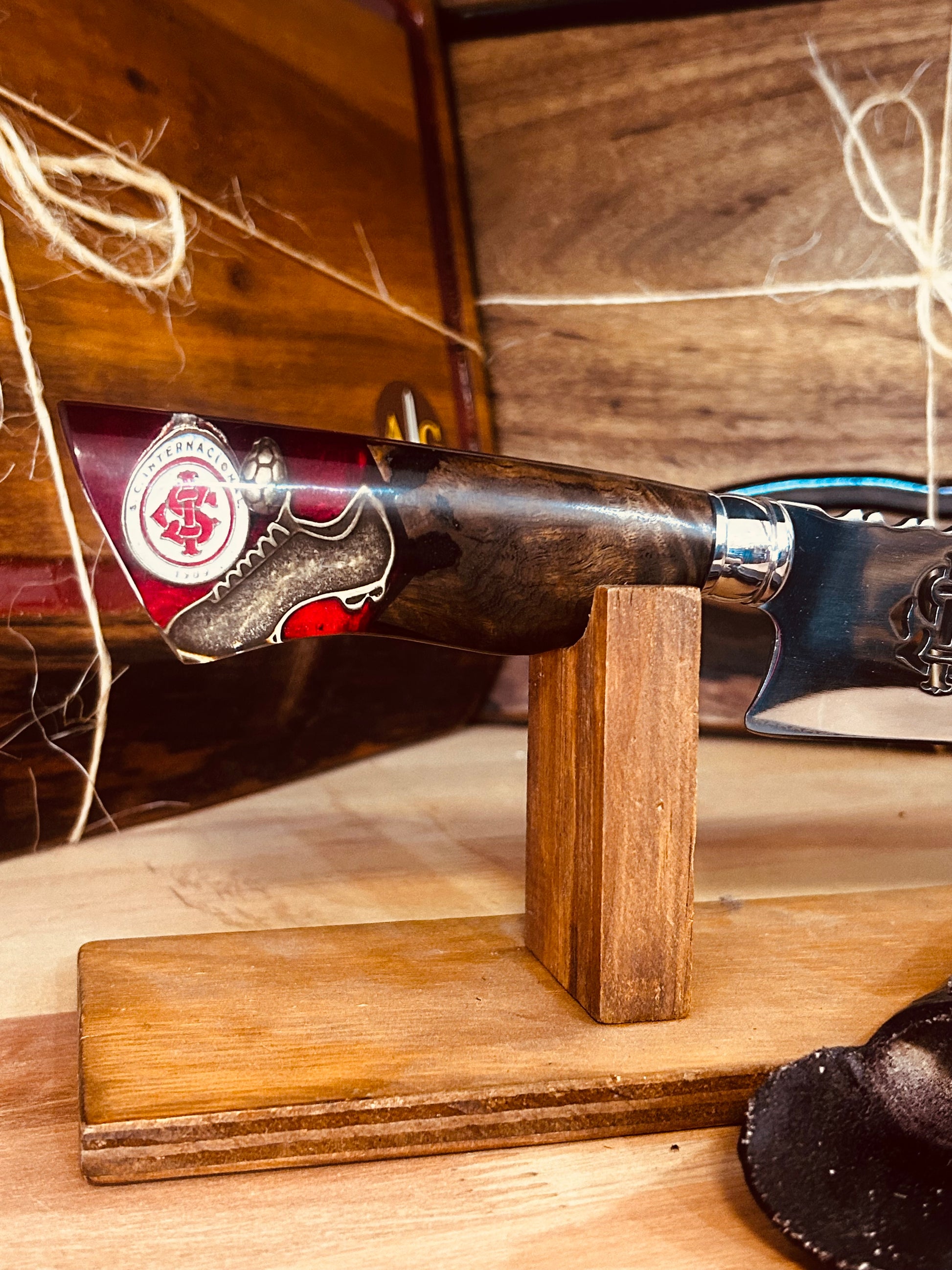 Cuchillo con mango hibrido de madera y resina epoxi, lamina en acero inoxidable. Temática deporte, Sport Club Internacional o Gremio Futbol Porto Alegrense. La lamina del cuchillo de Internacional es lisa pulida y la lamina del cuchillos de gremio esta personalizada con el calado de club.