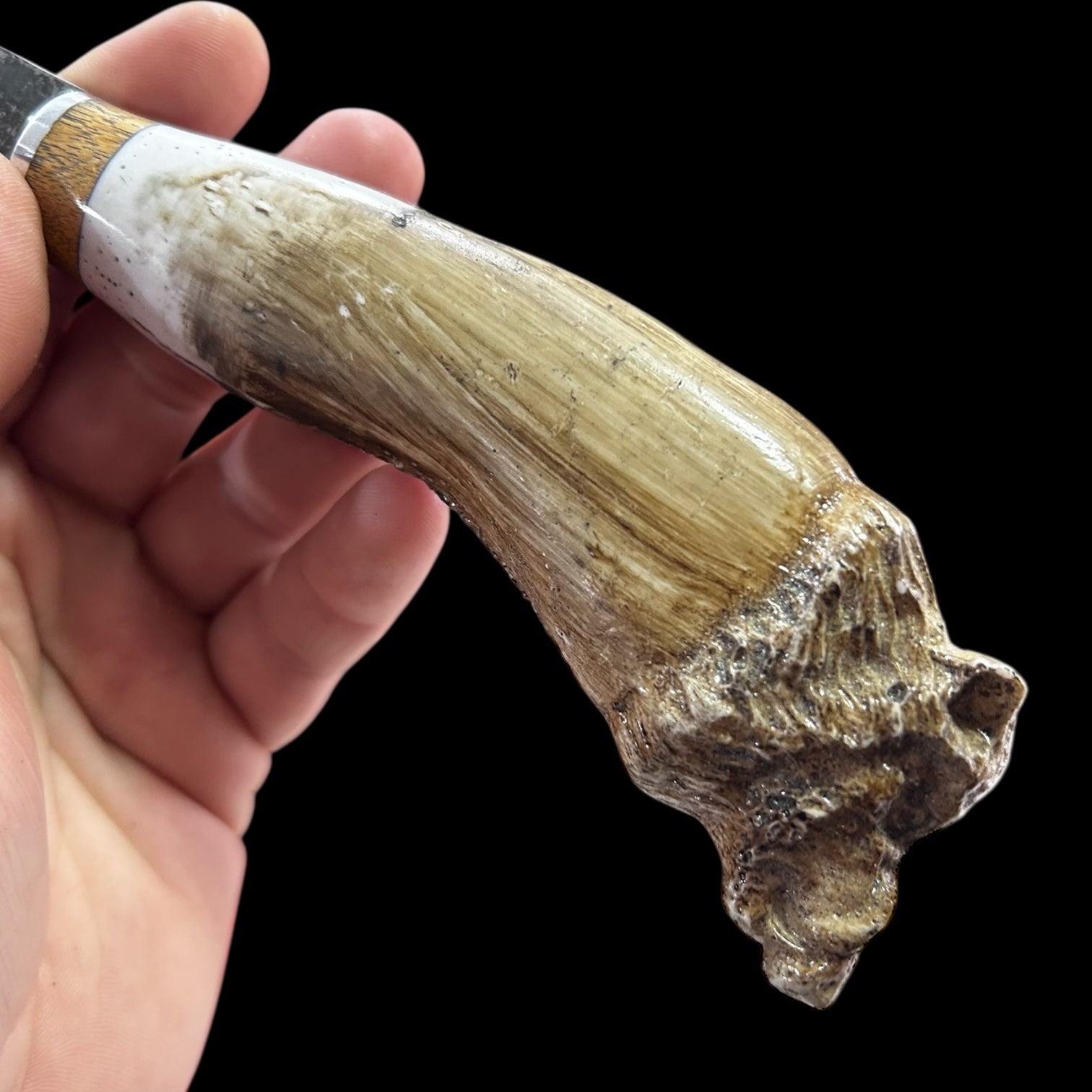 Cuchillo con mango sintético cabeza de jabali, con hoja en acero al carbono. Acompañado de su vaina.