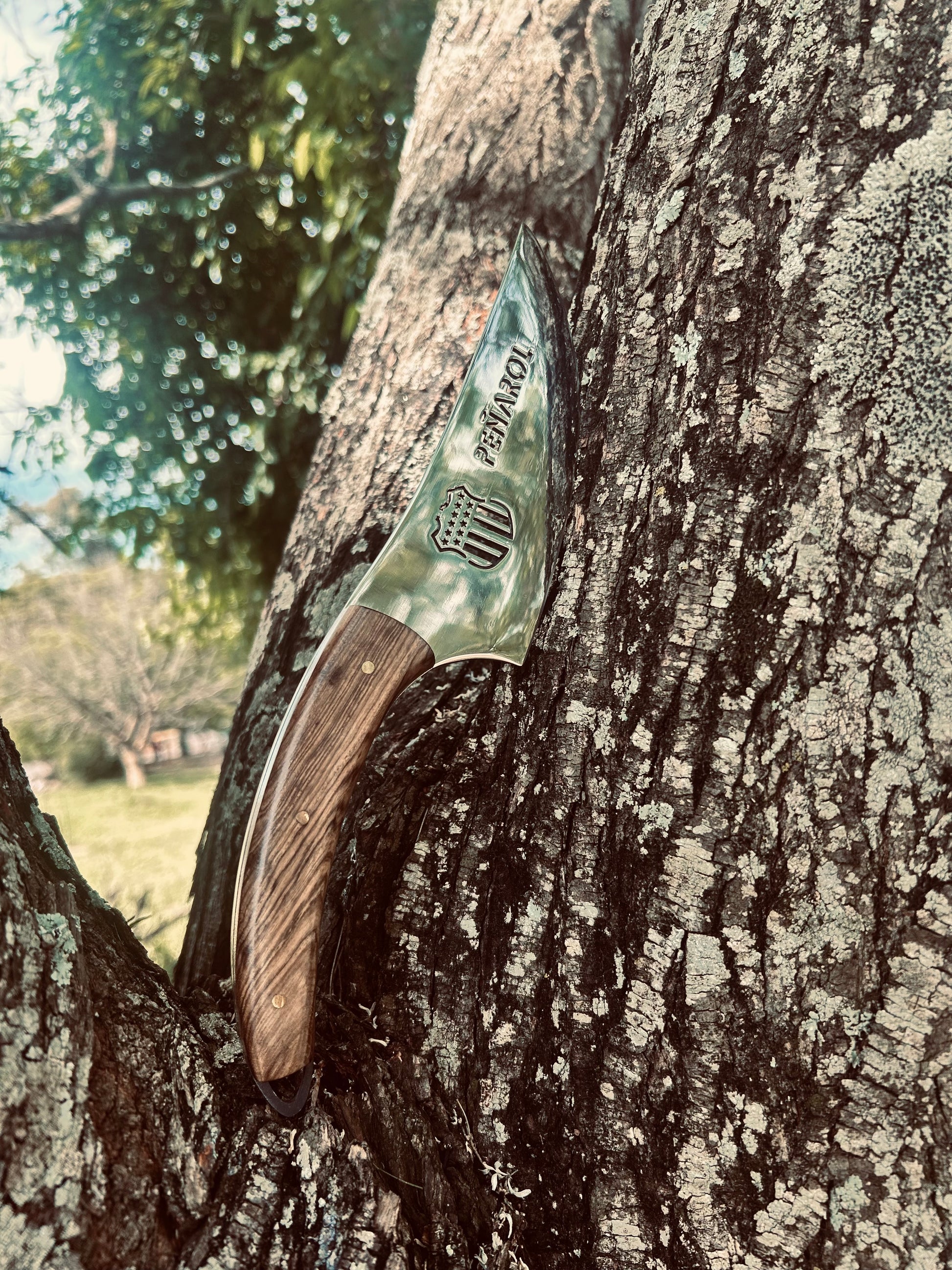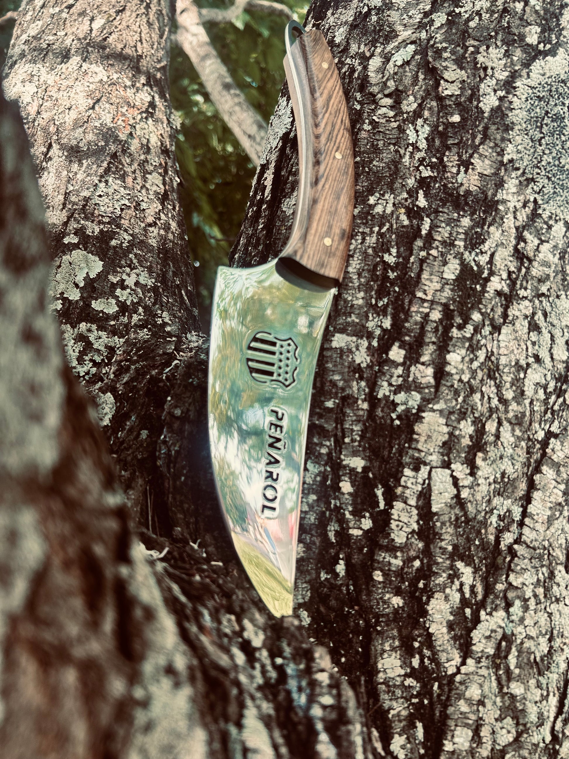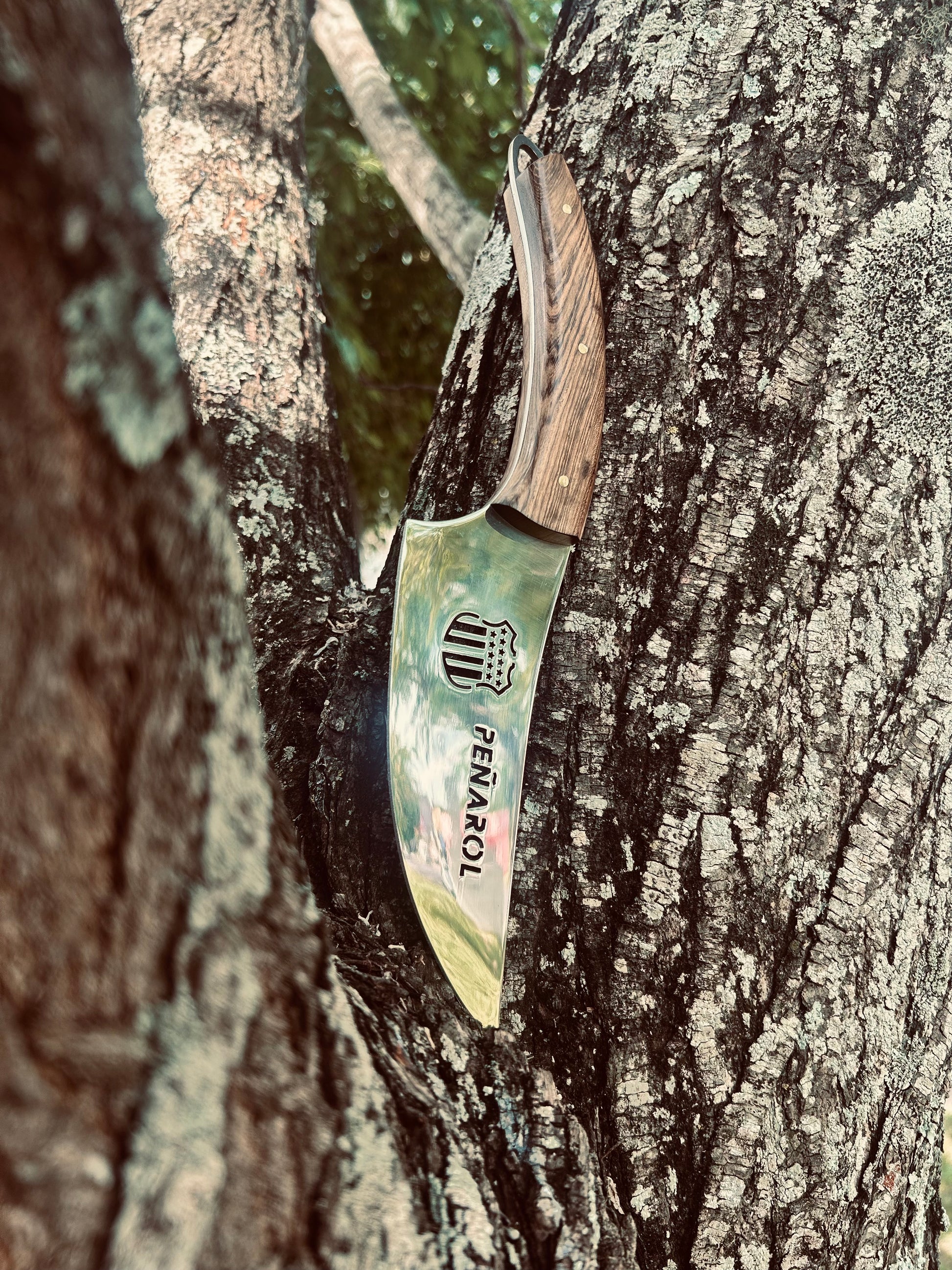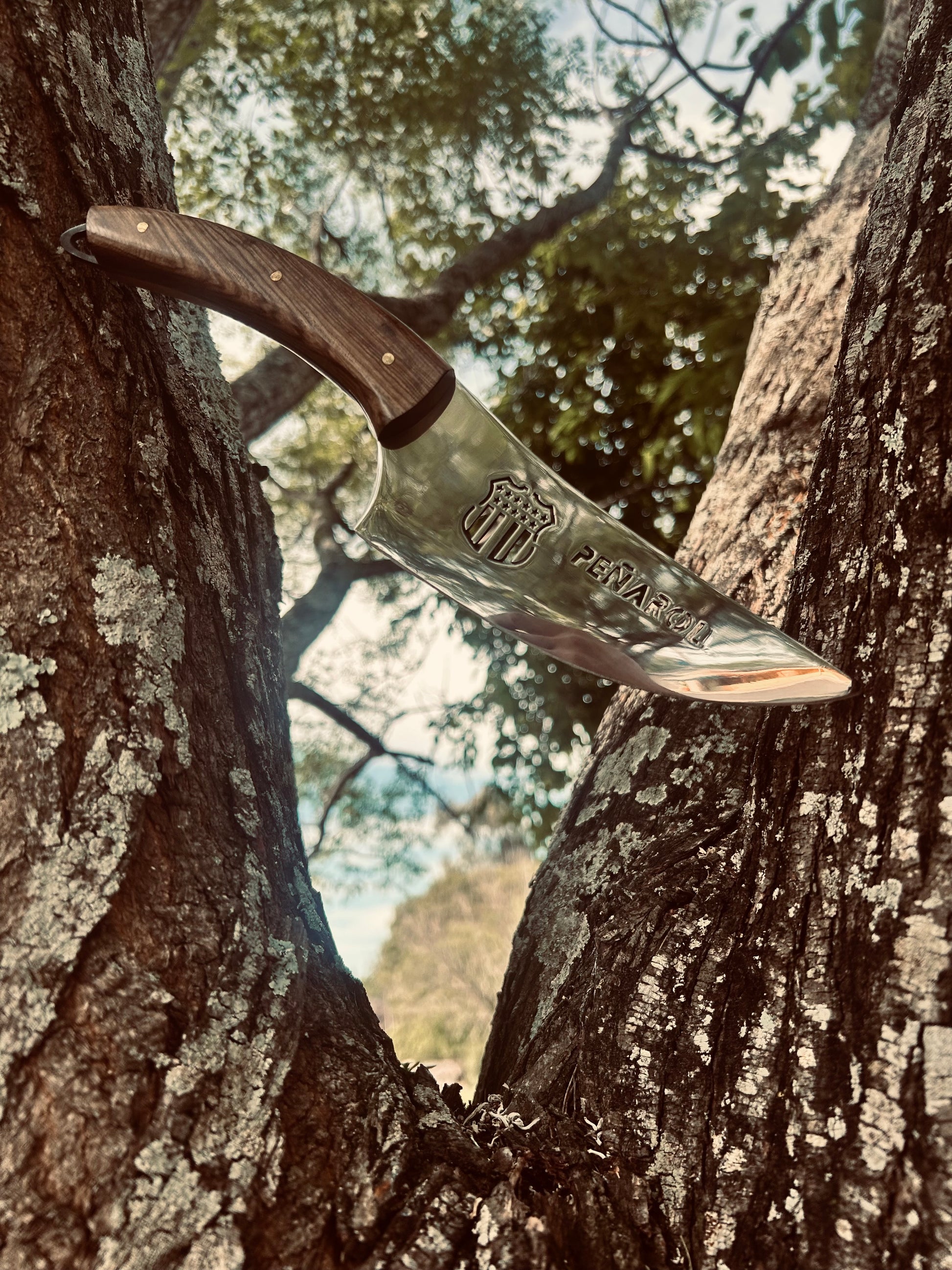 Cuchillo con mango chato en madera imbuia con botón. Hoja elaborada en acero inoxidable, acompañada de su vaina.