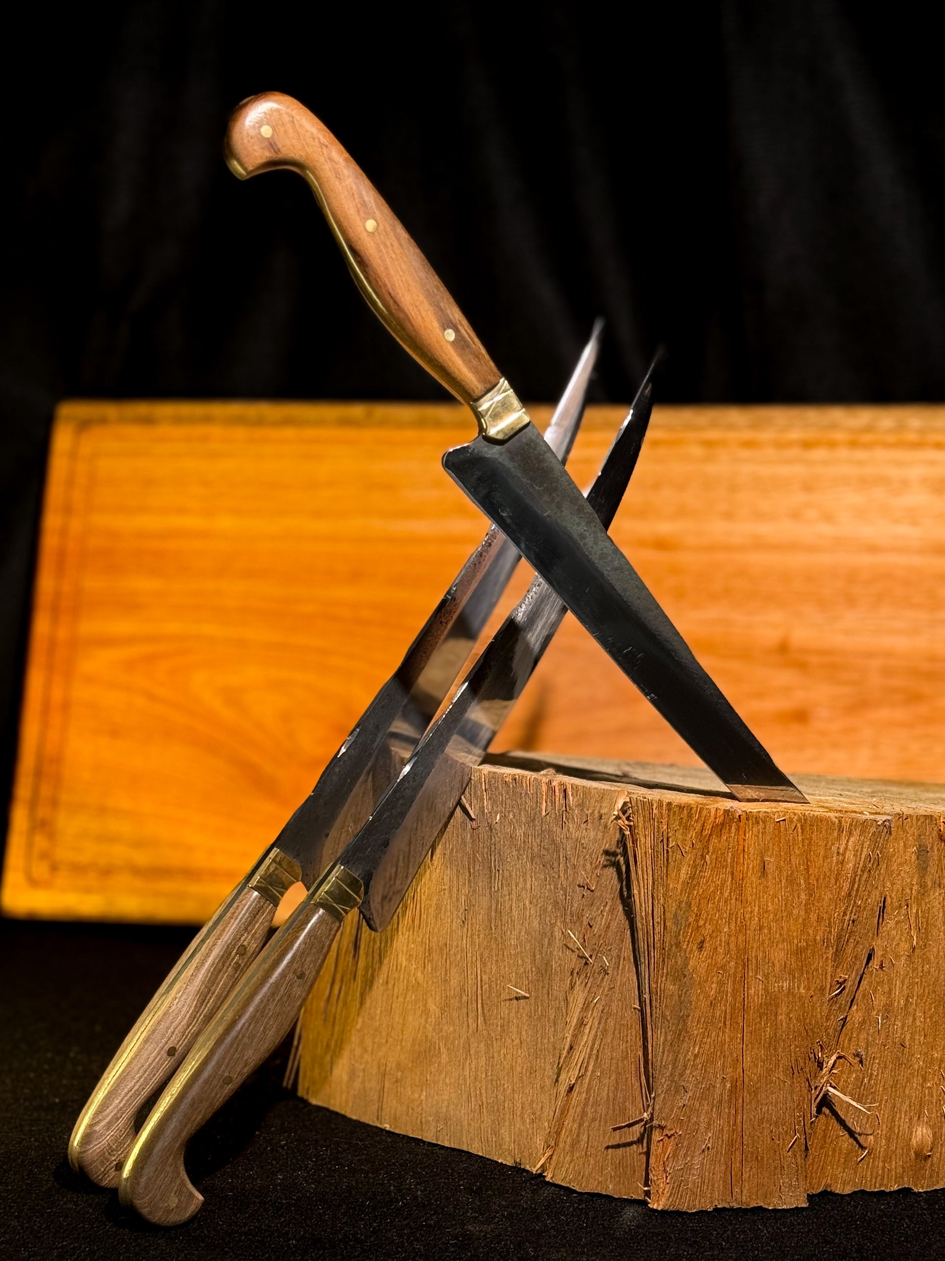 Deshuesadora Rústica con mango chato en madera, lámina enteriza de acero al carbono, con acabado rústico, con botón en bronce y acompaña vaina en cuero