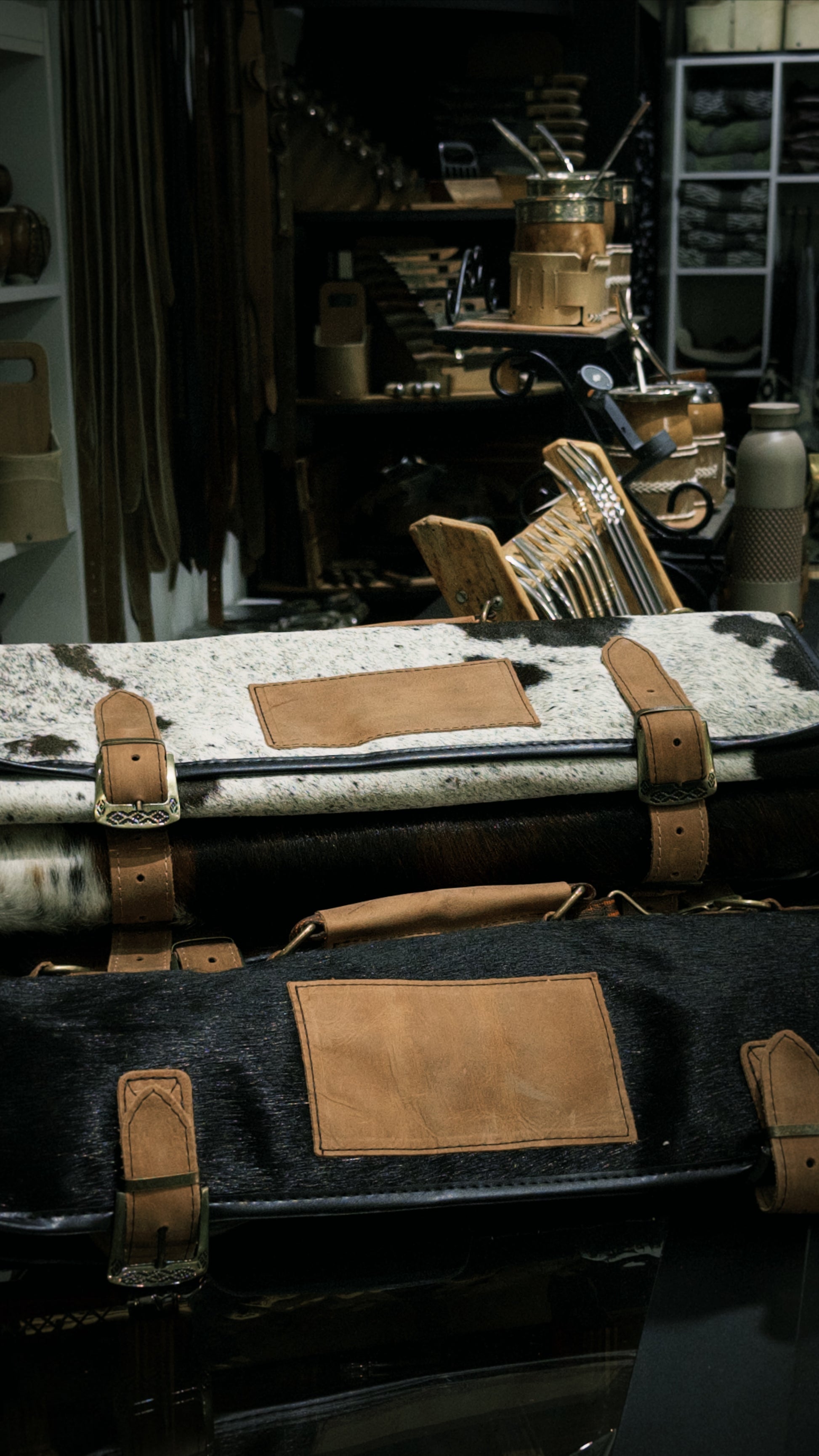 Estuche en cuero natural con pelo bovino, forrado con materiales de alta calidad para máxima protección.