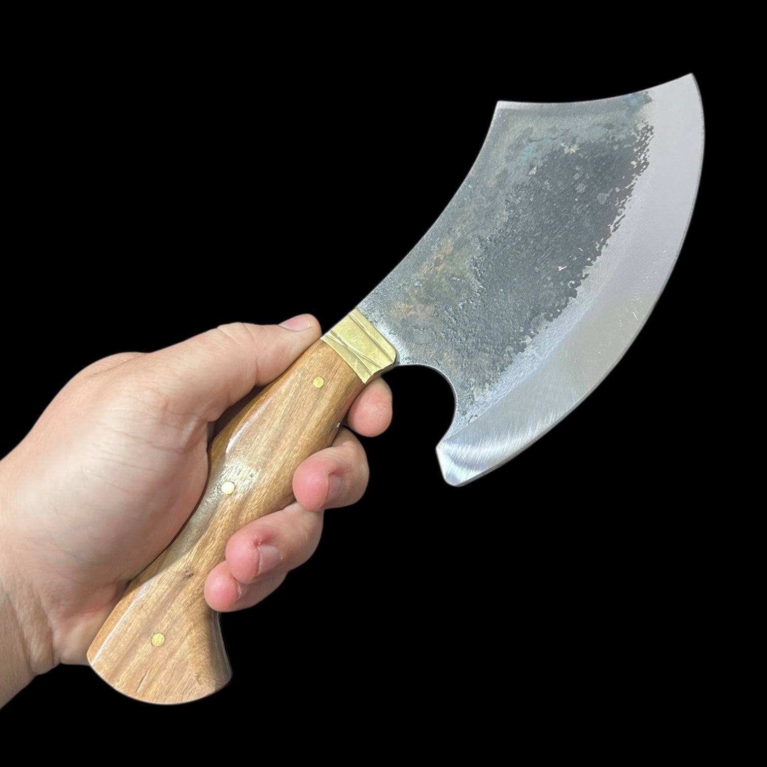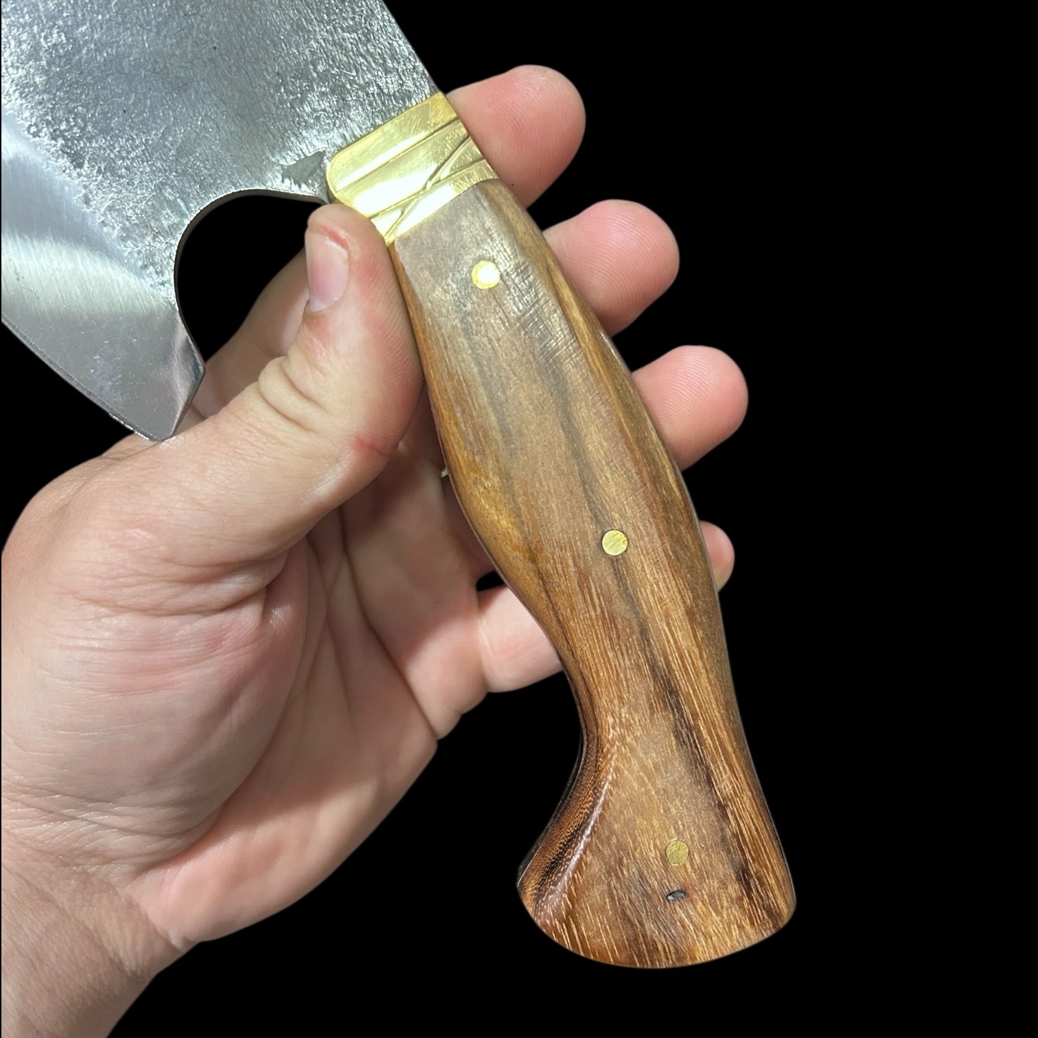 Hacha con diseño en acero carbono y con mango chato en madera. Acompaña vaina en cuero.