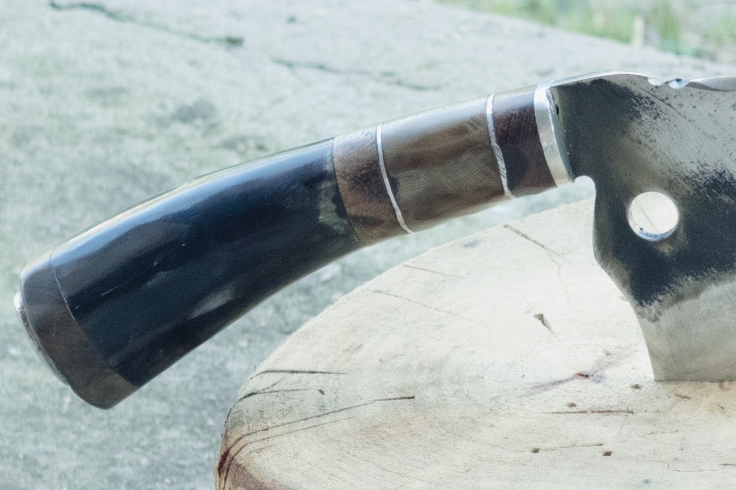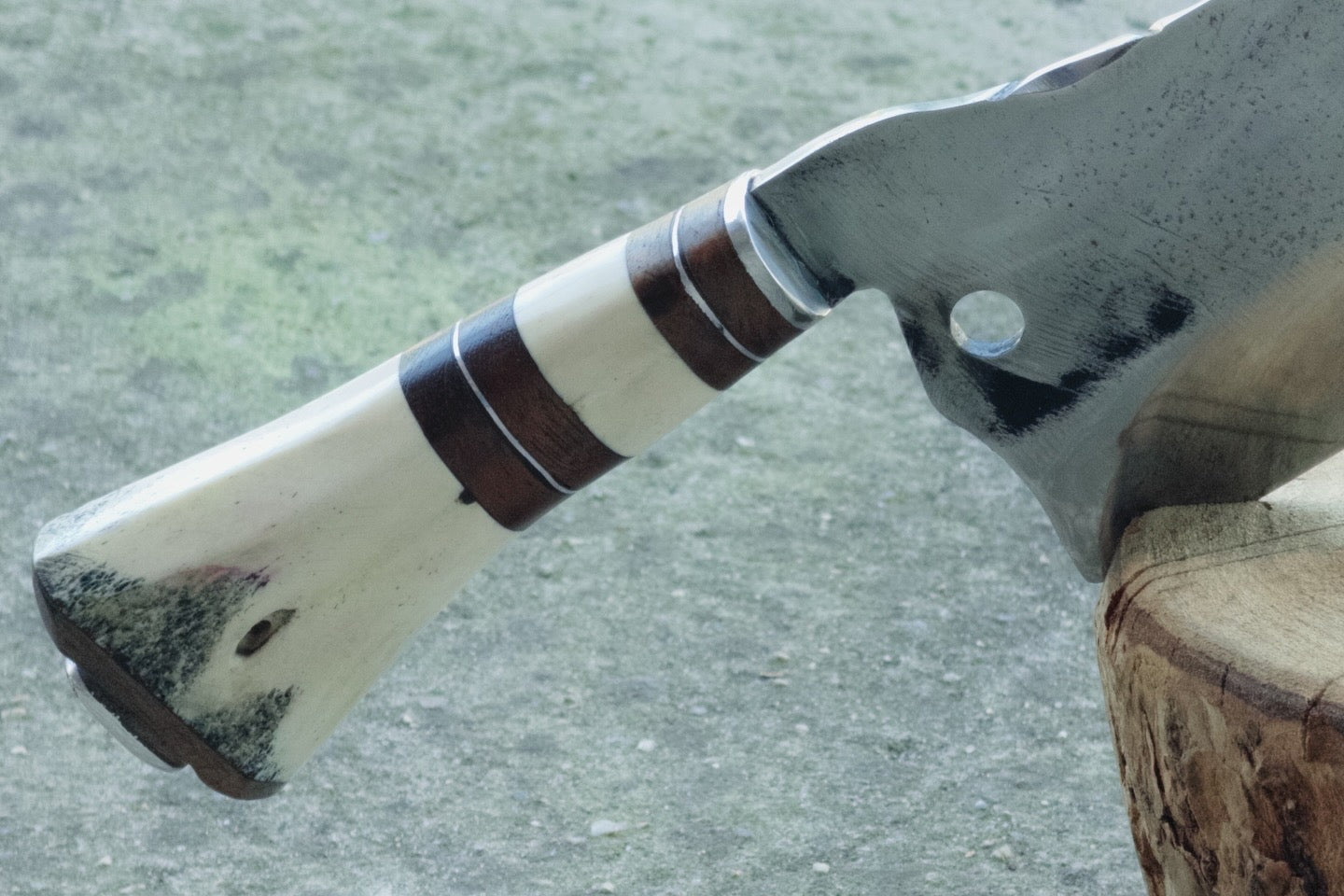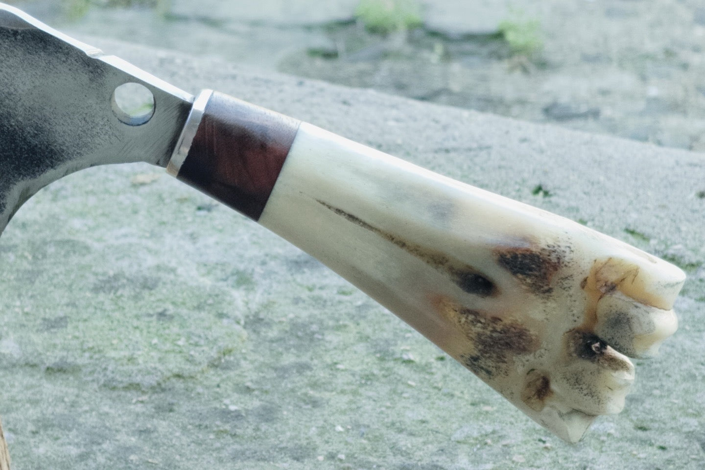 Hacha con hoja realizada a partir de disco de arado (acero al carbono), empuñadura de madera, guampa bovina o hueso.