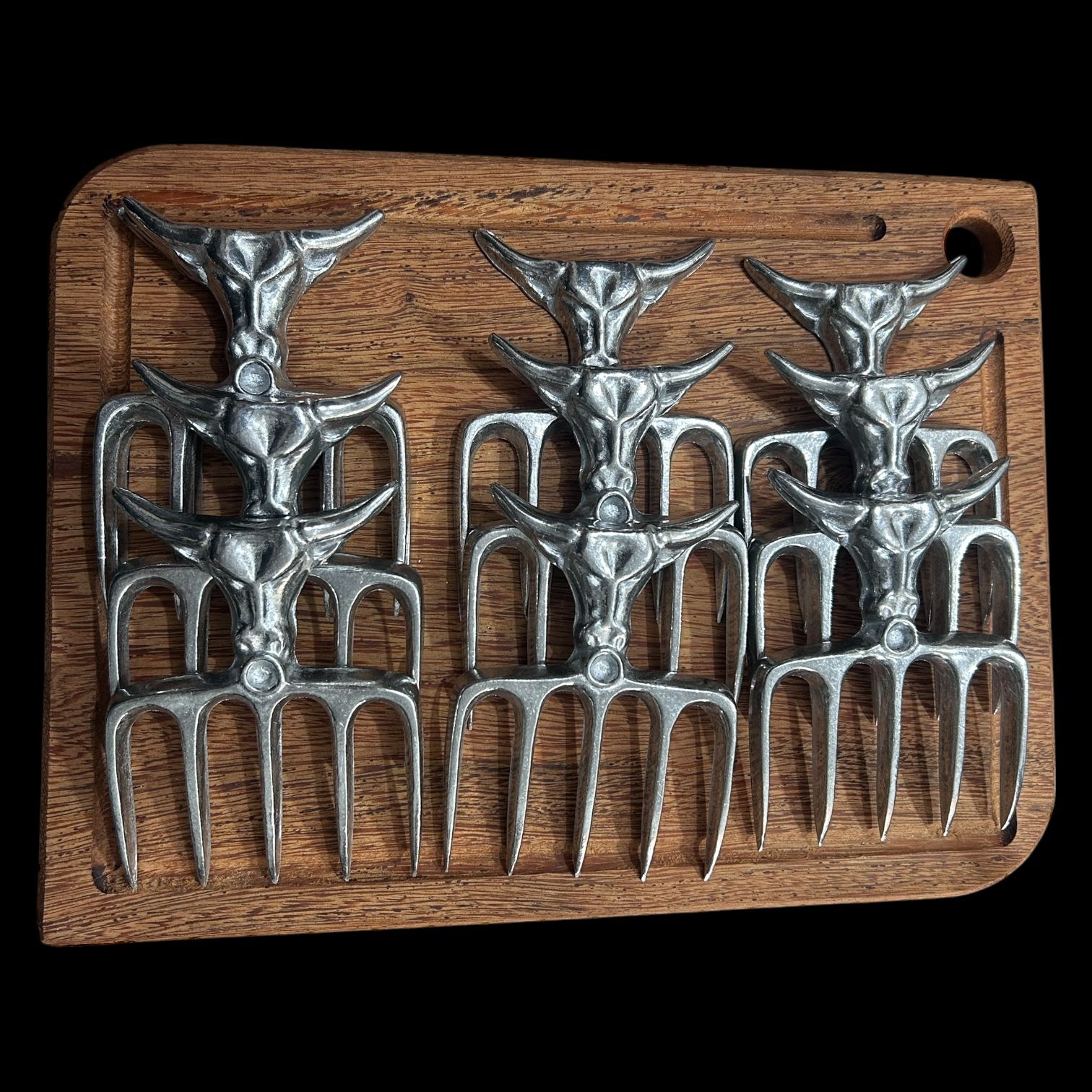 El quidente genera una mayor firmeza y seguridad en el momento de cortar la carne. En su diseño tiene una cabeza de toro, posee un agarre muy agradable y 5 pinchos bien afilados.