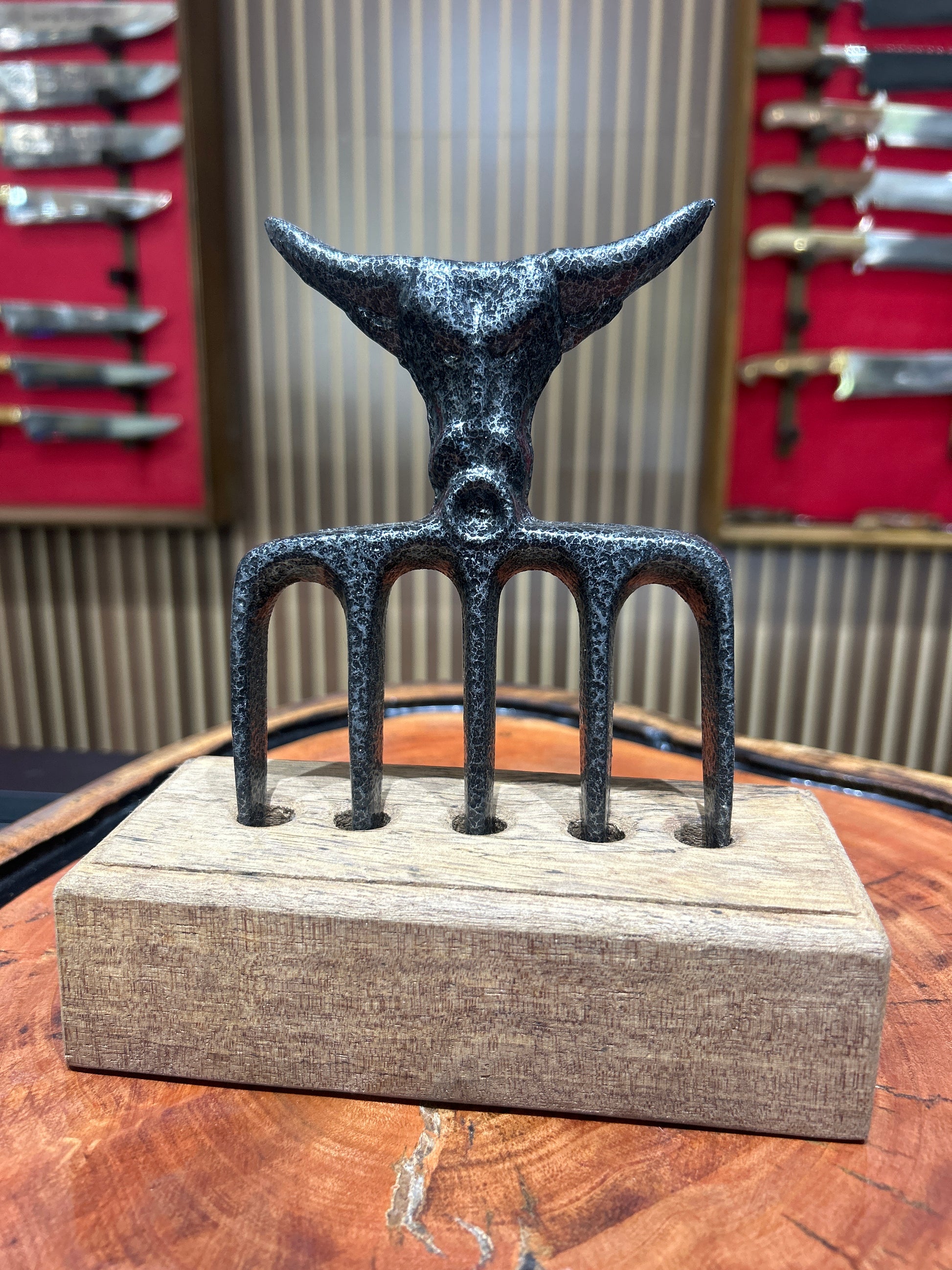 El quidente genera una mayor firmeza y seguridad en el momento de cortar la carne. En su diseño tiene una cabeza de toro, posee un agarre muy agradable y 5 pinchos bien afilados. Acompaña base en madera cedro con grabado a elección.