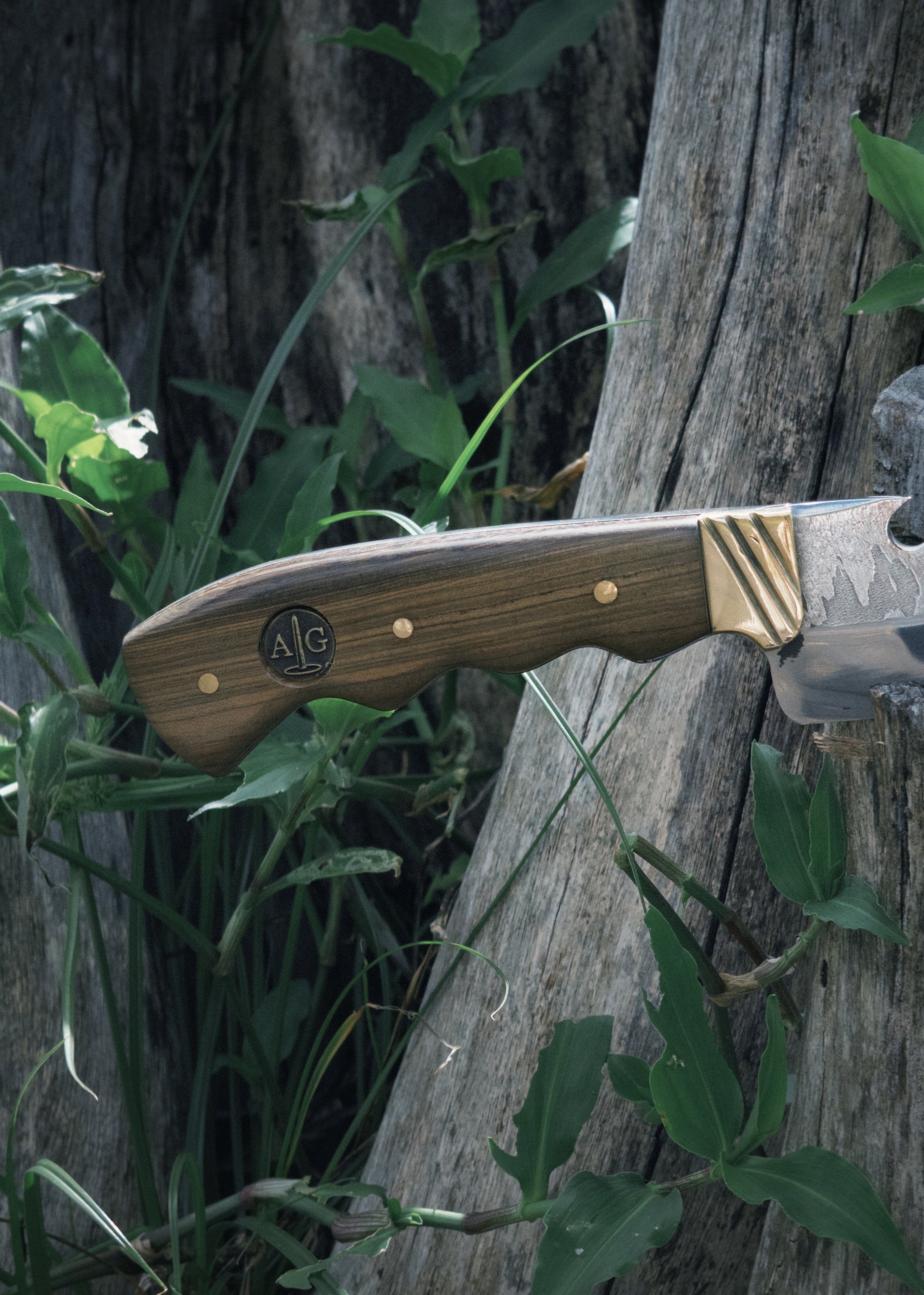 Cuchillo Bowie con mango chato en madera con boton en bronce y pin colección AyG. Hoja elaborada en acero al carbono de 8 mm de espesor, acompañado de su vaina.