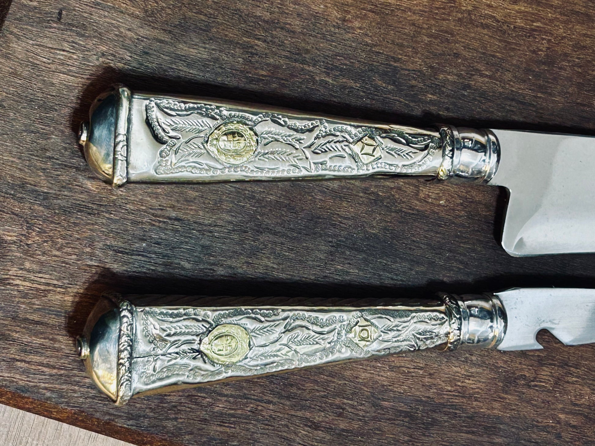 Cuchillo y pincho con mango de alpaca y bronce y hoja en acero inoxidable templada y con un filo apuradísimo. Acompaña vaina en cuero.