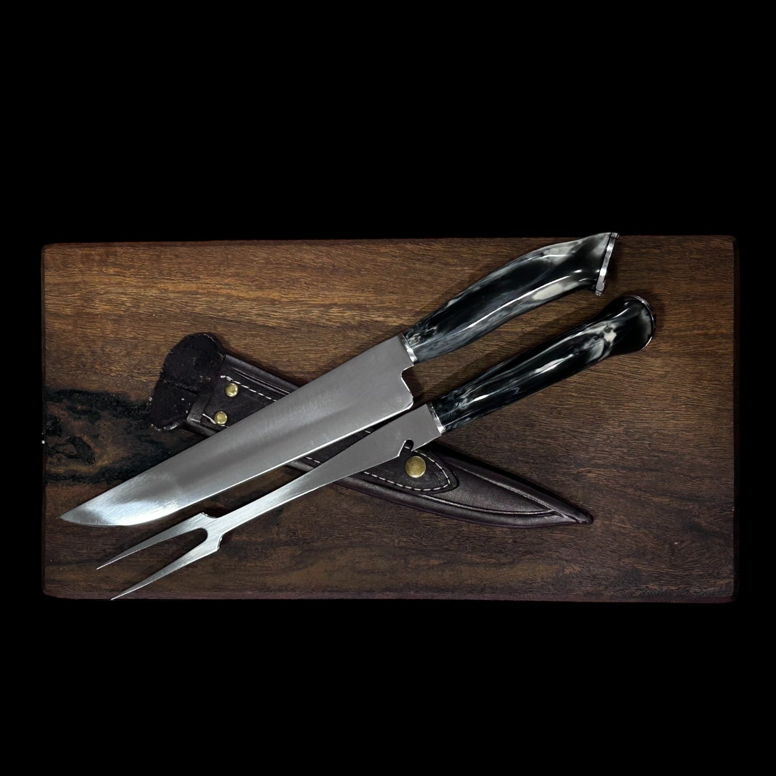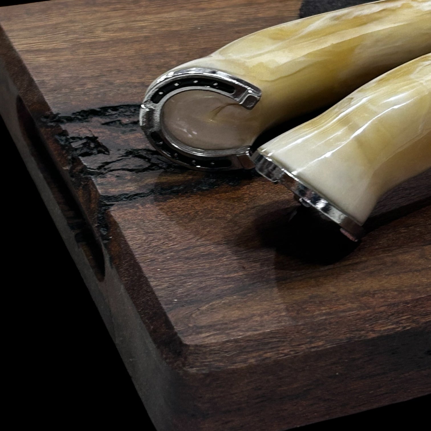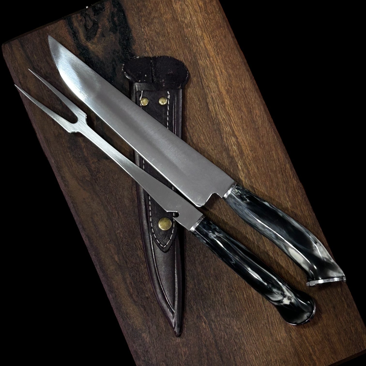 El Conjunto Set Herradura incluye un cuchillo y pincho con mango en resina, corona de herradura y hoja en acero inoxidable, junto con una vaina en cuero. Con una hoja de 23 cm de largo y una longitud total de 35 cm, este conjunto es ideal para tareas culinarias y ofrece durabilidad y un diseño único gracias a su herradura adornada.