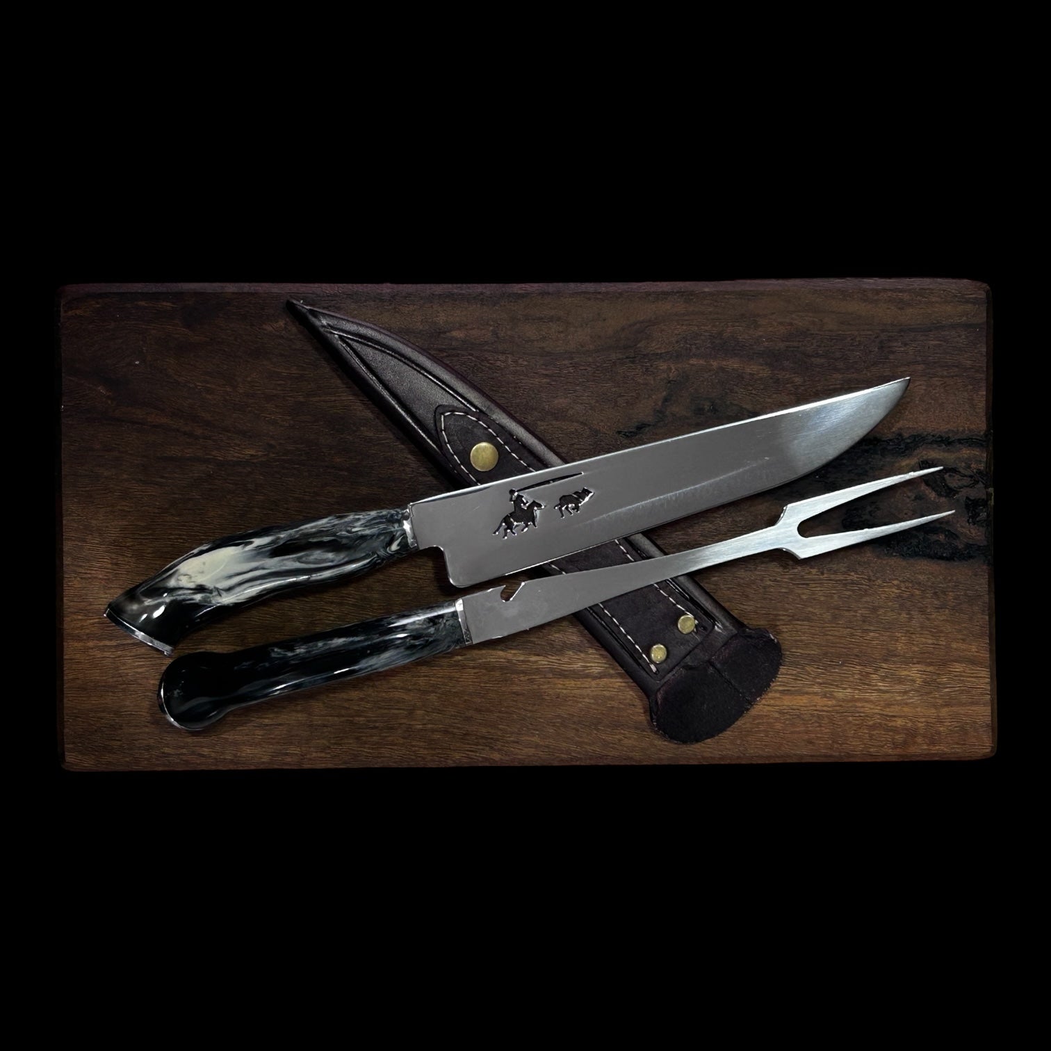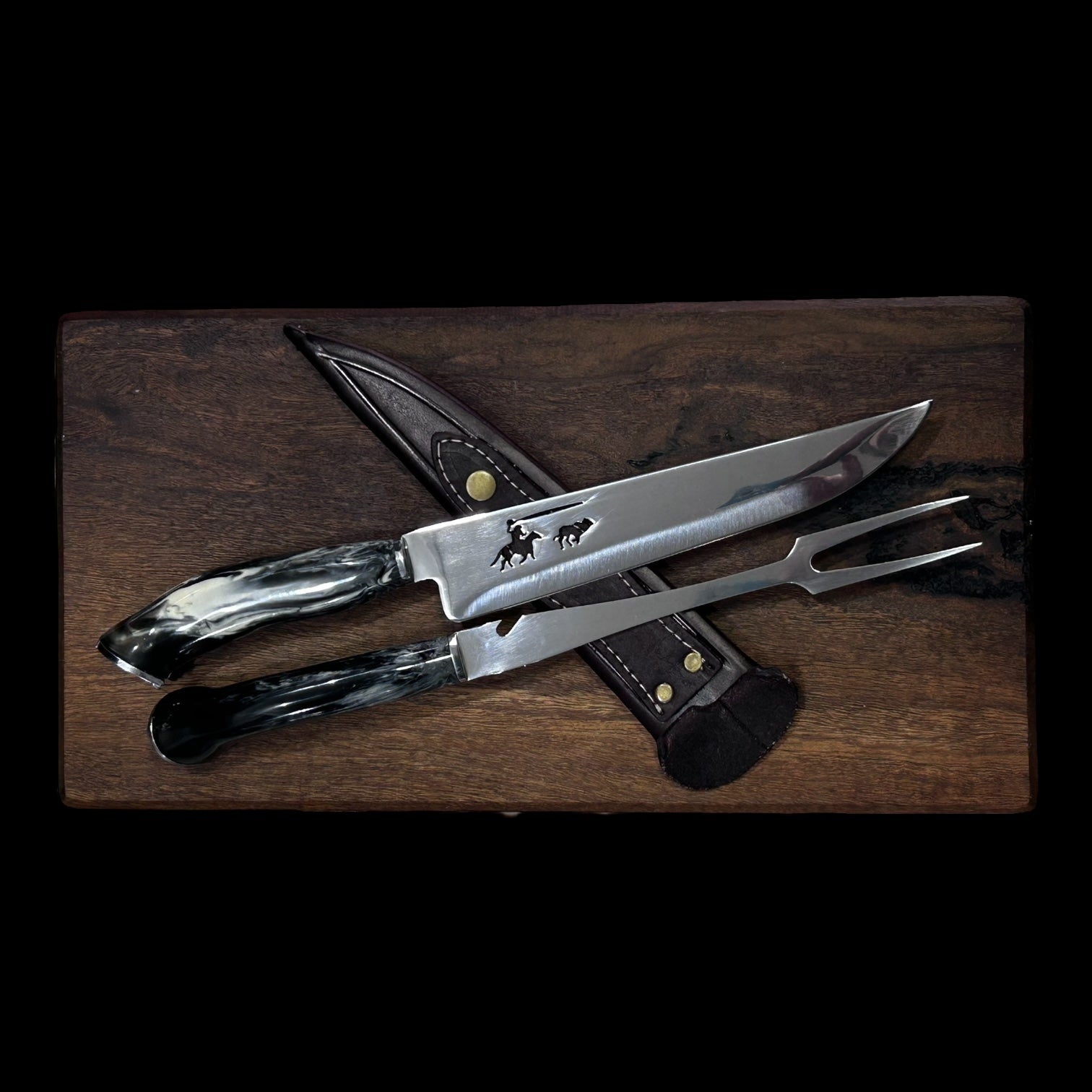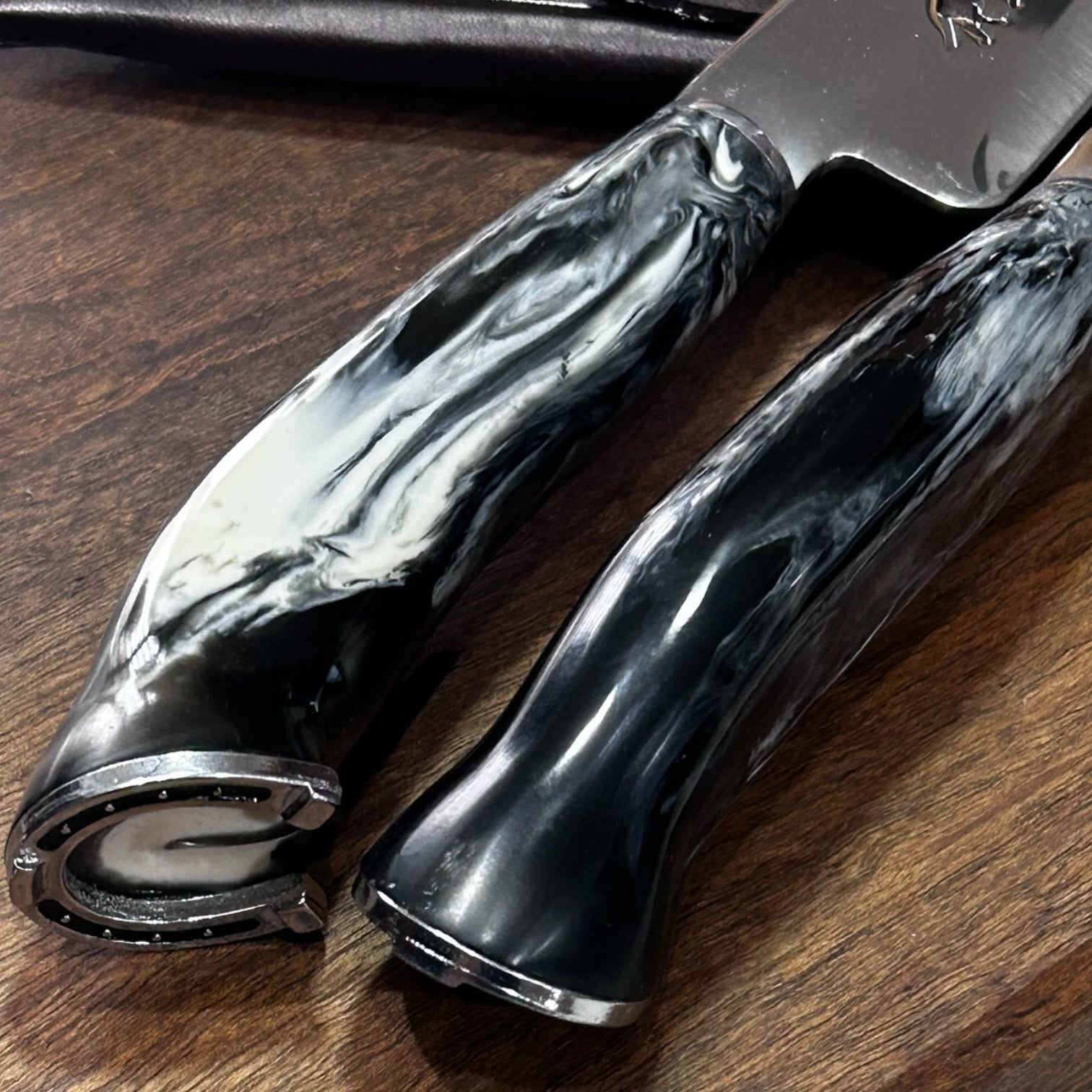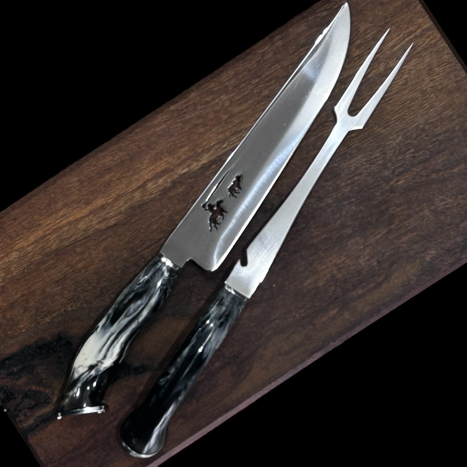 El Conjunto Set Herradura Lazador incluye un cuchillo y pincho con mango en resina, corona de herradura y hoja en acero inoxidable con calado de lazador, junto con una vaina en cuero. Con una hoja de 23 cm de largo y una longitud total de 35 cm, este conjunto es ideal para tareas culinarias y ofrece durabilidad y un diseño único gracias a su herradura adornada.