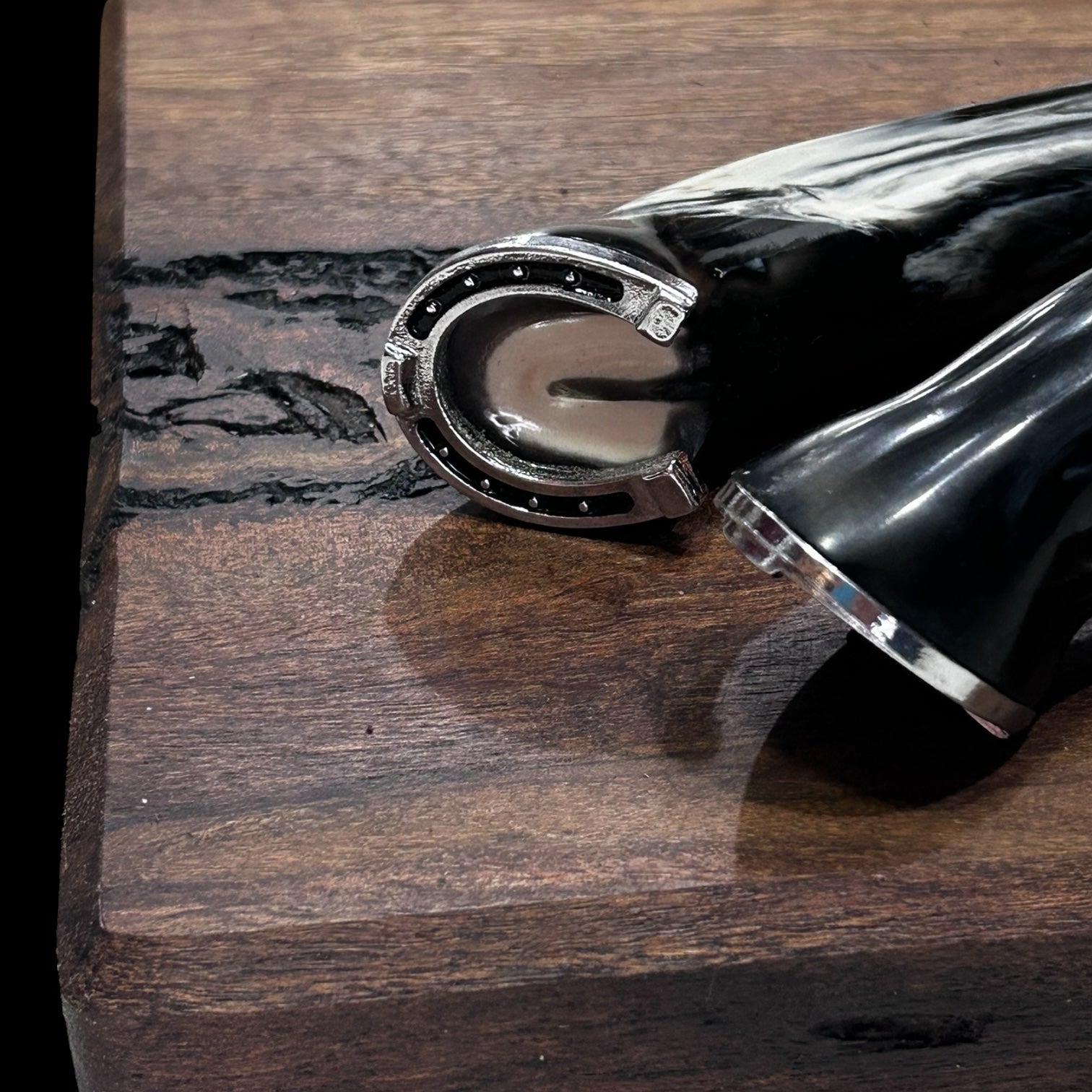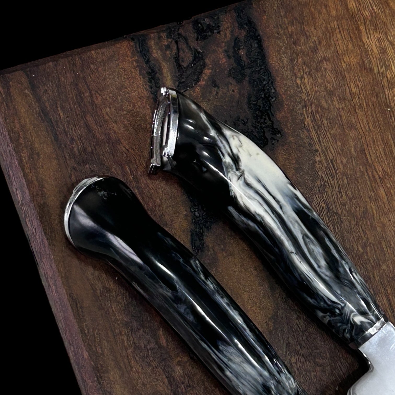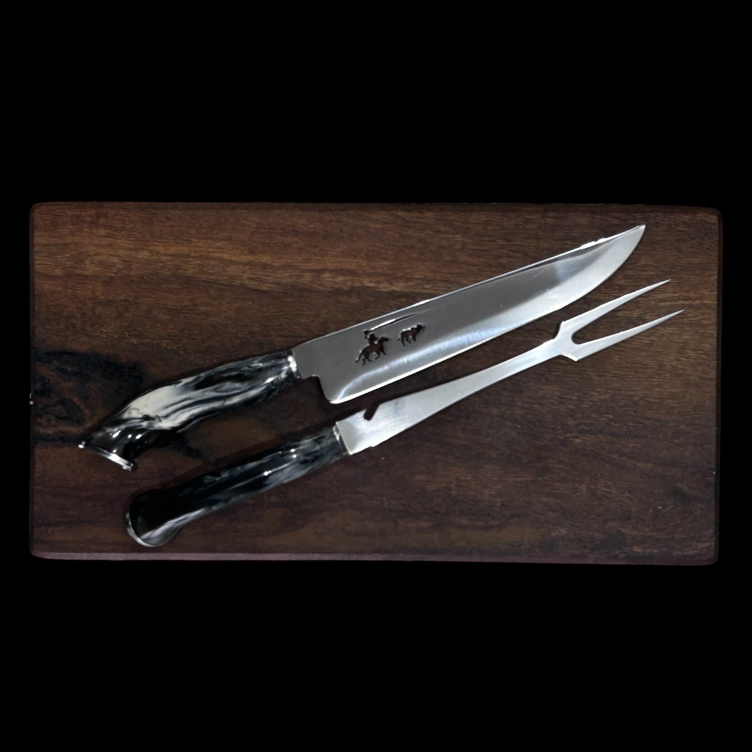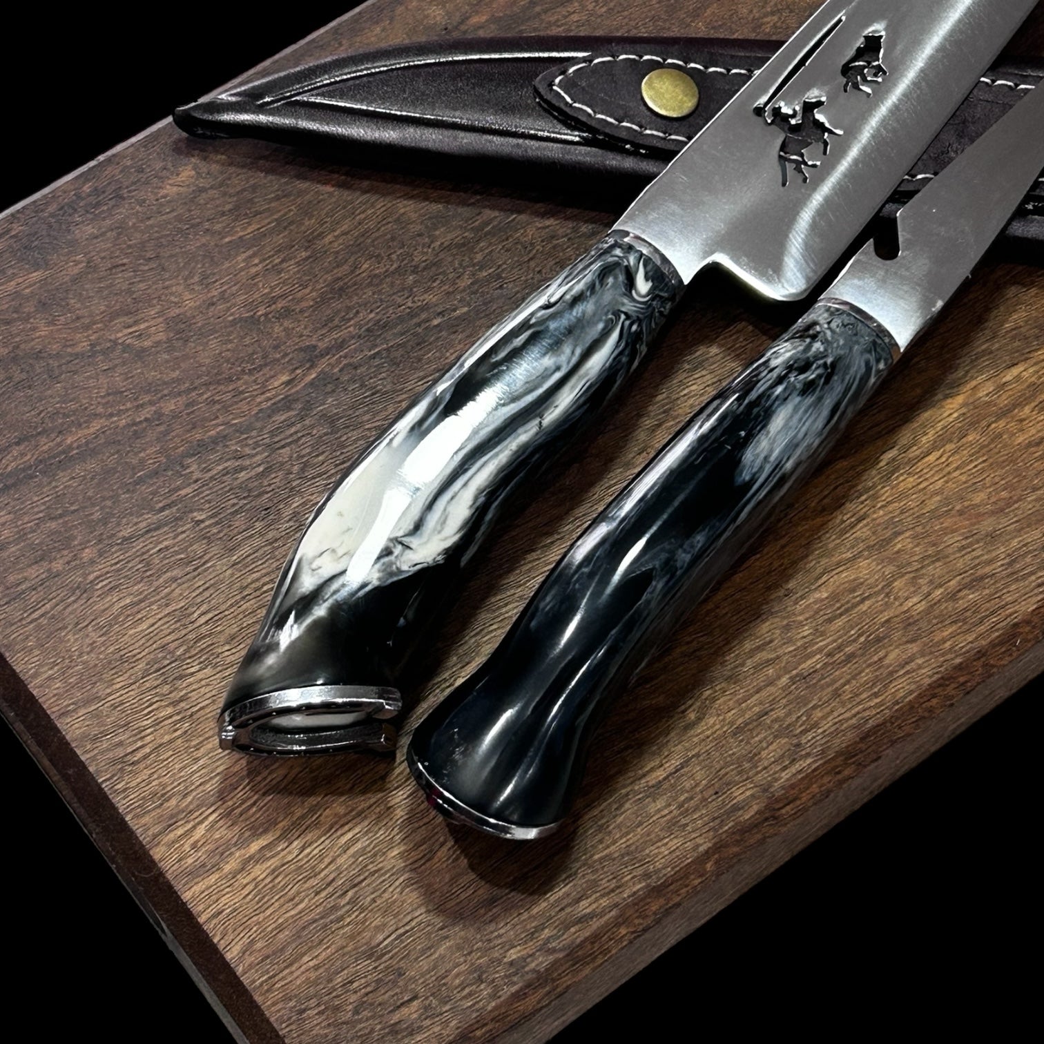 El Conjunto Set Herradura Lazador incluye un cuchillo y pincho con mango en resina, corona de herradura y hoja en acero inoxidable con calado de lazador, junto con una vaina en cuero. Con una hoja de 23 cm de largo y una longitud total de 35 cm, este conjunto es ideal para tareas culinarias y ofrece durabilidad y un diseño único gracias a su herradura adornada.