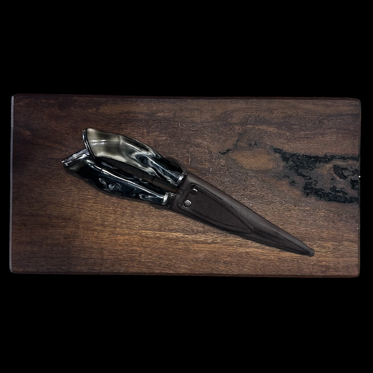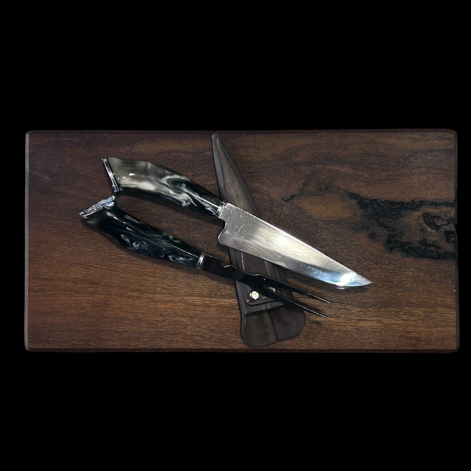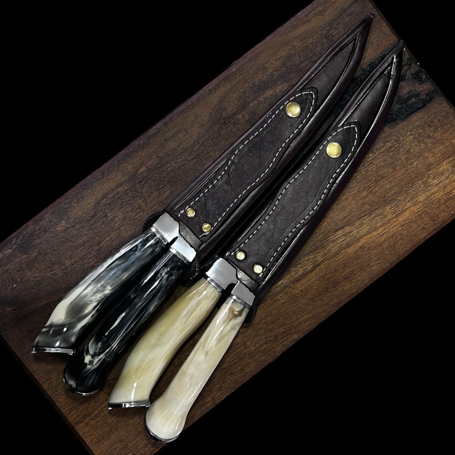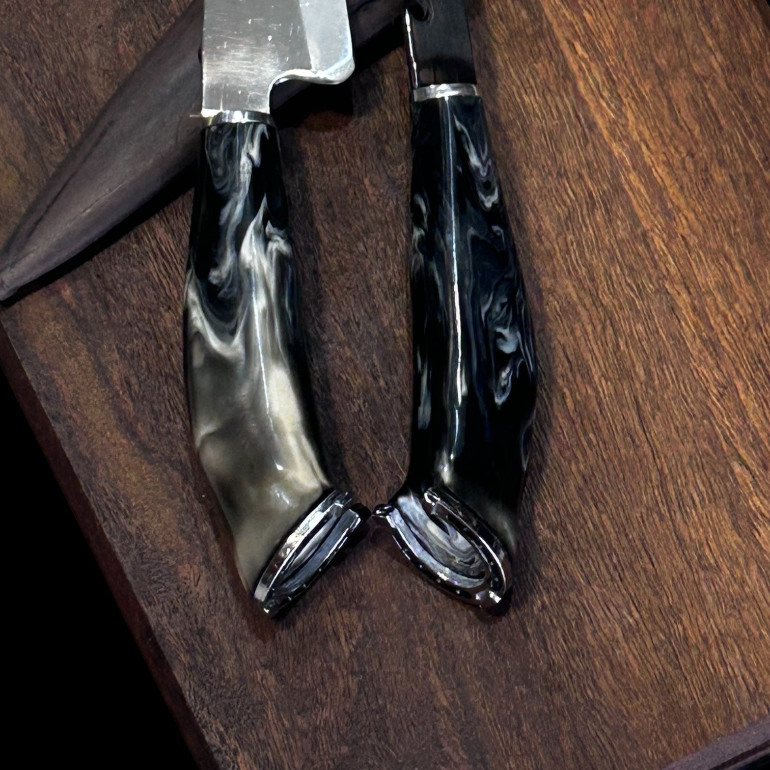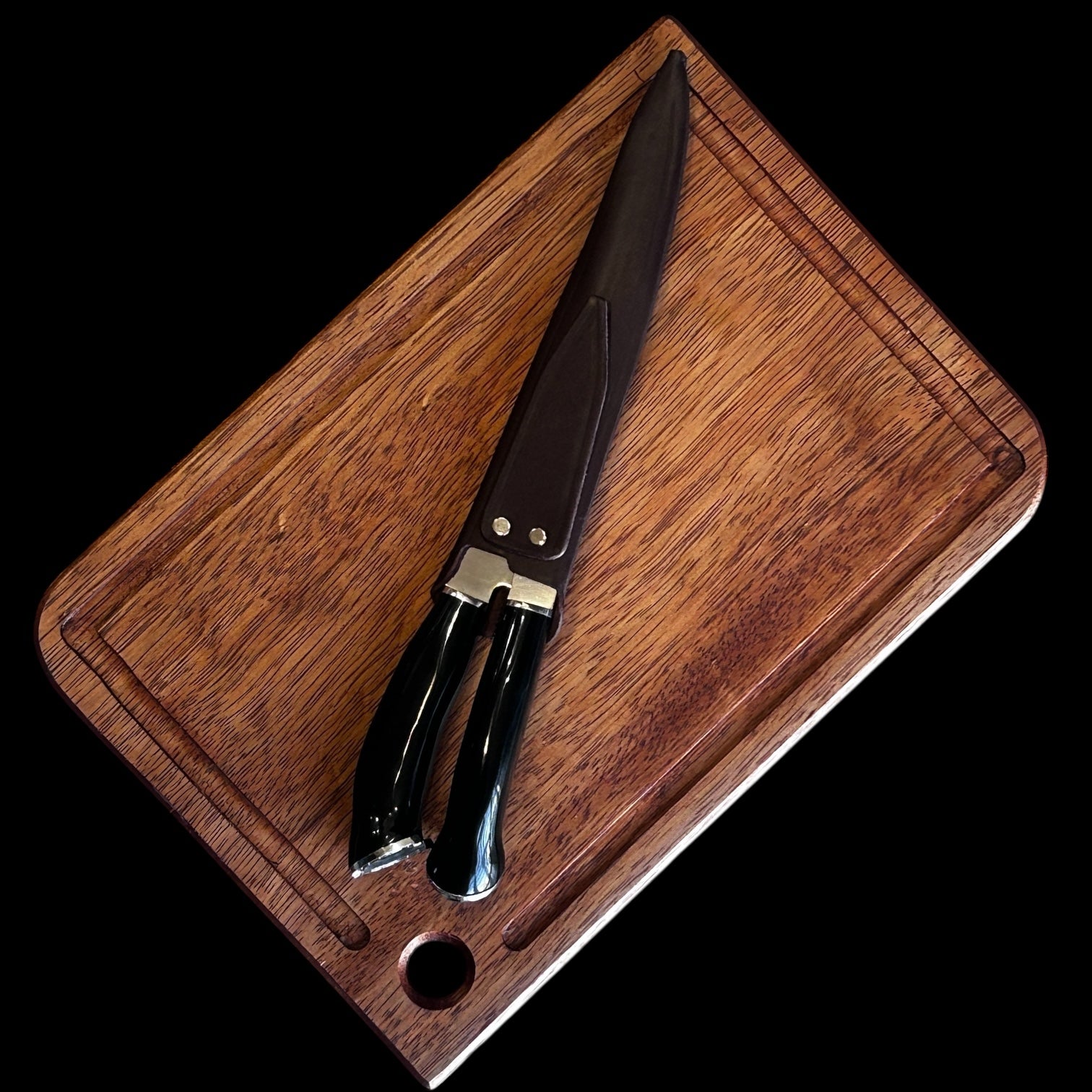 El Conjunto Set Herradura incluye un cuchillo y pincho con mango en resina, corona de herradura y hoja en acero inoxidable, junto con una vaina en cuero. Con una hoja de 16 cm de largo y una longitud total de 28 cm, este conjunto es ideal para tareas culinarias y ofrece durabilidad y un diseño único gracias a su herradura adornada.
