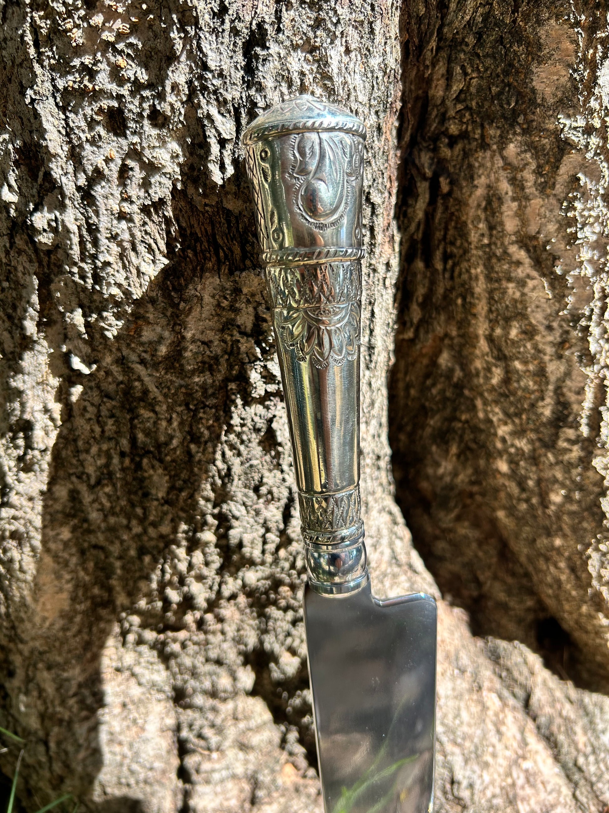 Faca com cabo em alpaca e latão e lâmina em aço inoxidável temperado com fio extremamente afiado. Acompanha bainha de couro.
