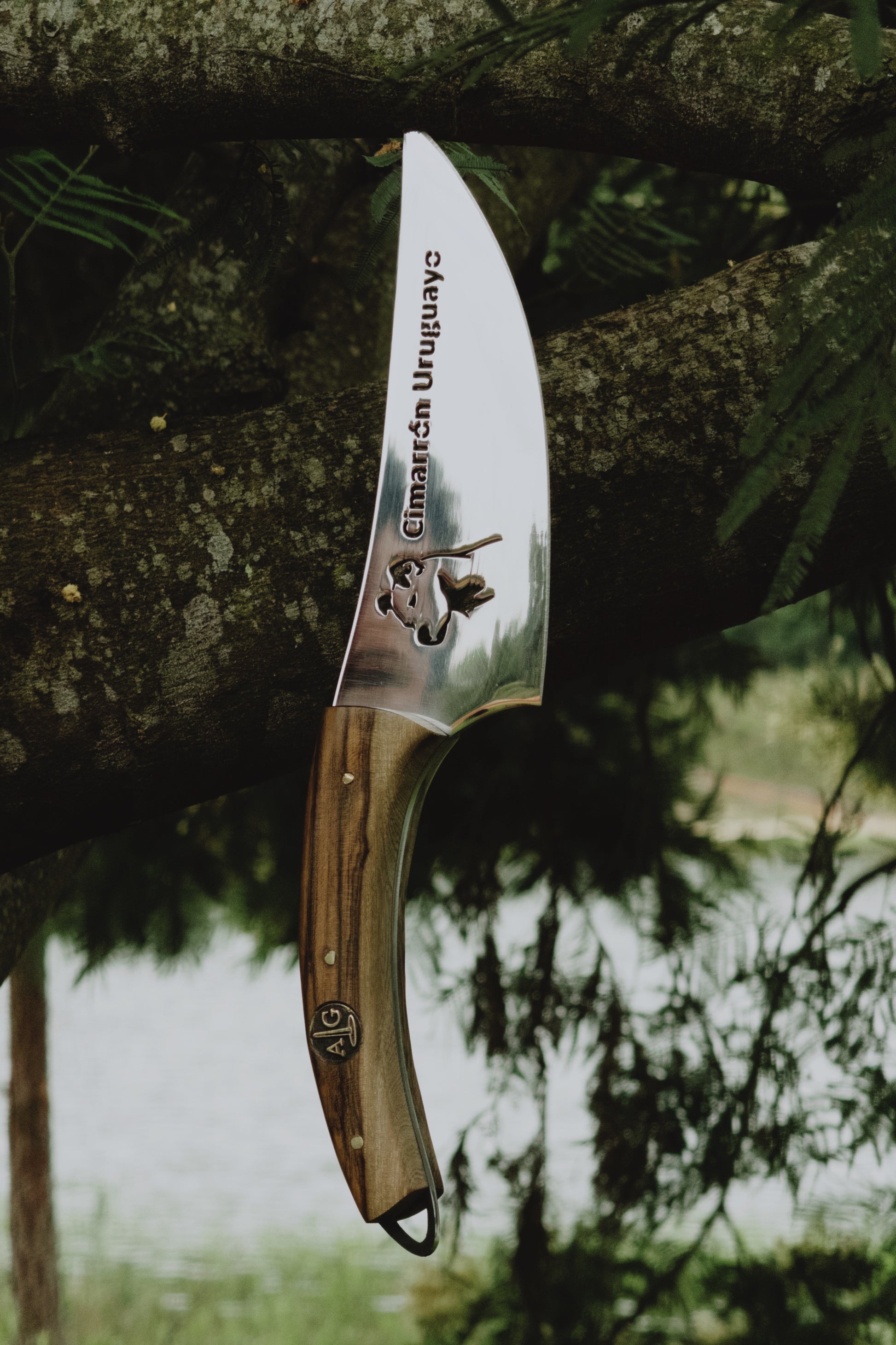 Facon con mango chato en madera imbuia con boton. Hoja elaborada en acero inoxidable, acompañado de su vaina.