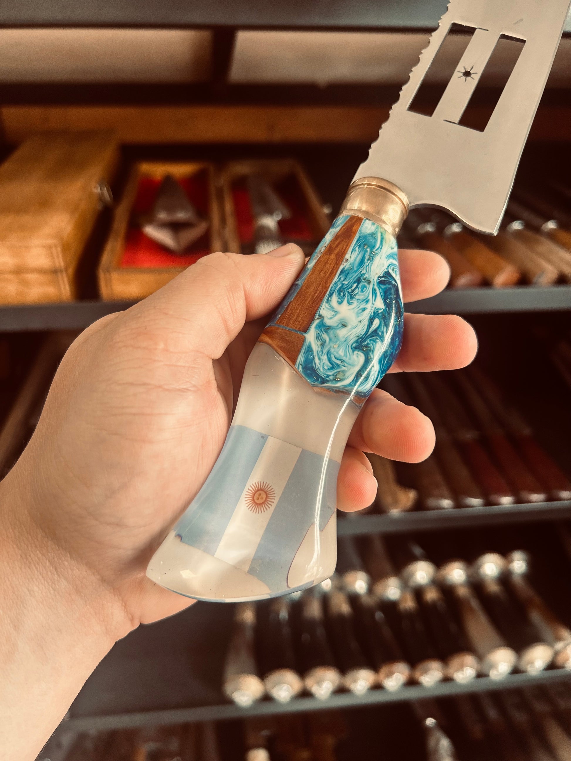 Cuchillo con mango en resina y hoja en acero inoxidable tematizado de Argentina.