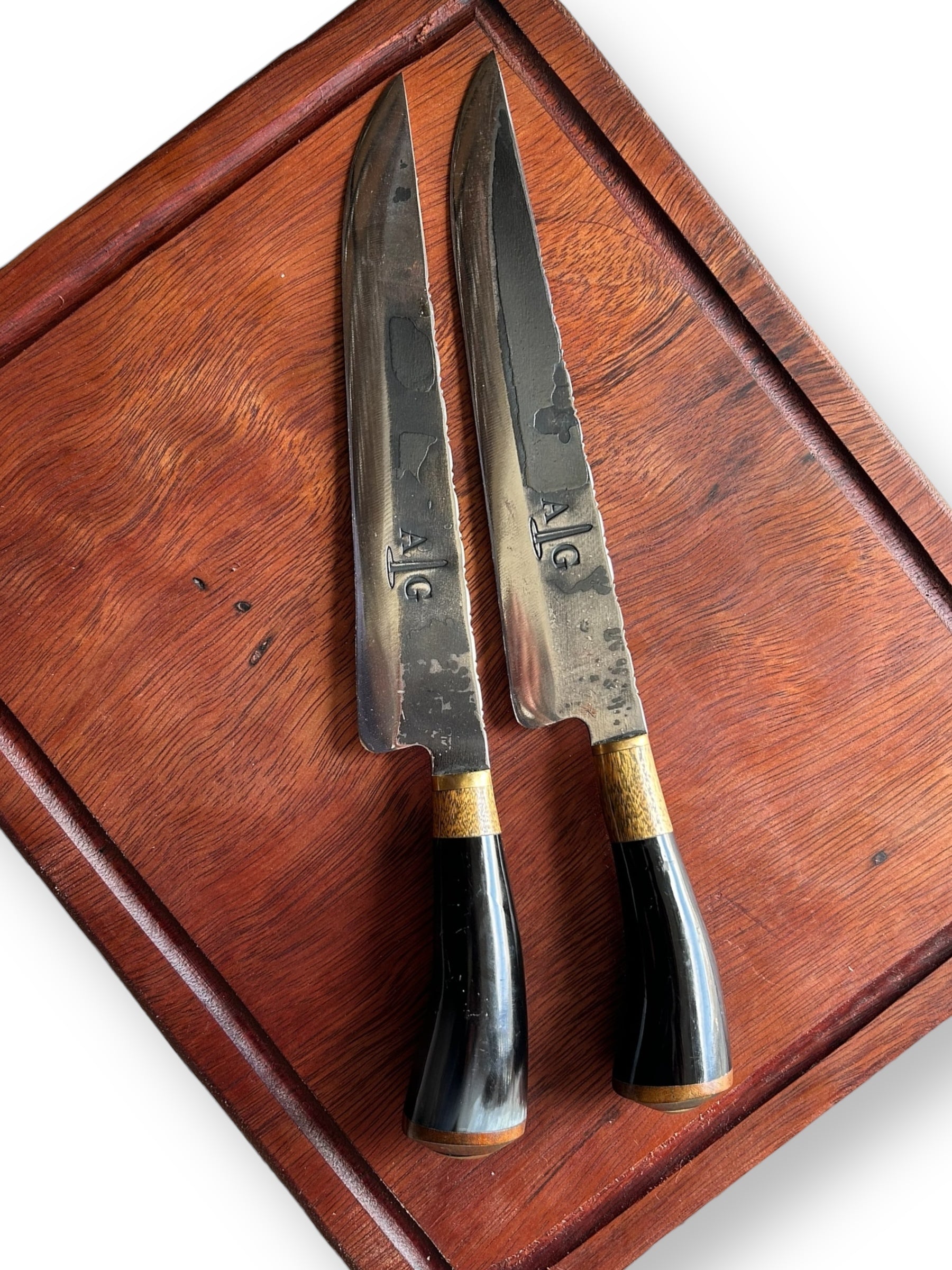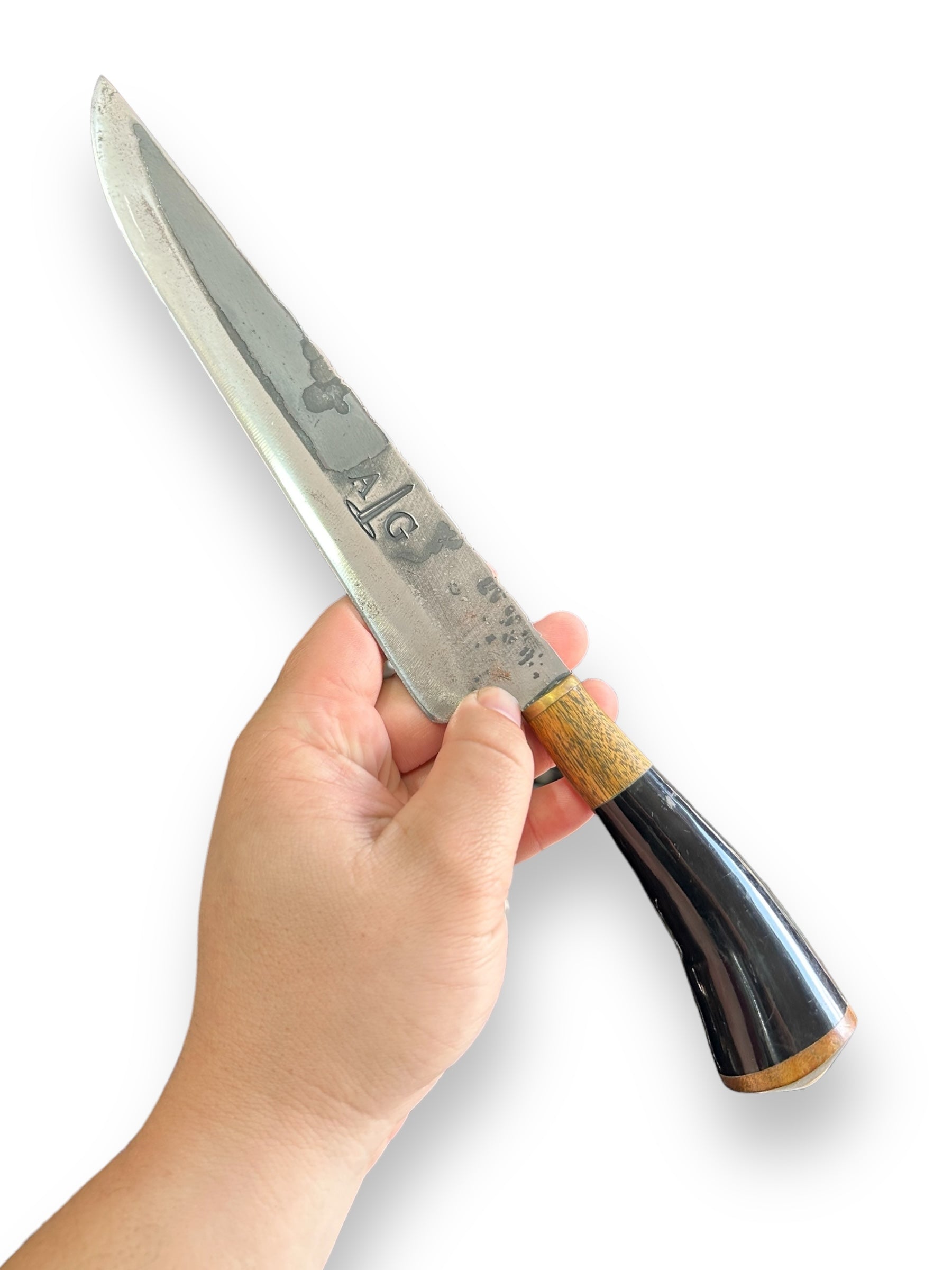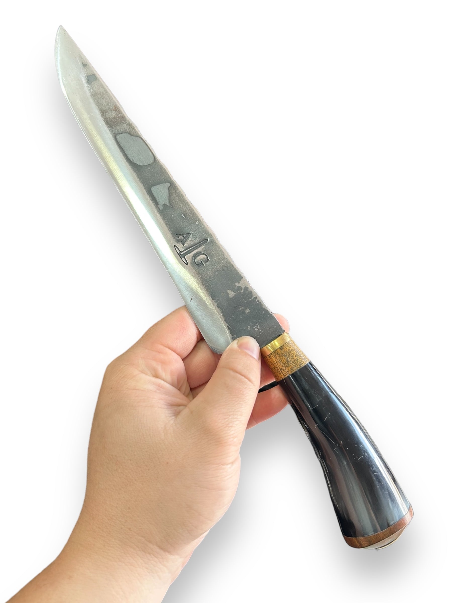 Faca artesanal com lâmina de 23 cm em aço carbono 1070, aspecto rústico e espiga completa. Guampa bovina e cabo de madeira com botão de bronze.