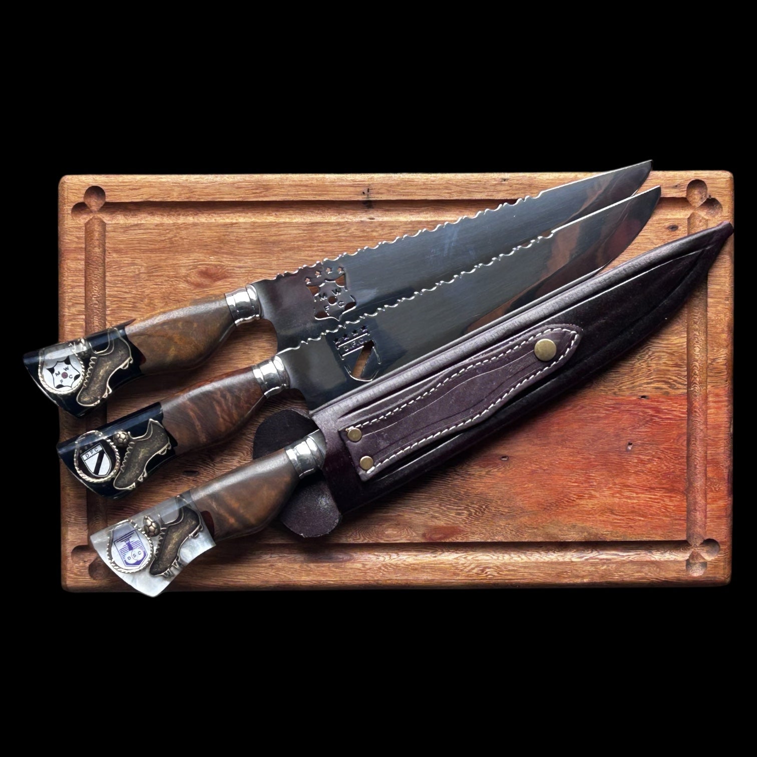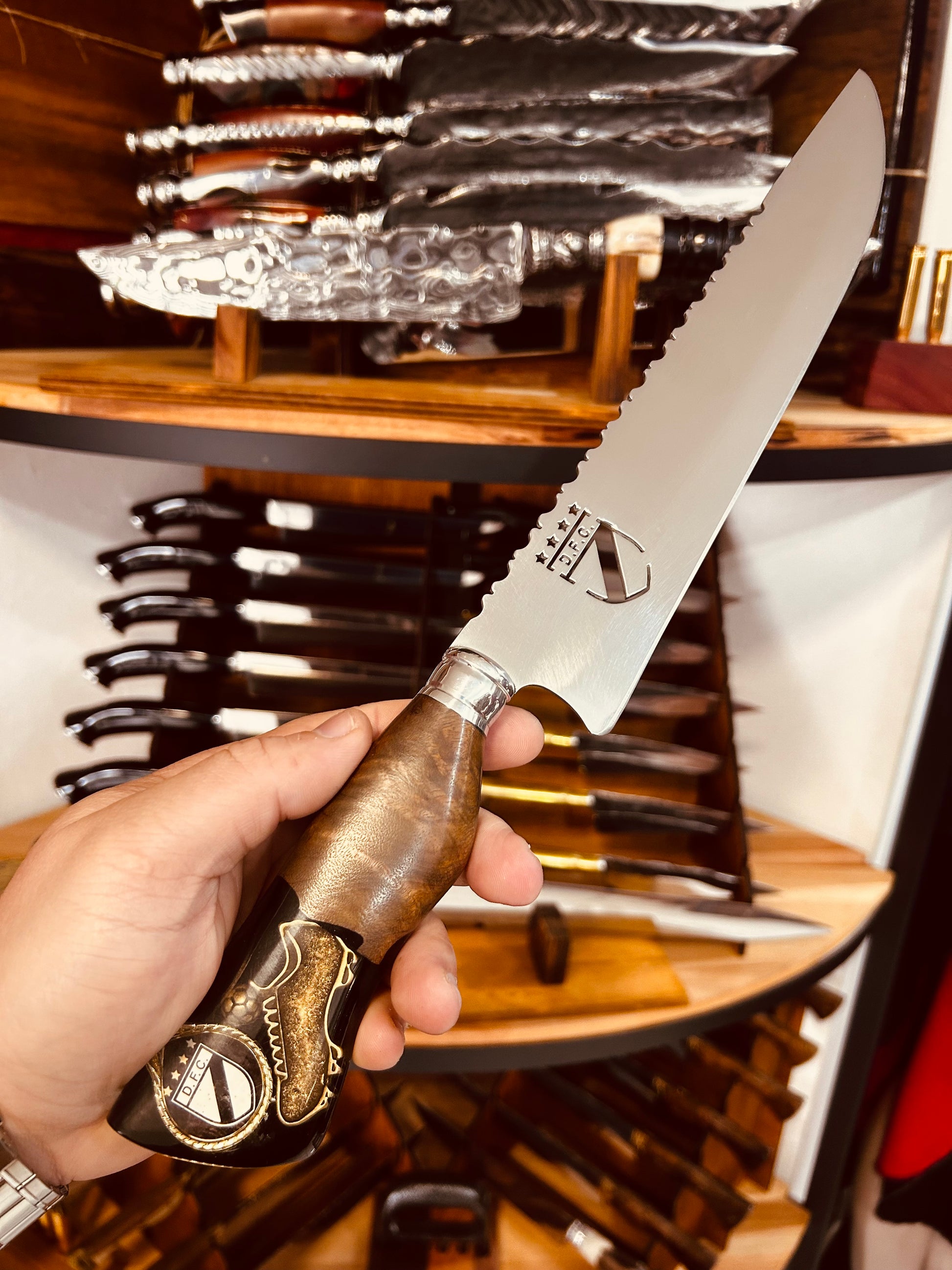 Cuchillo con mango de resina epoxi y lamina en acero inoxidable 420. Mango personalizo con la temática de Danubio.