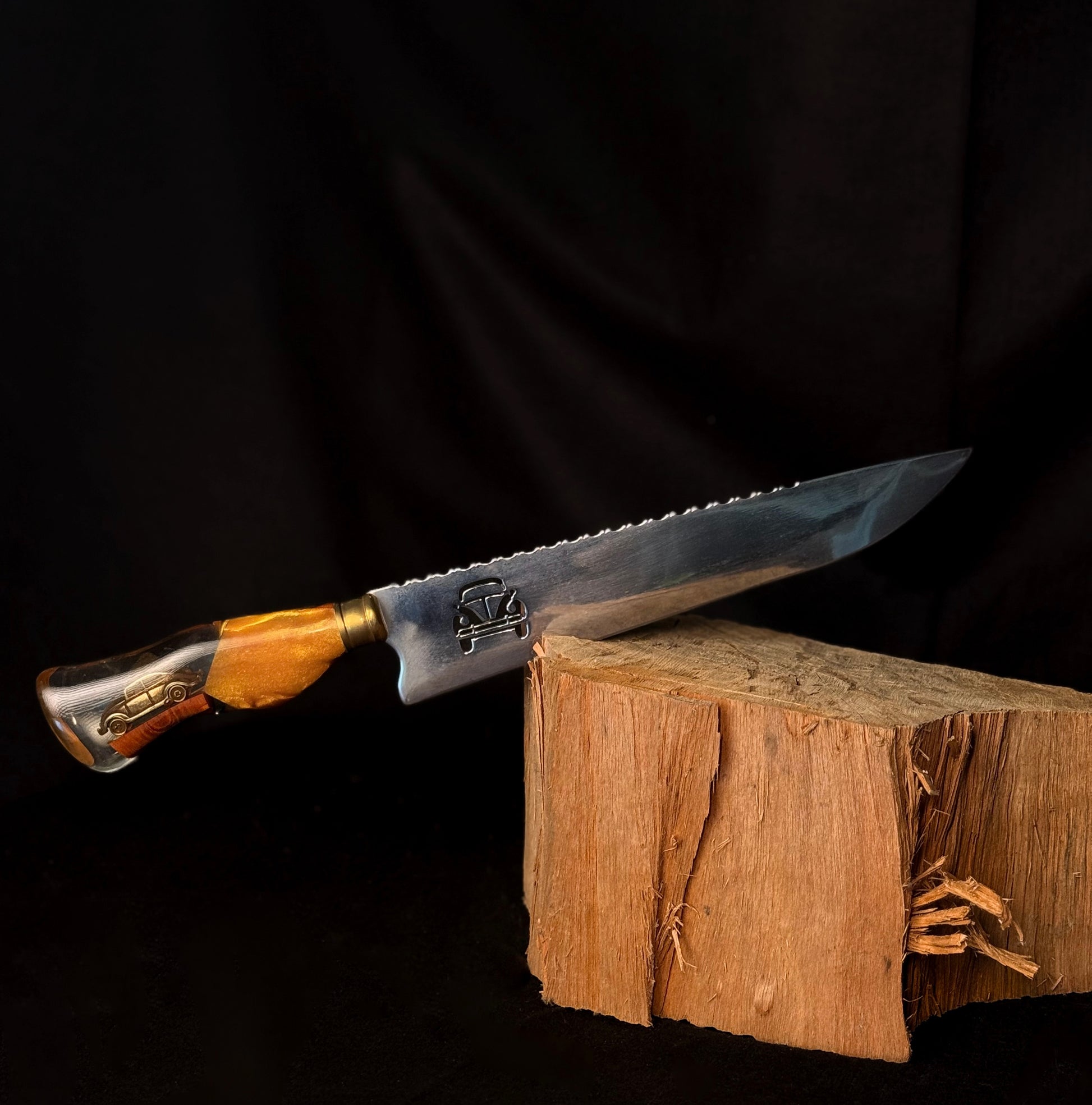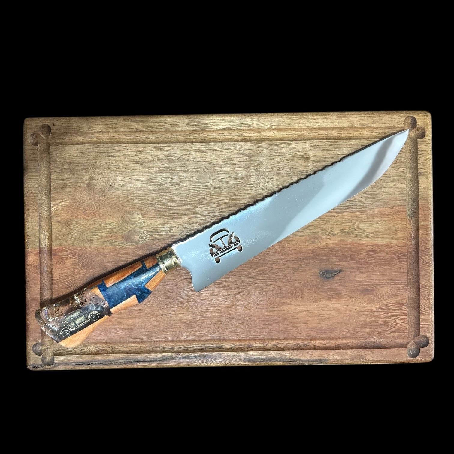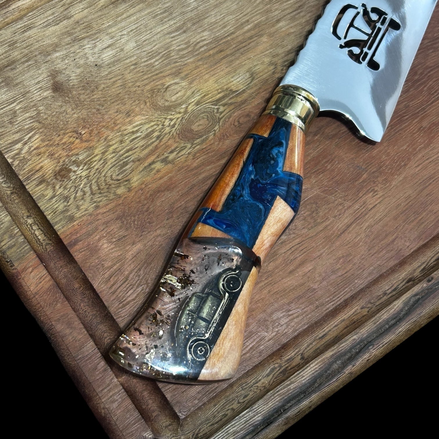 Faca com lâmina em aço inox 420, cabo híbrido (resina epóxi com madeira) e bainha de couro. Lâmina e cabo personalizados com design automotivo Fuca/Beetle/Volkswagen. Essa peça é ideal para cortar carnes e alimentos diversos, mostrando-se muito prática na grelha.