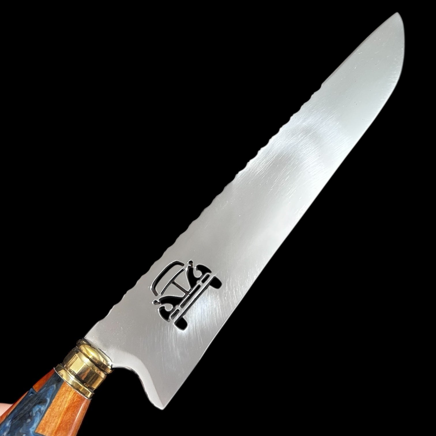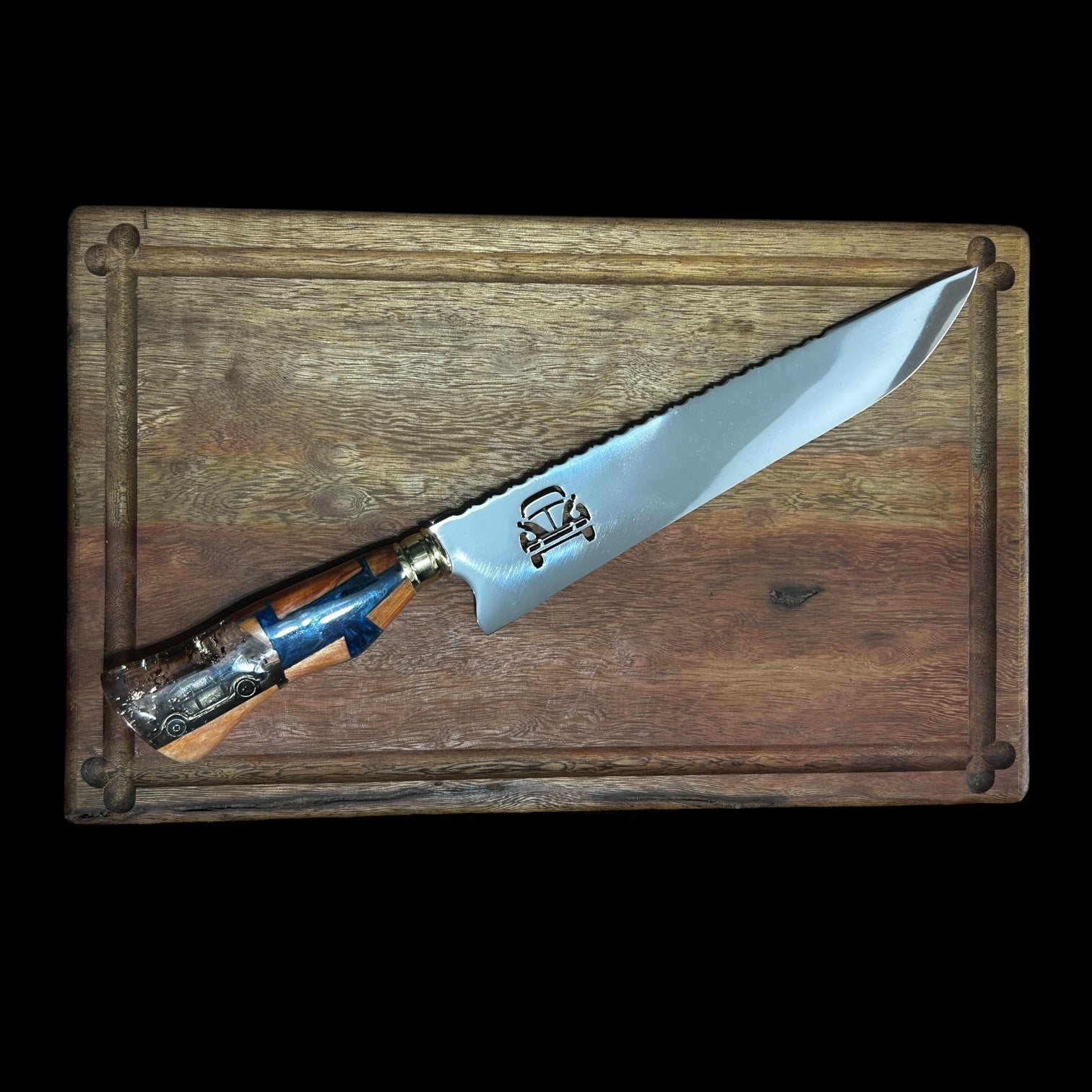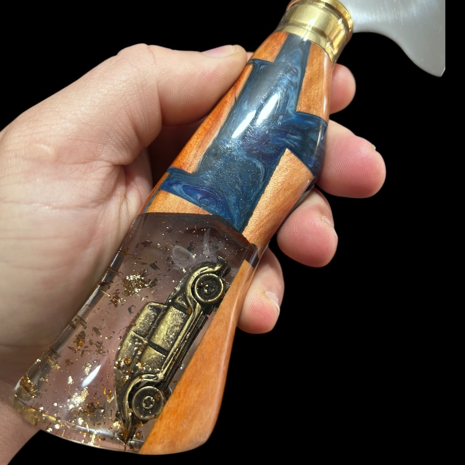 Faca com lâmina em aço inox 420, cabo híbrido (resina epóxi com madeira) e bainha de couro. Lâmina e cabo personalizados com design automotivo Fuca/Beetle/Volkswagen. Essa peça é ideal para cortar carnes e alimentos diversos, mostrando-se muito prática na grelha.