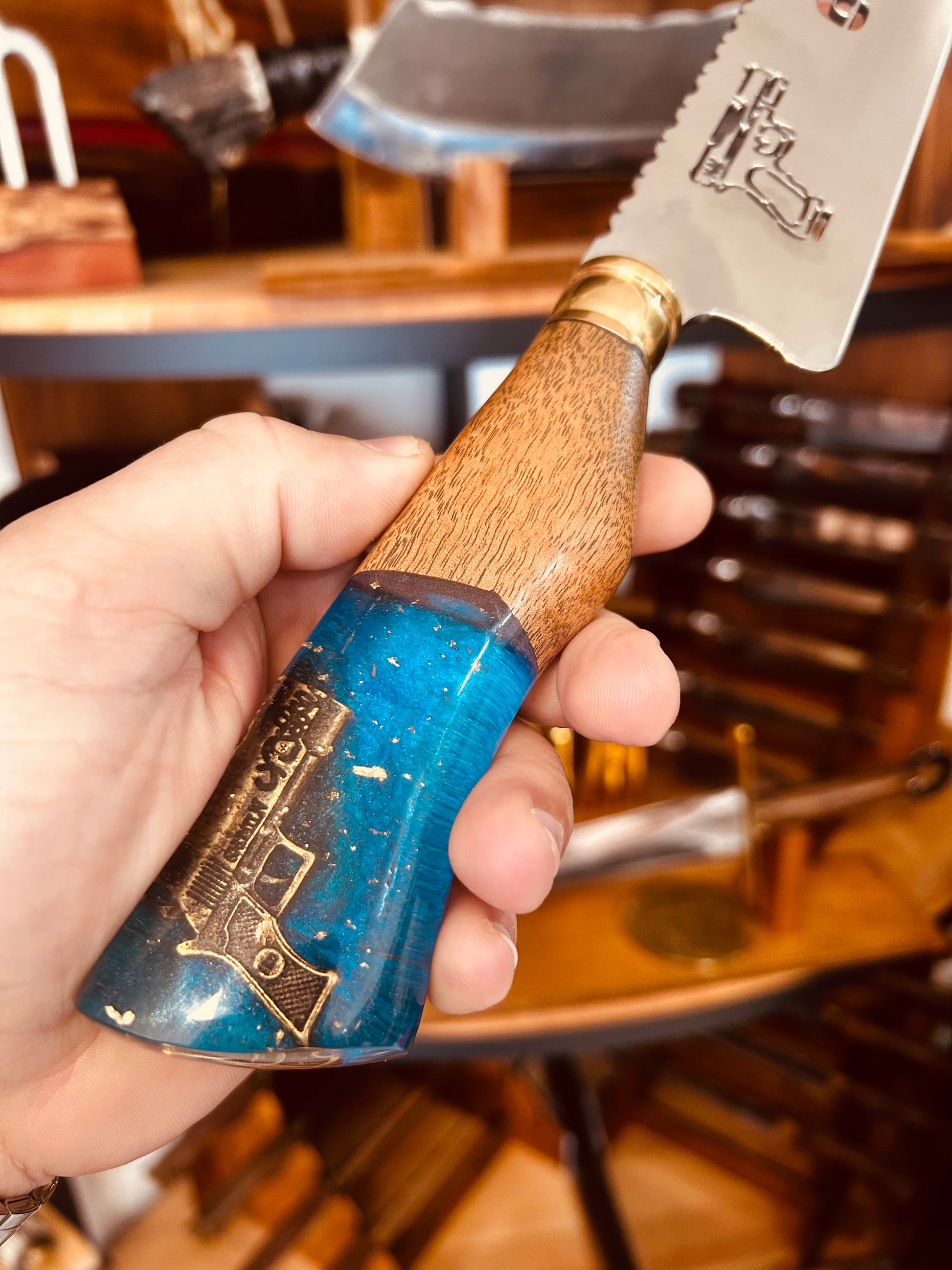 Cuchillo con hoja de acero inoxidable, mango hibrido (resina epoxi con madera) y vaina en cuero. Mango personalizados con cápsulas de munición y hoja con calado de Glock. Esta pieza es ideal para el corte de carne y alimentos varios, resultando ser muy practico en la parrilla.