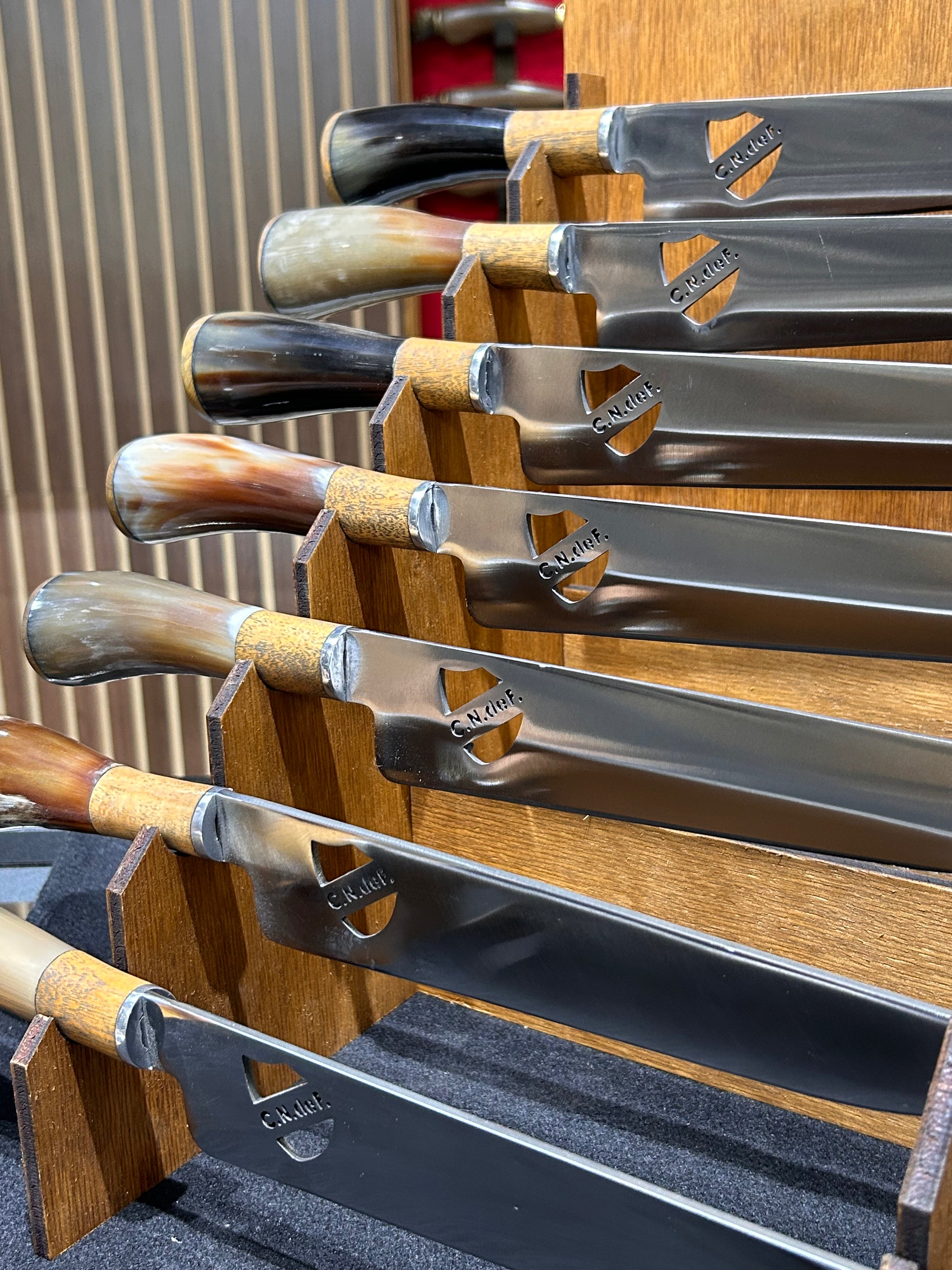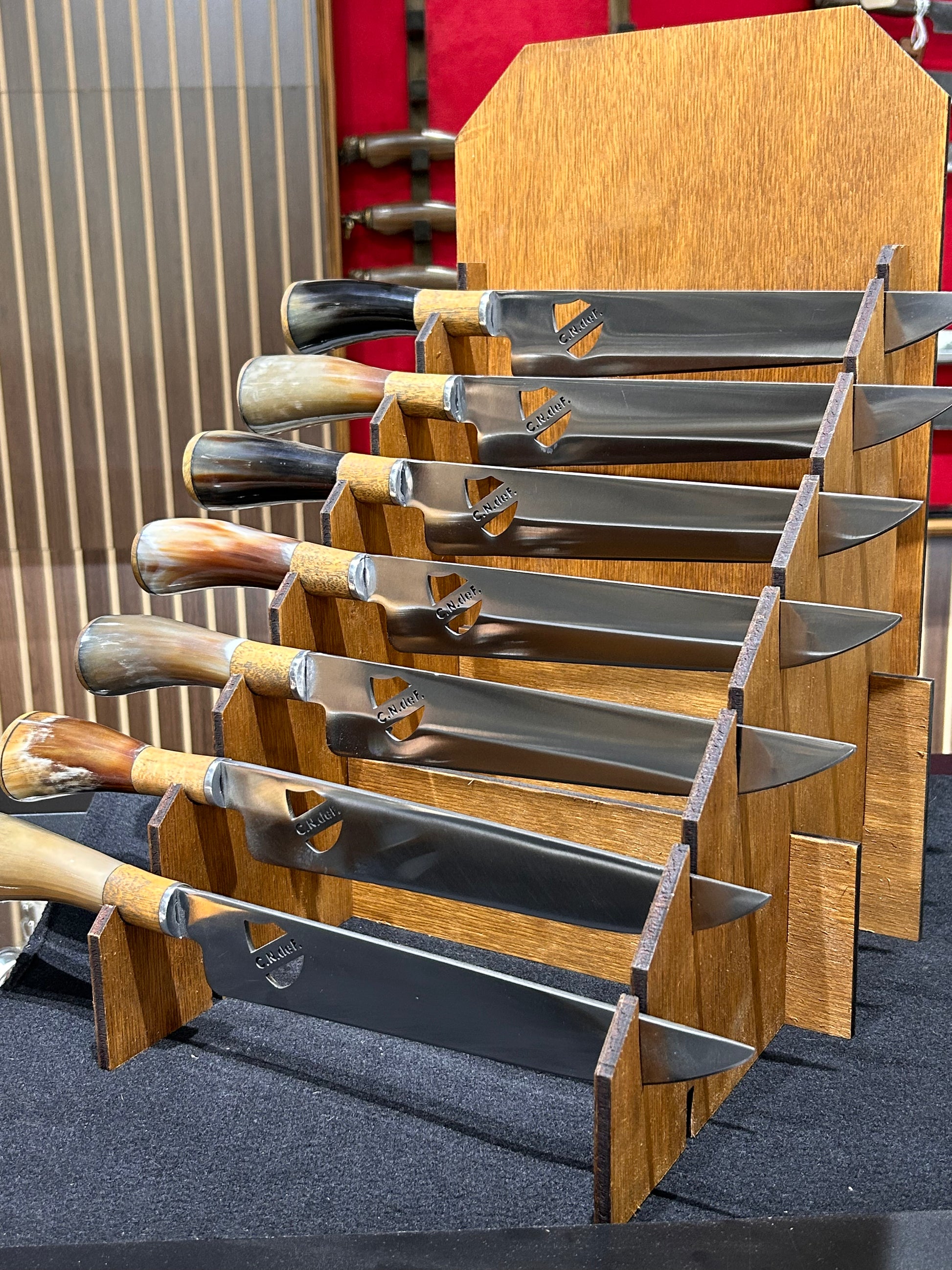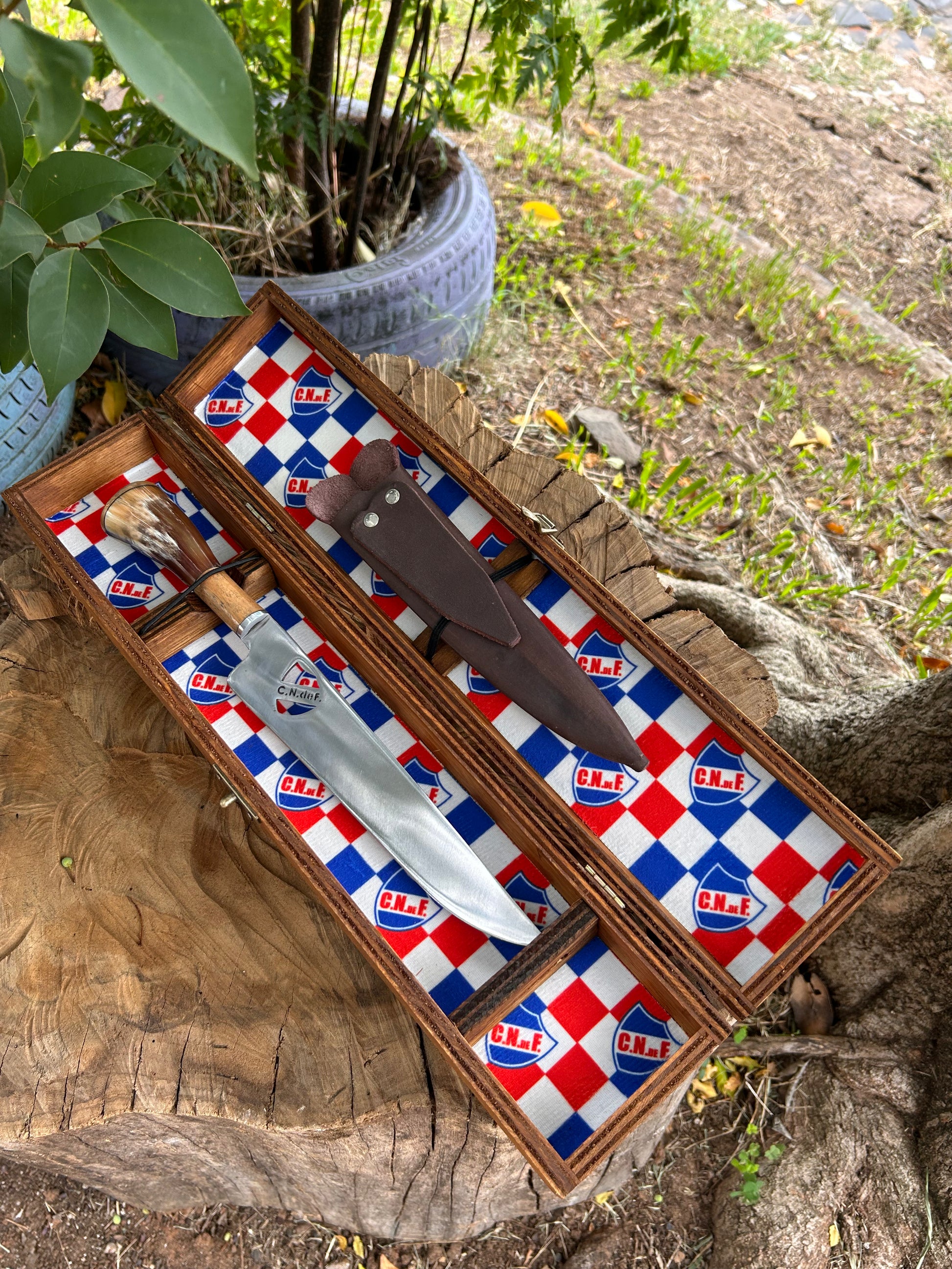 Faca com cabo de chifre de vaca e lâmina de aço inoxidável com o brasão da seleção nacional recortado. Uma faca absolutamente insana!
