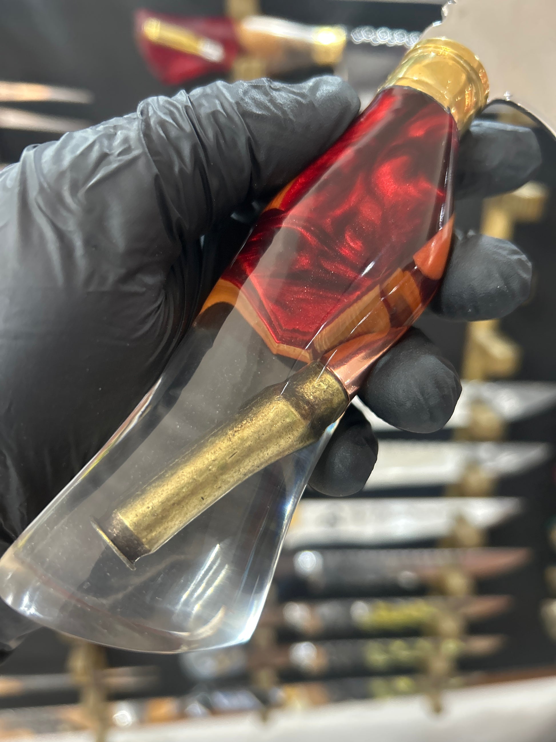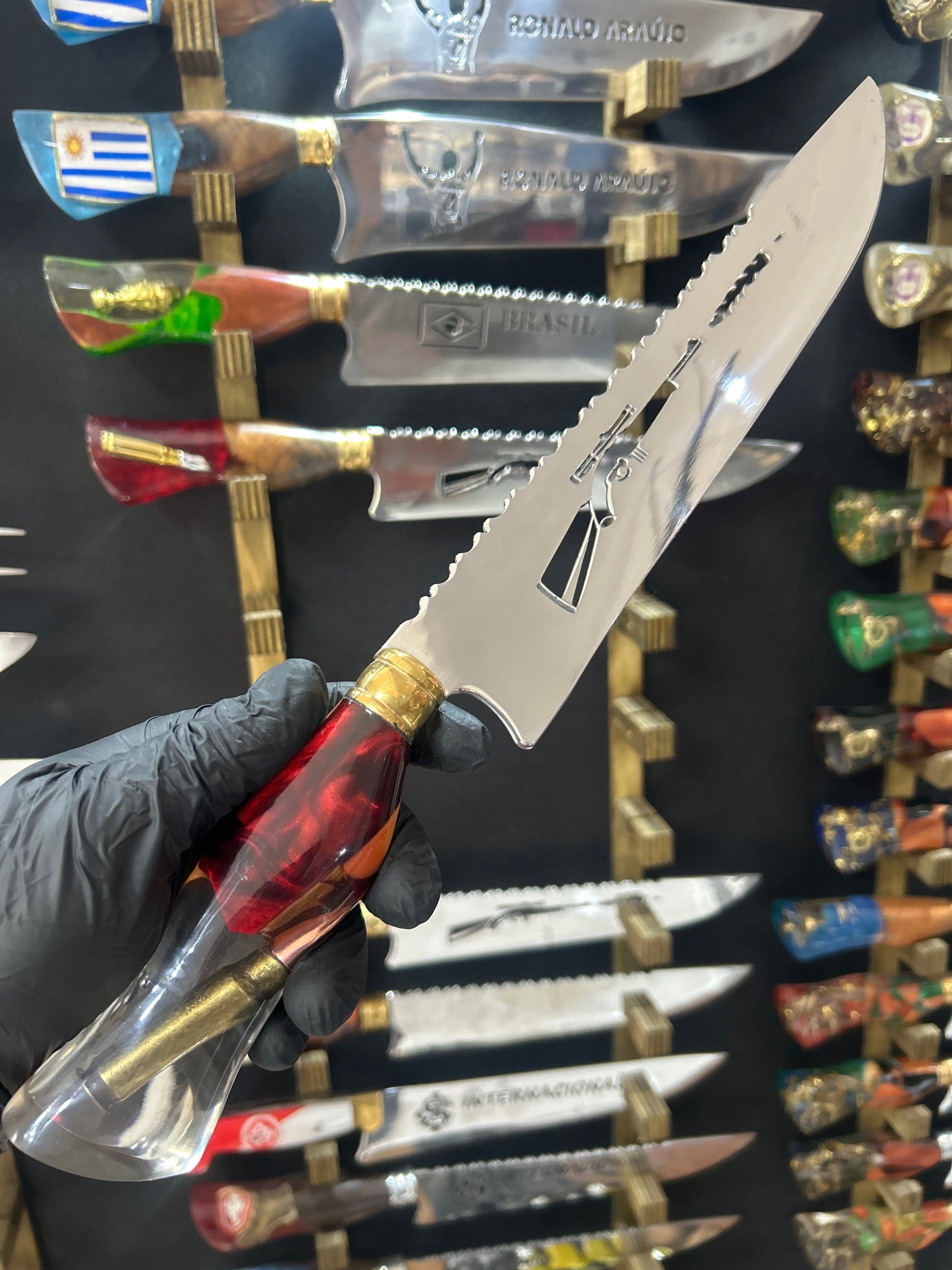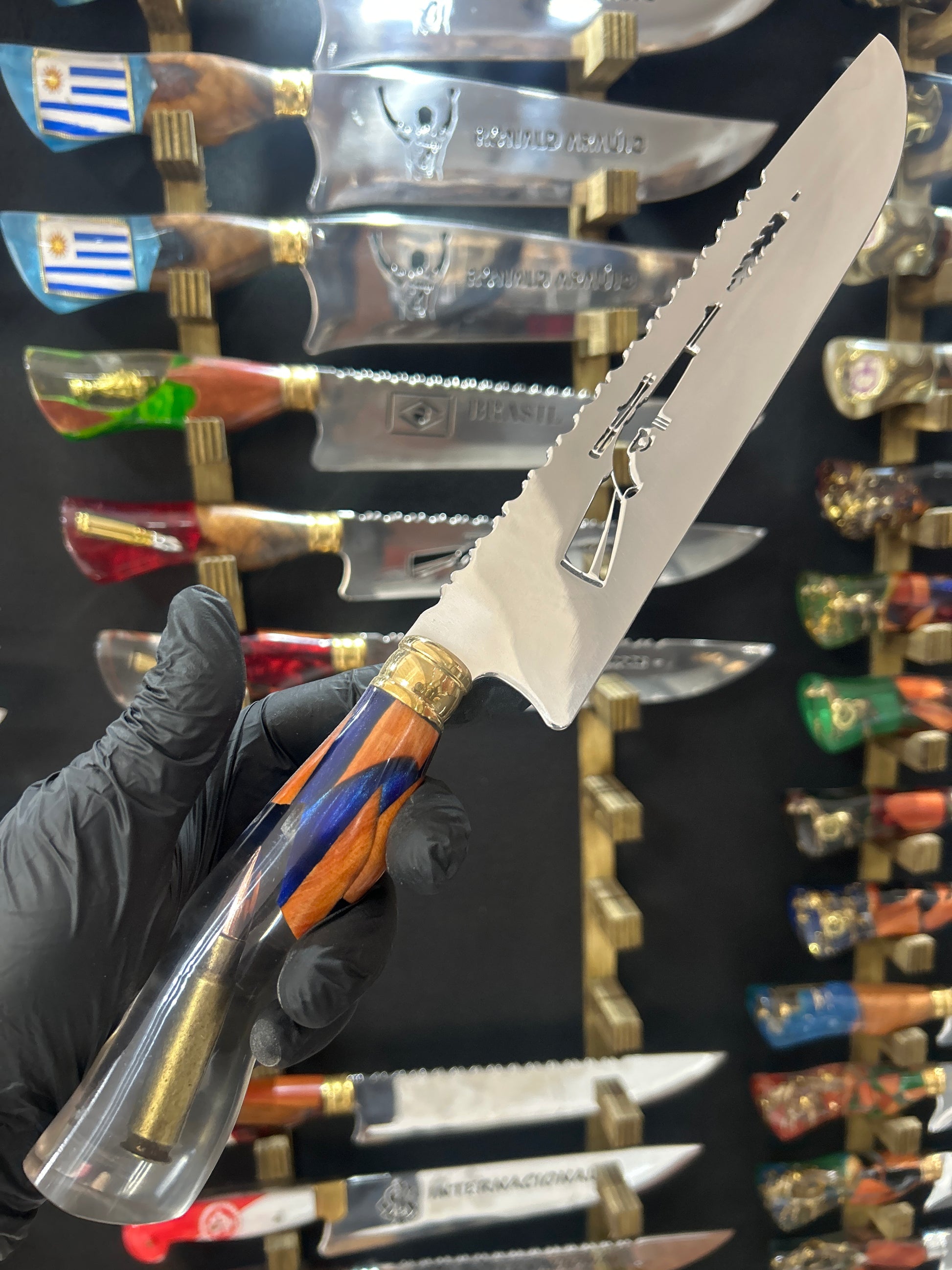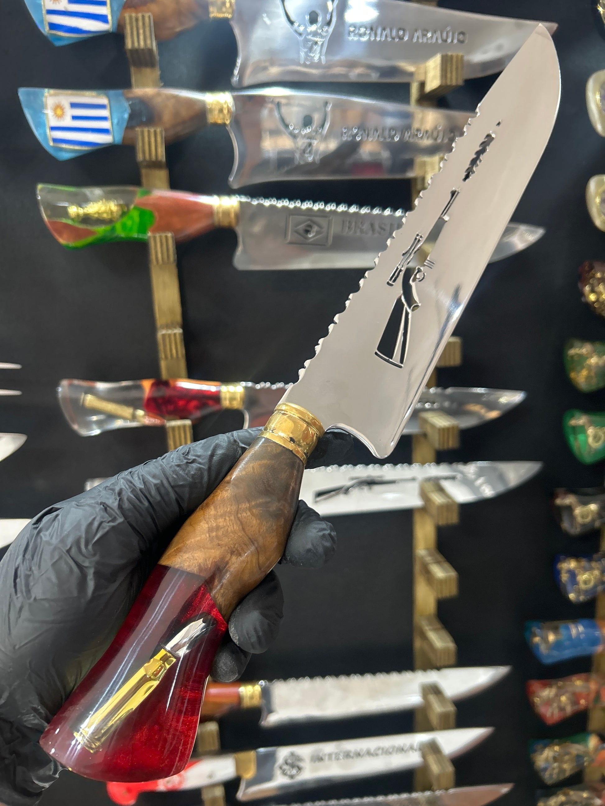 Faca com lâmina em aço inoxidável 420, cabo híbrido (resina epóxi e madeira) e bainha de couro. A lâmina e o cabo possuem um design personalizado inspirado em rifles de precisão. Esta faca é ideal para cortar carnes e diversos alimentos, sendo especialmente prática para churrascos.