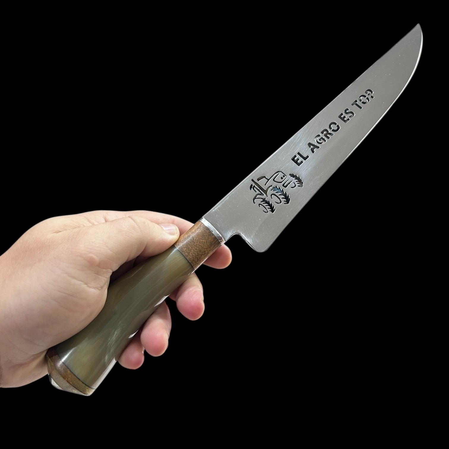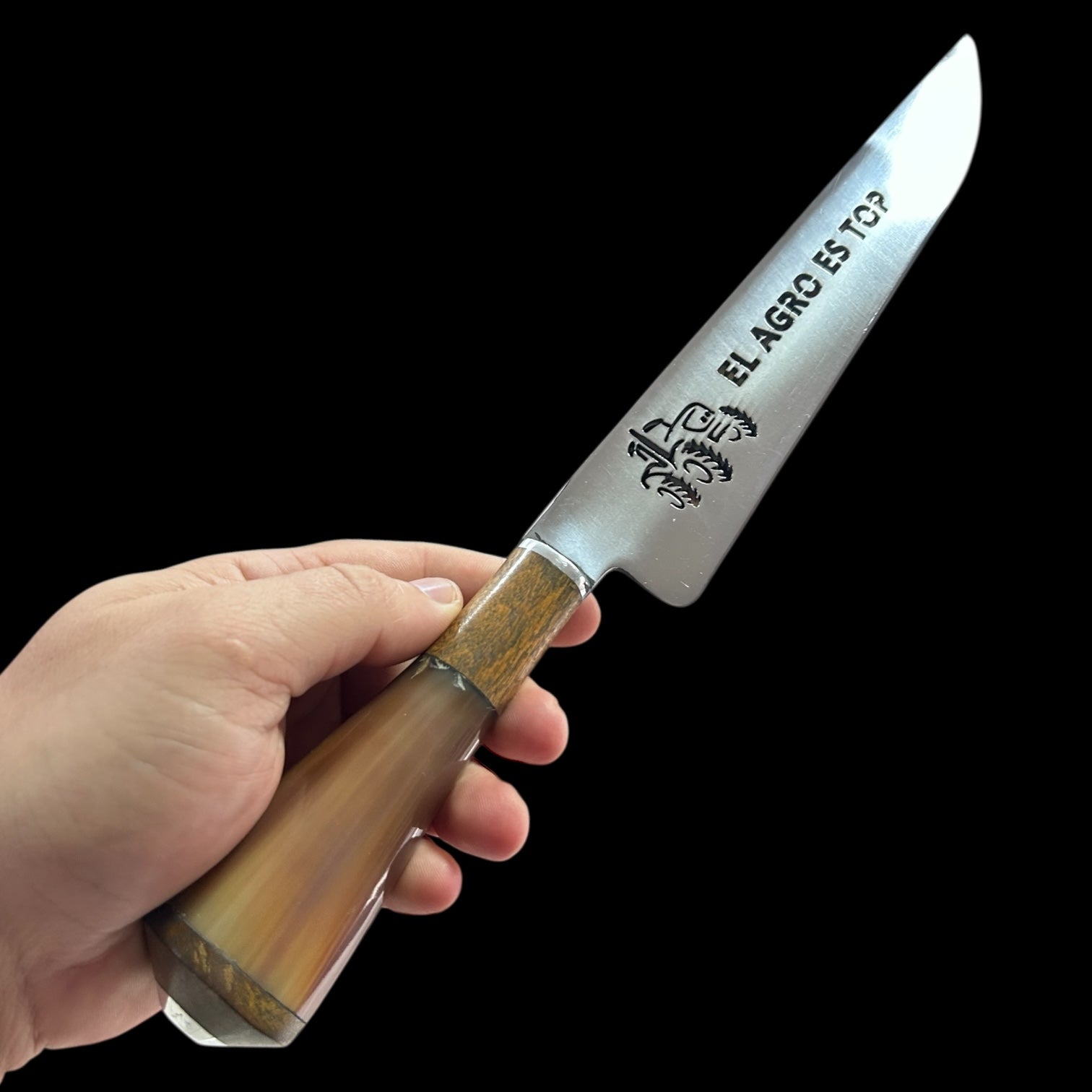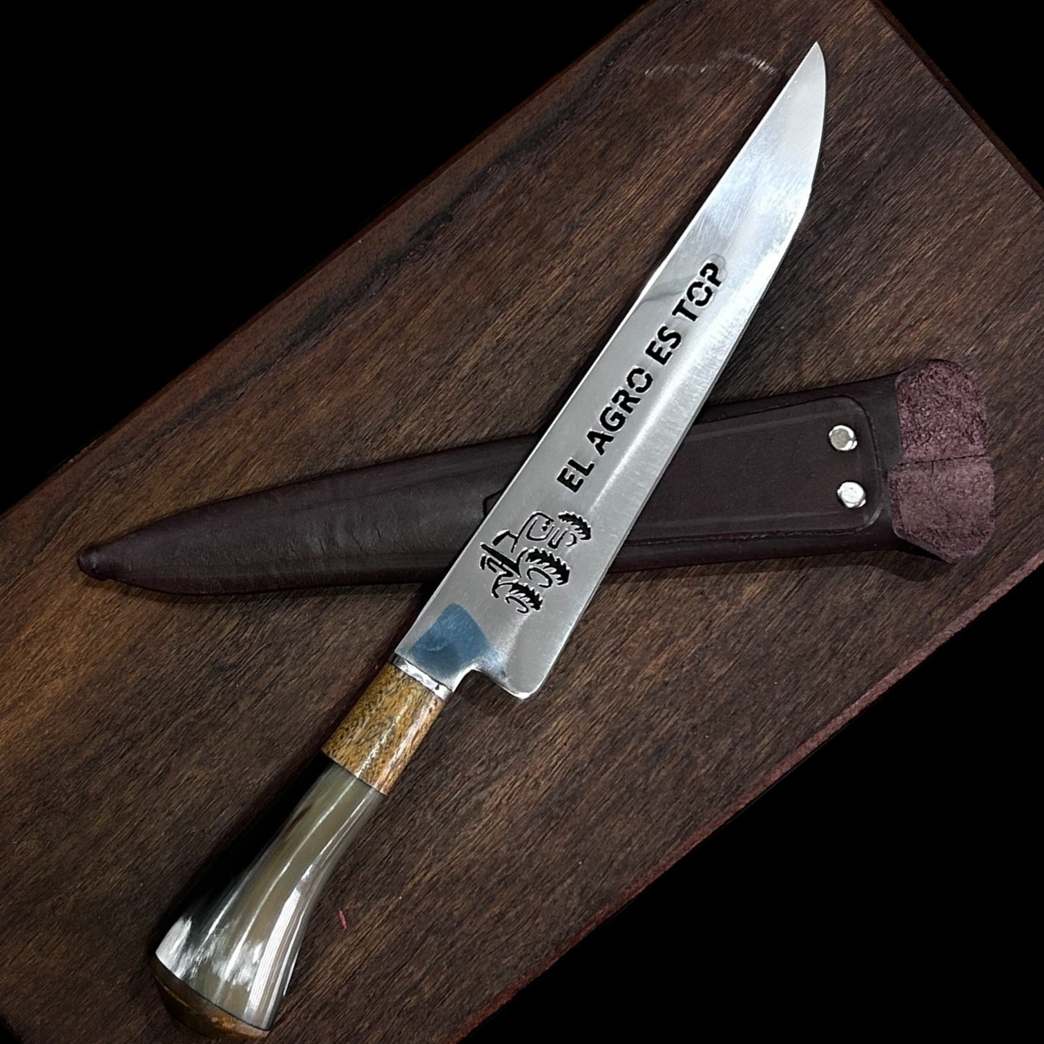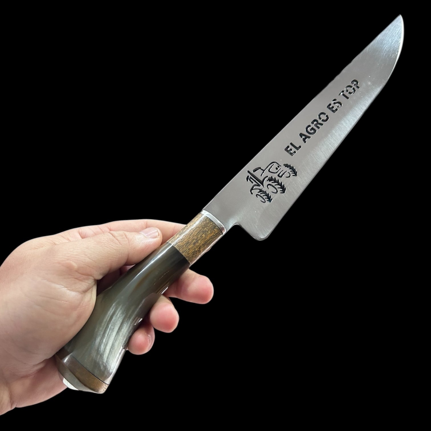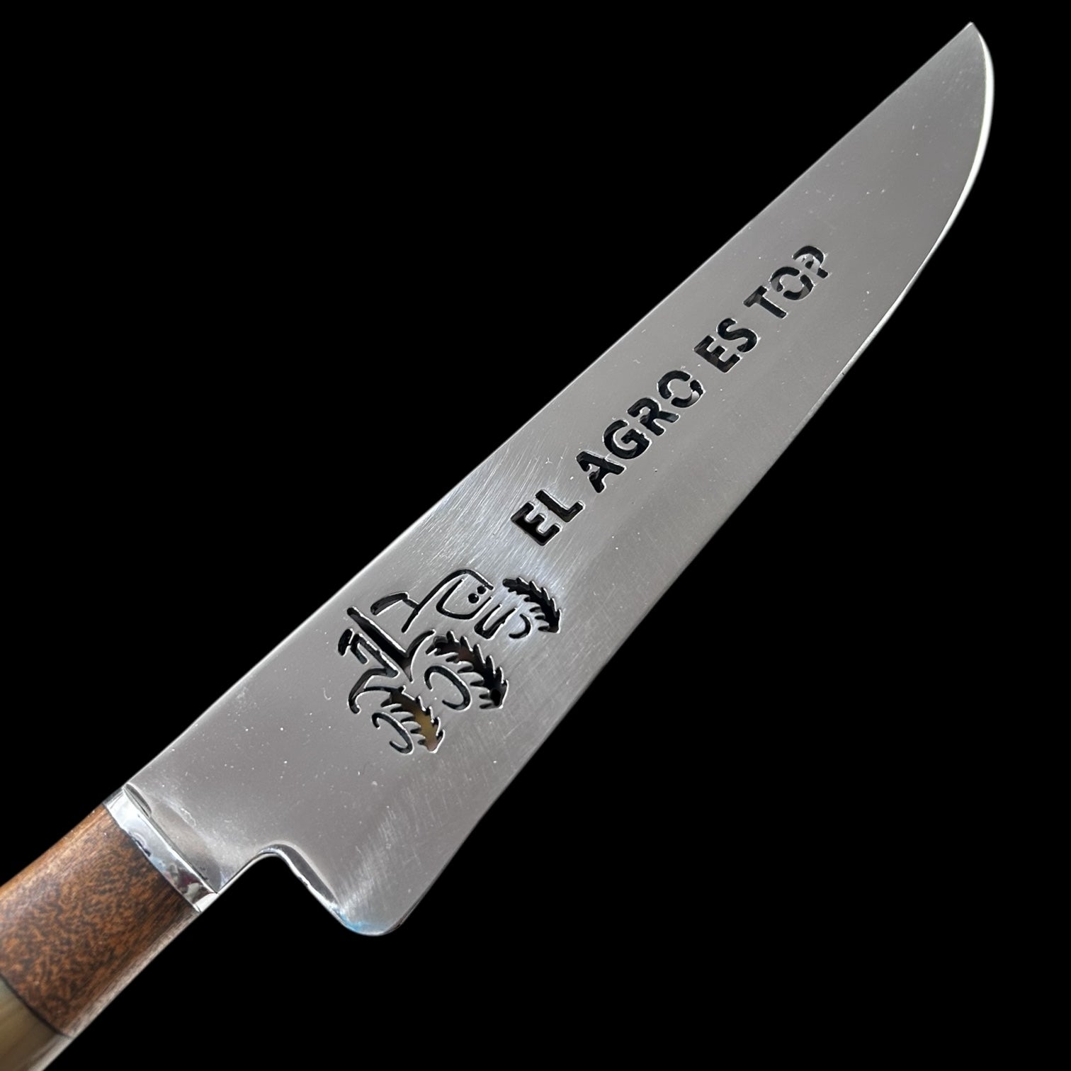 Este cuchillo en acero inoxidable con calado de la frase "El Agro es Top" es el regalo ideal para esa persona especial que ama cocinar a la parrilla y apasionado por lo agro. Con su vaina incluida, garantiza una larga durabilidad y comodidad en la cocina. ¡Hazte con él y conviértete en el verdadero rey de la parrilla!