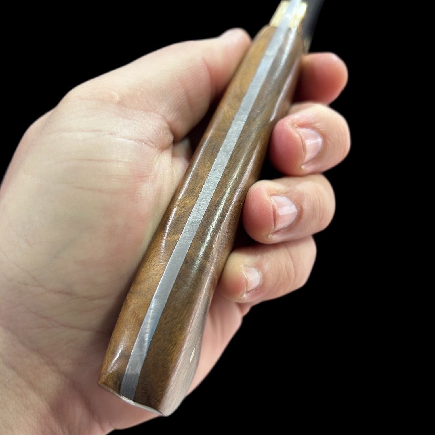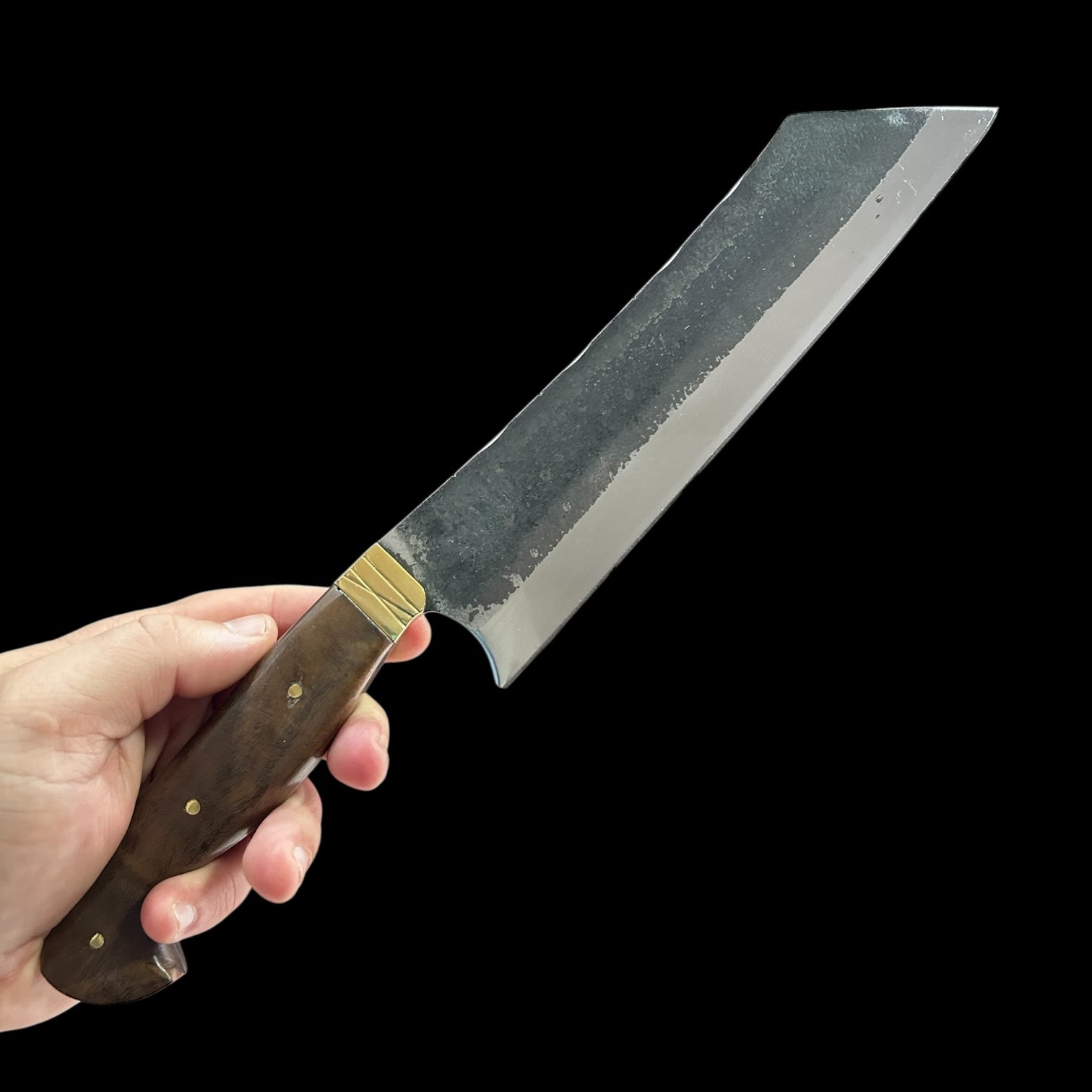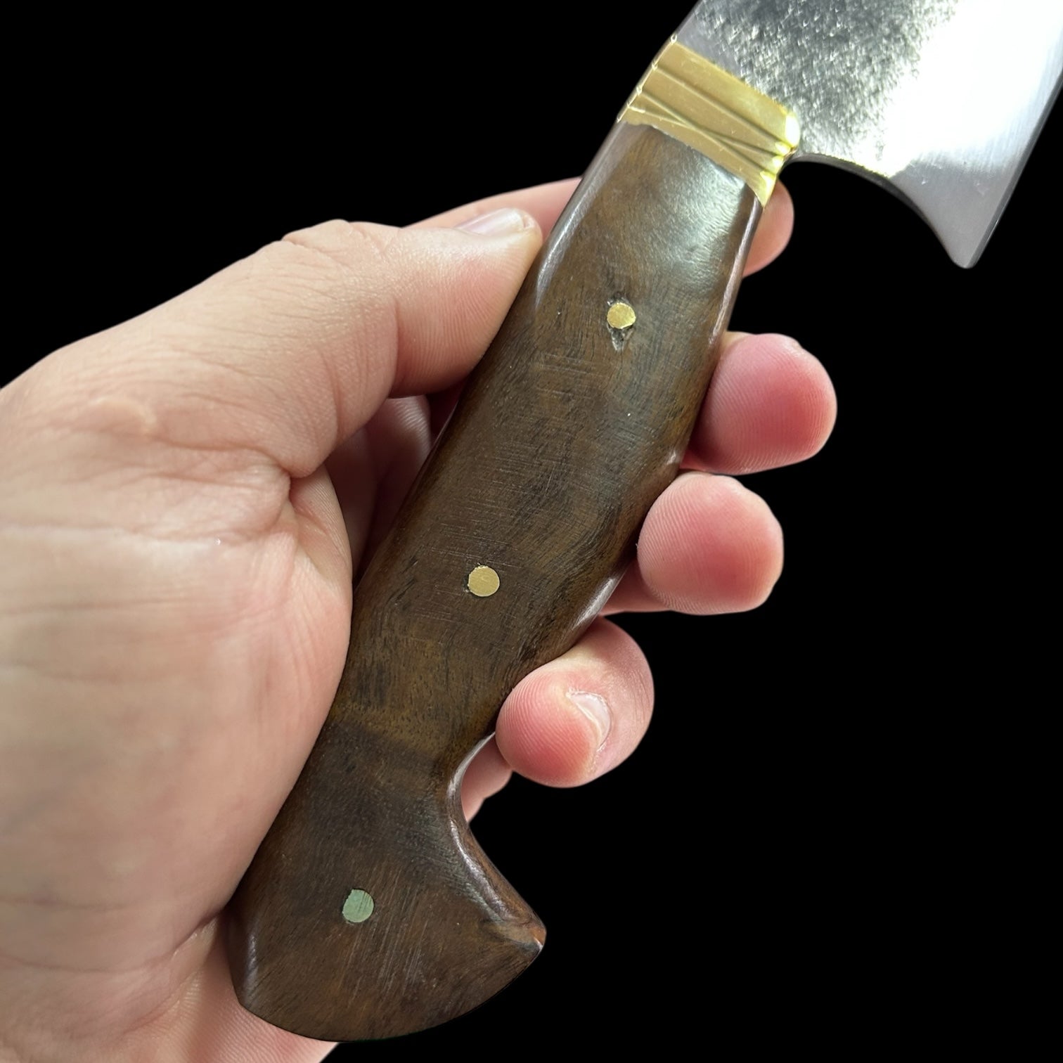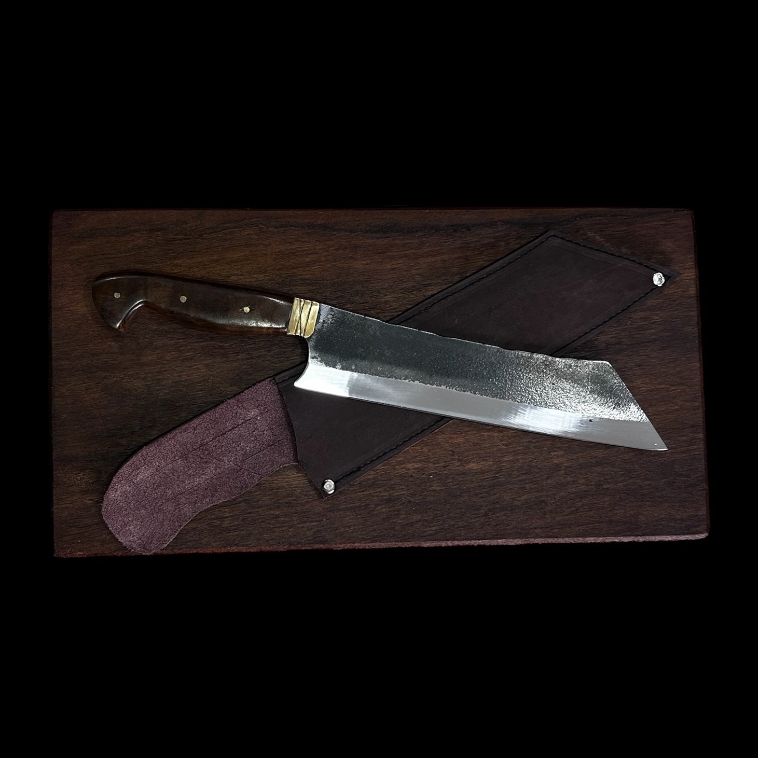 Descubre esta hacha que elevará tu pasión por el asado y te ayudará a alcanzar la perfección en cada detalle. Fabricado con acero carbono, un mango chato de madera imbuia y un elegante botón de bronce, esta hacha es una obra de arte que ofrece un filo excepcional. Viene acompañado de una vaina de cuero, lista para ser tu fiel compañera en cada reunión.