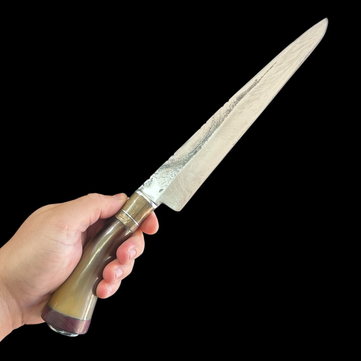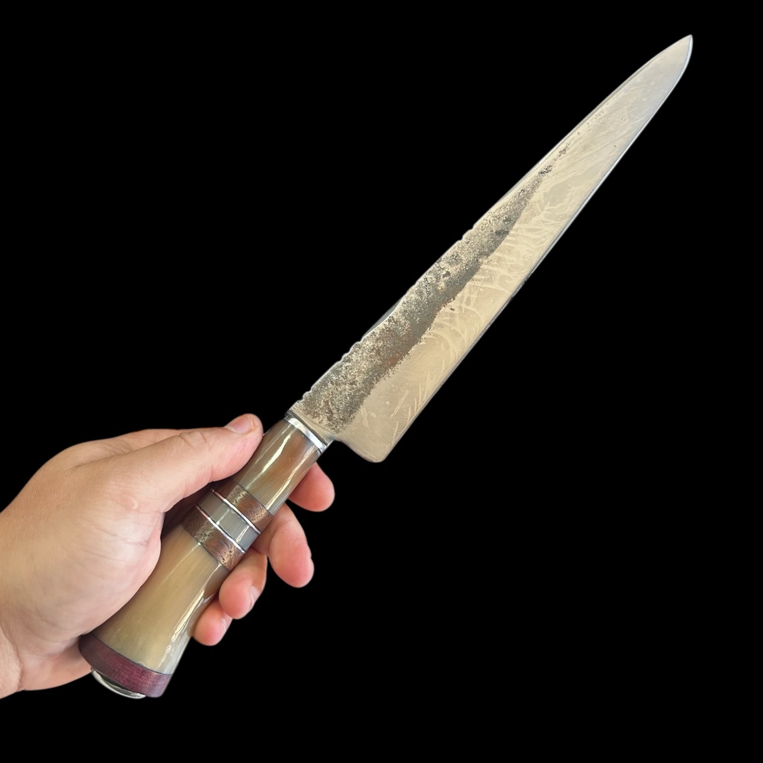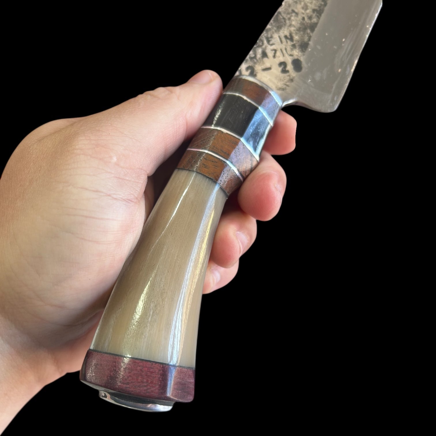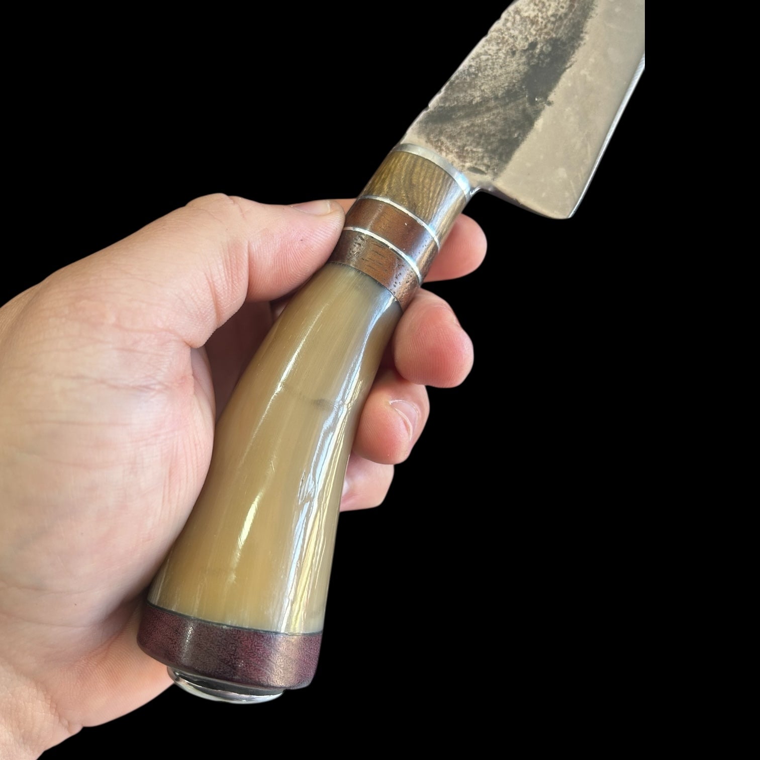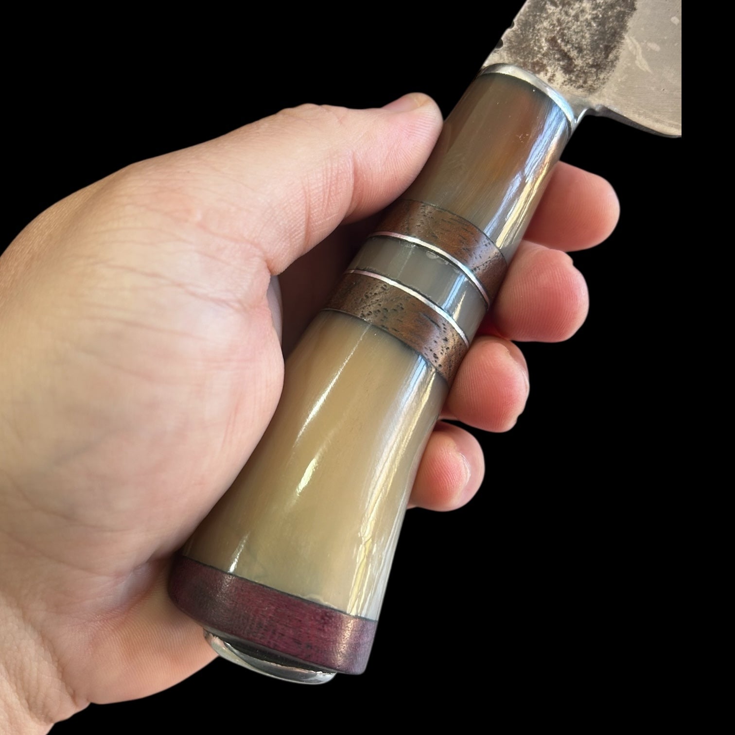 Faca de javali com lâmina confeccionada em disco de arado (aço carbono), guampa bovina ou cabo de osso.