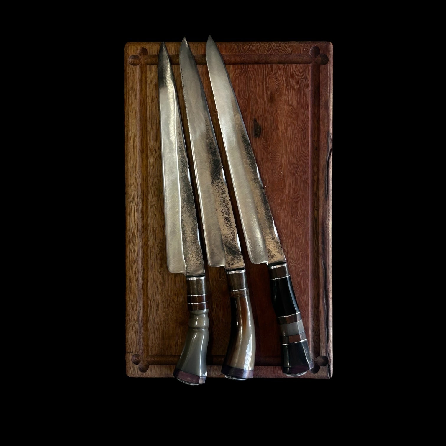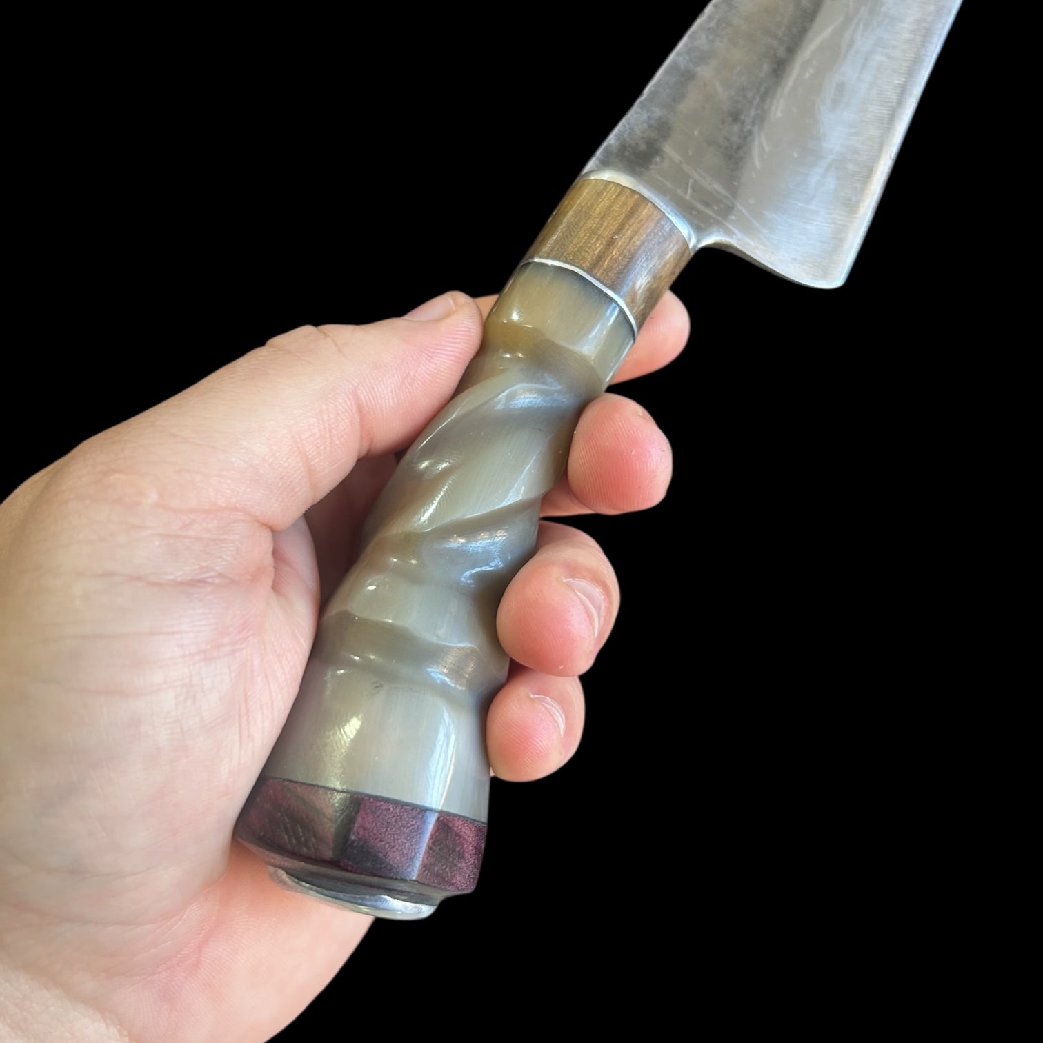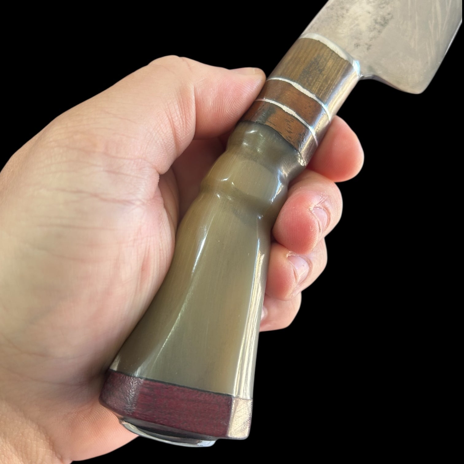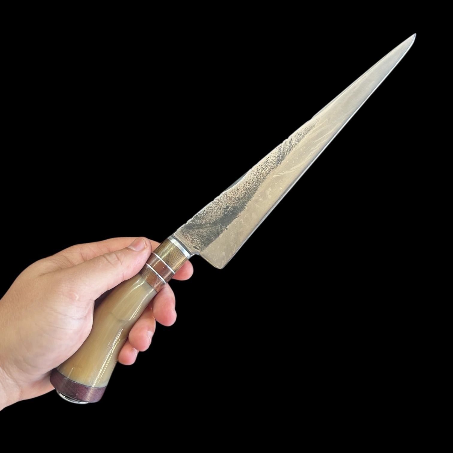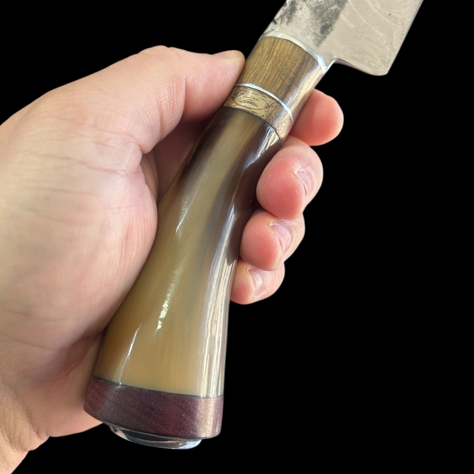 Faca de javali com lâmina confeccionada em disco de arado (aço carbono), guampa bovina ou cabo de osso.