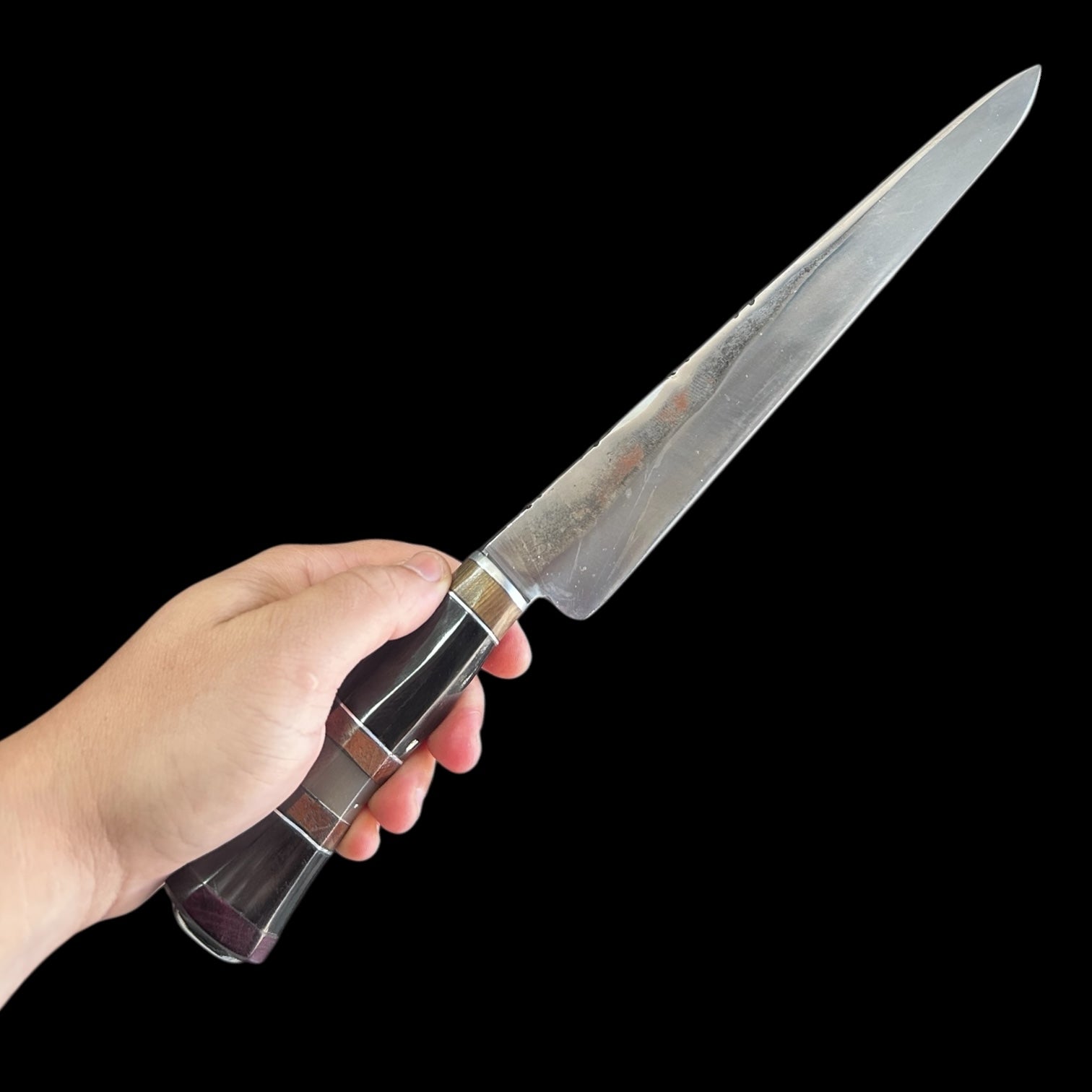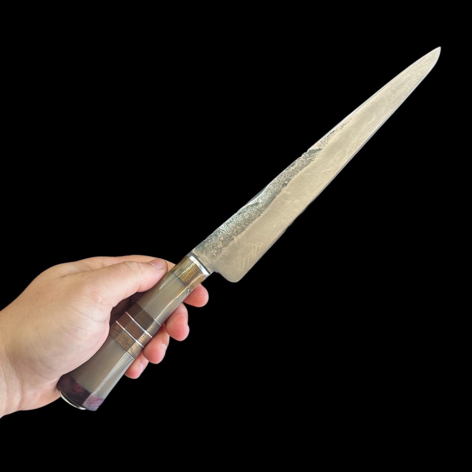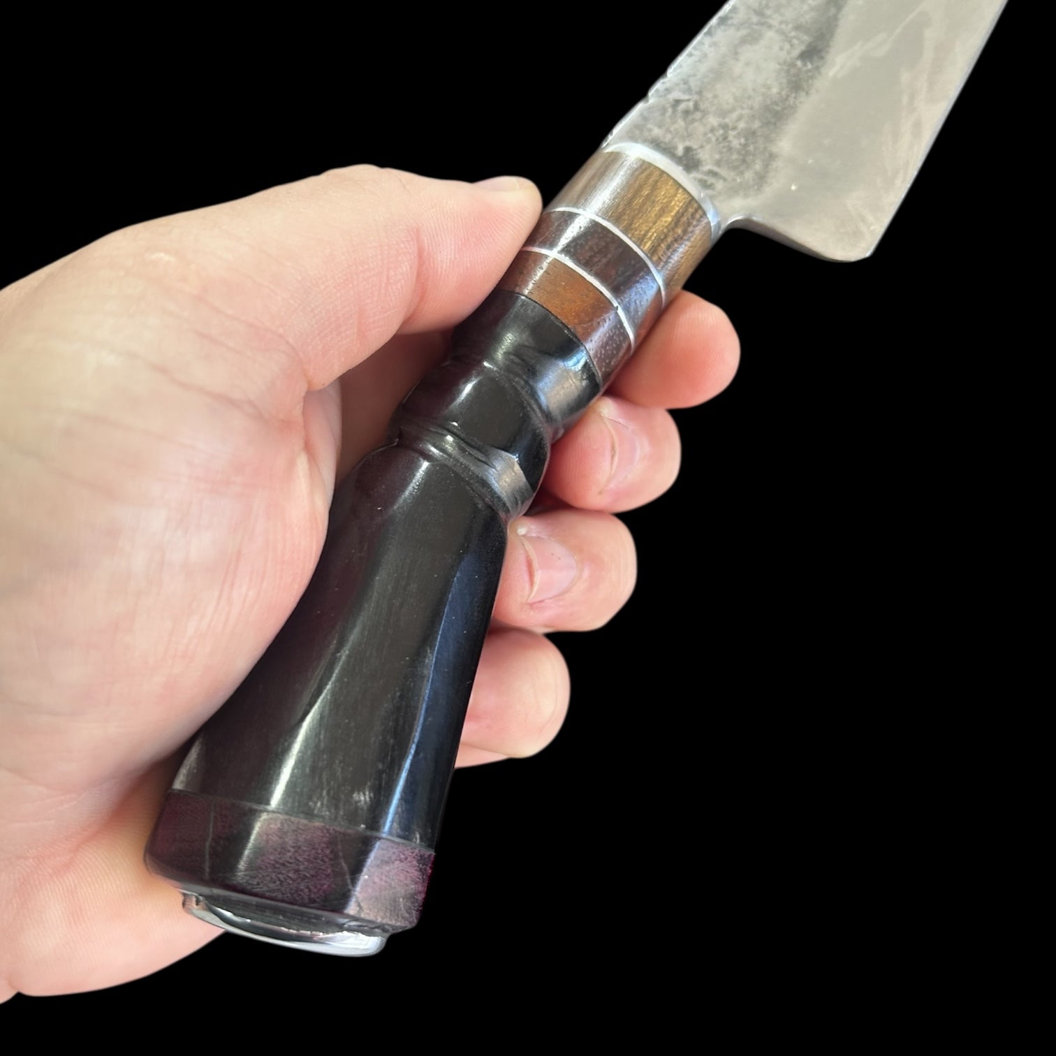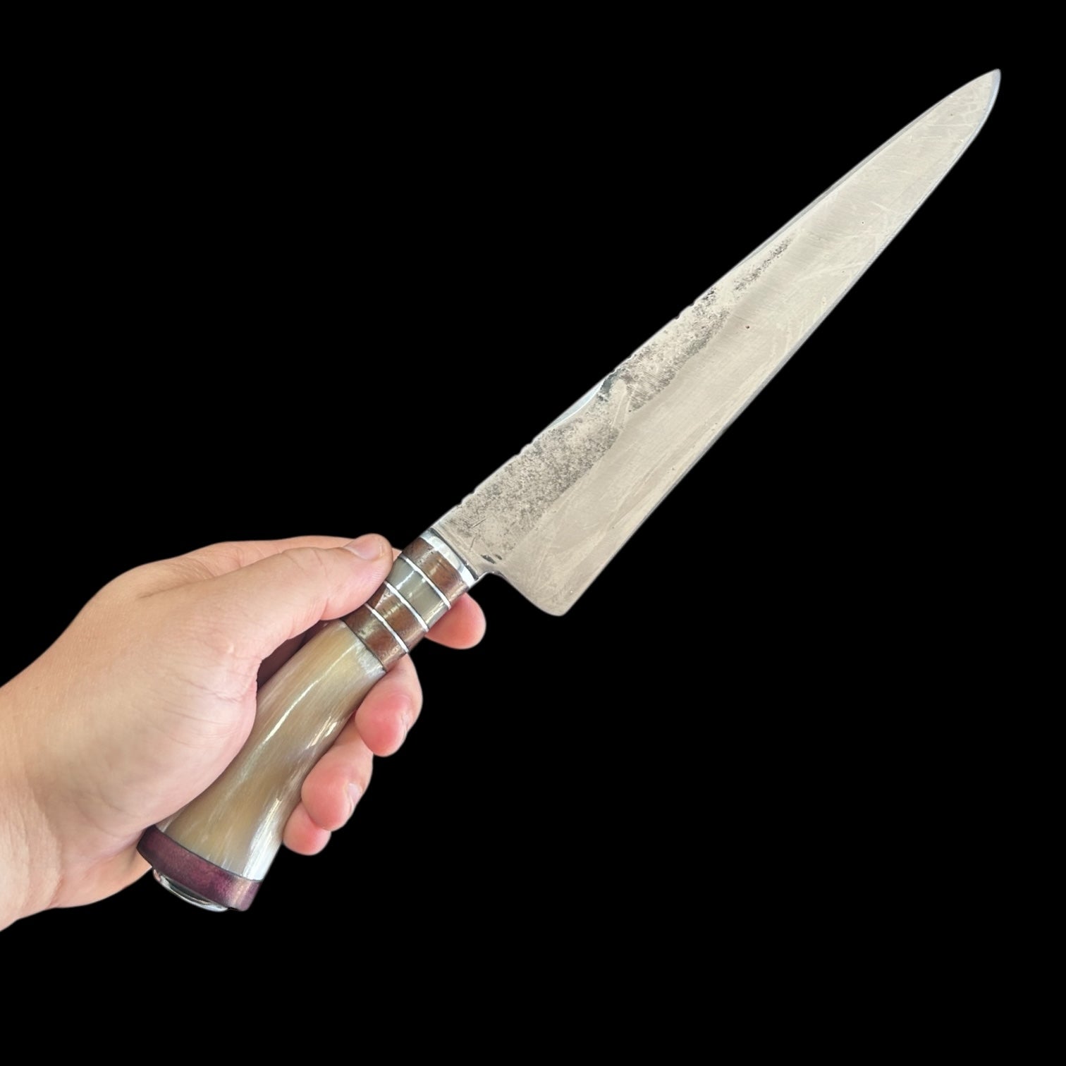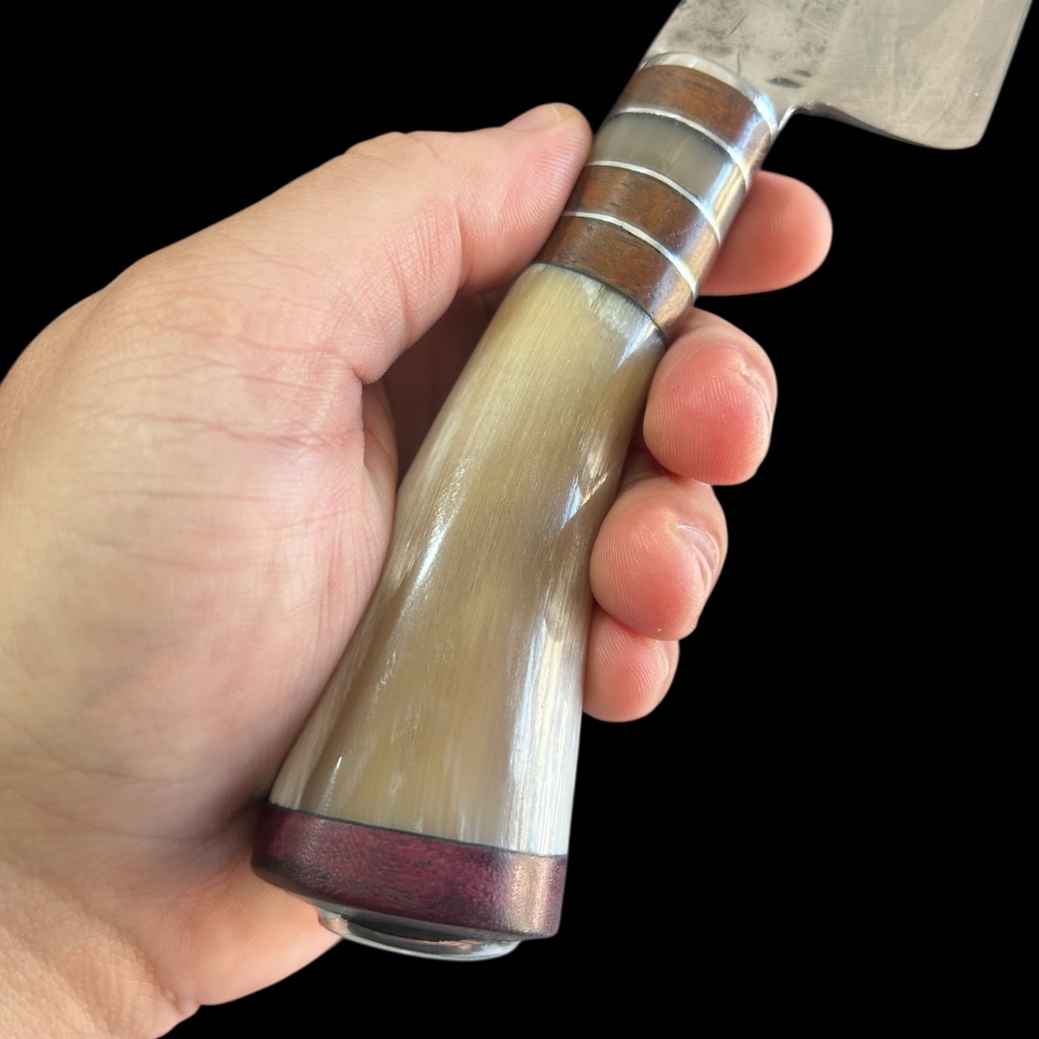 Faca de javali com lâmina confeccionada em disco de arado (aço carbono), guampa bovina ou cabo de osso.