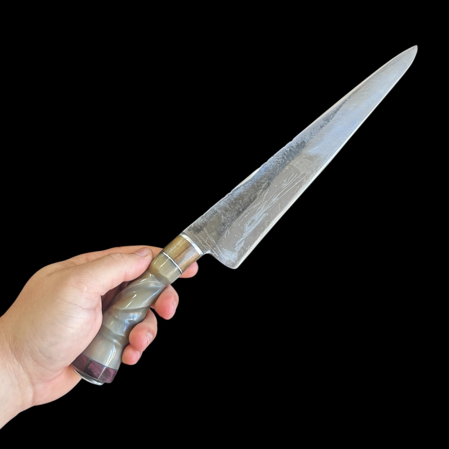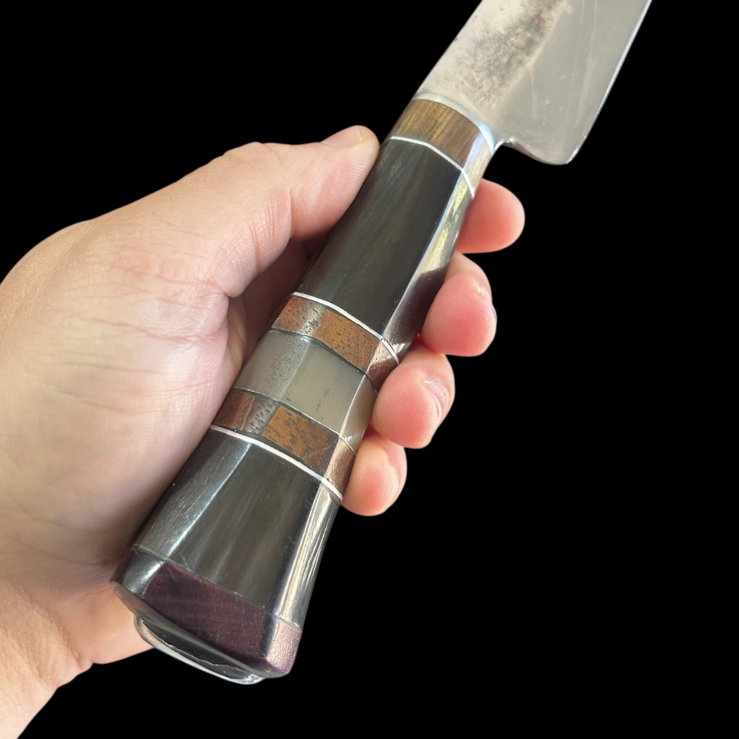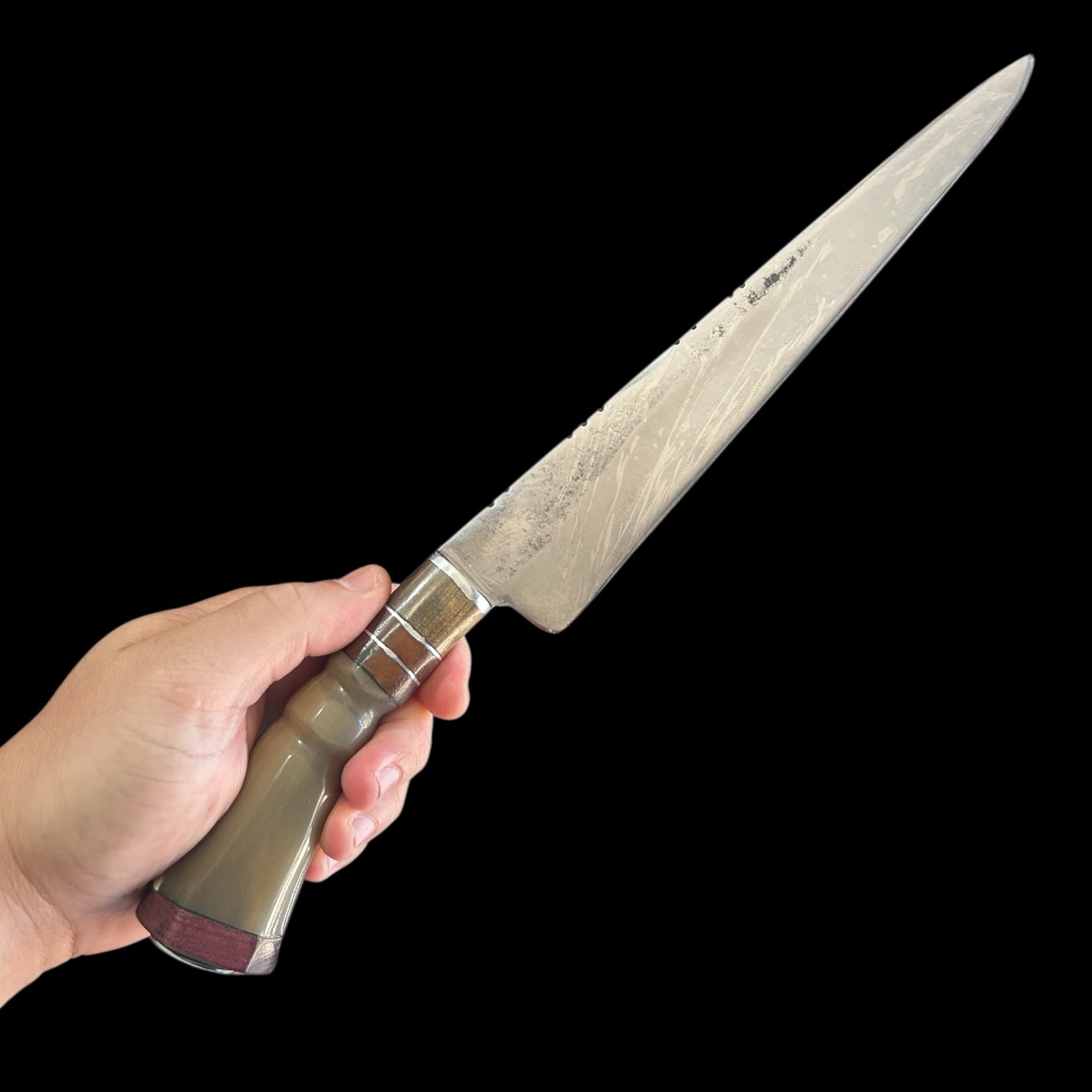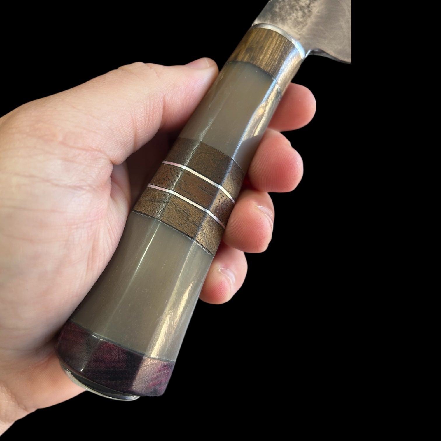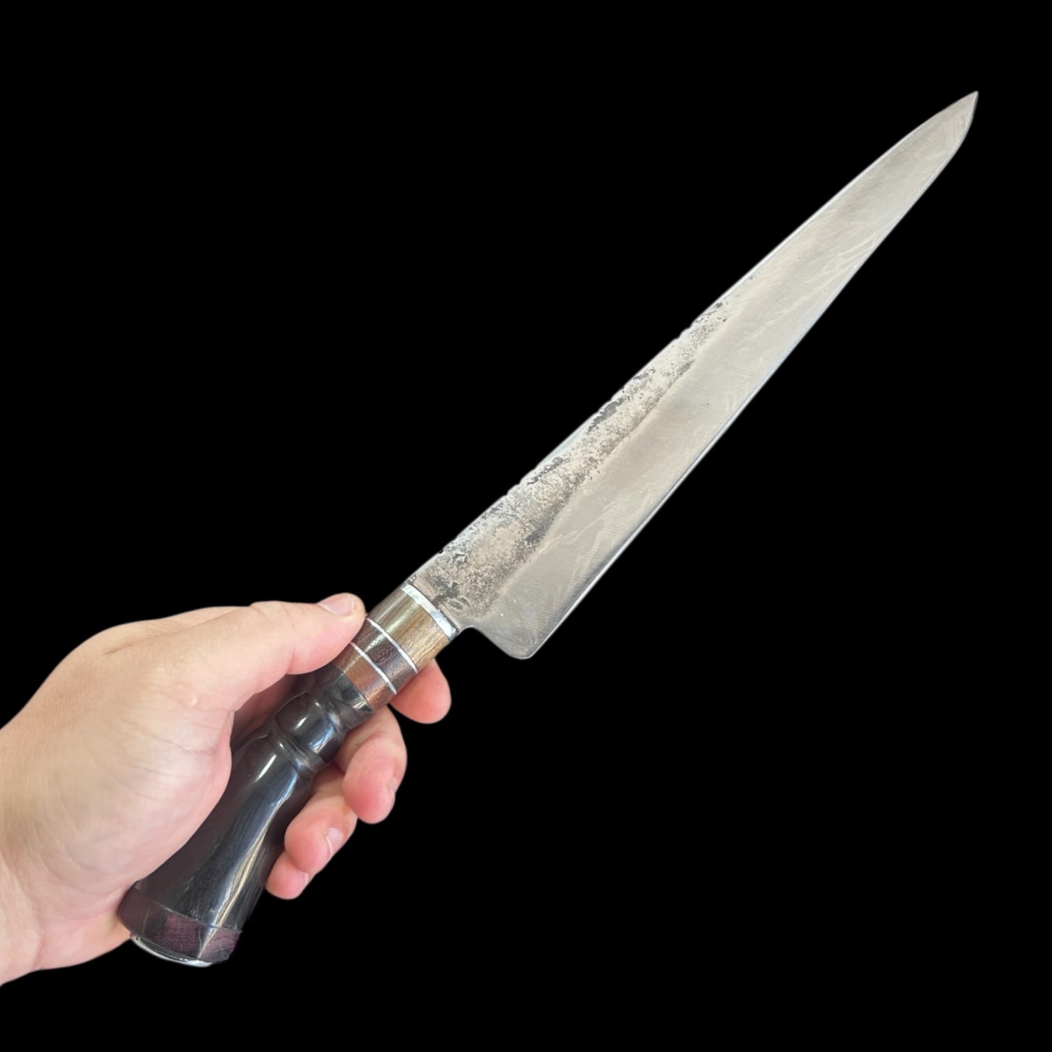 Faca de javali com lâmina confeccionada em disco de arado (aço carbono), guampa bovina ou cabo de osso.