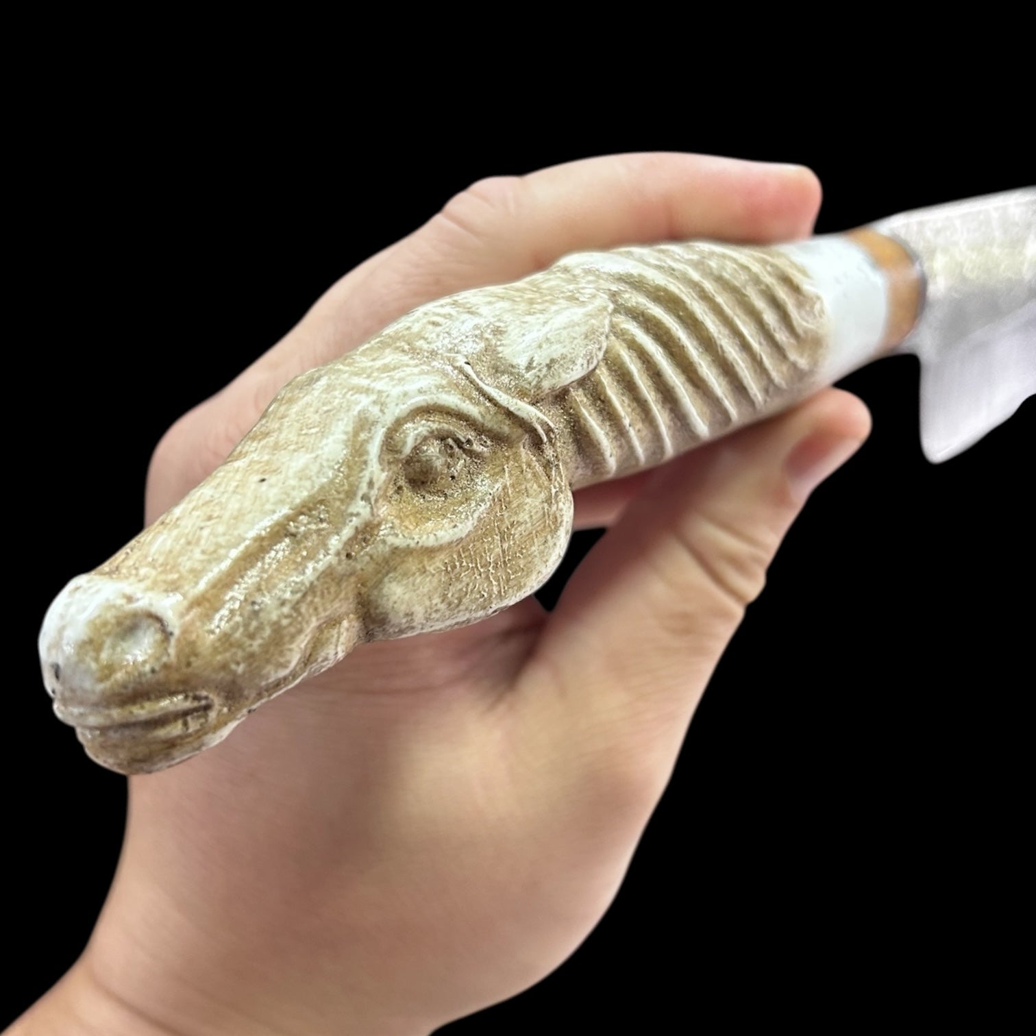 Facas com cabos ilustrados com rostos, lâmina de aço carbono de 23 cm. Acompanha bainha de couro.