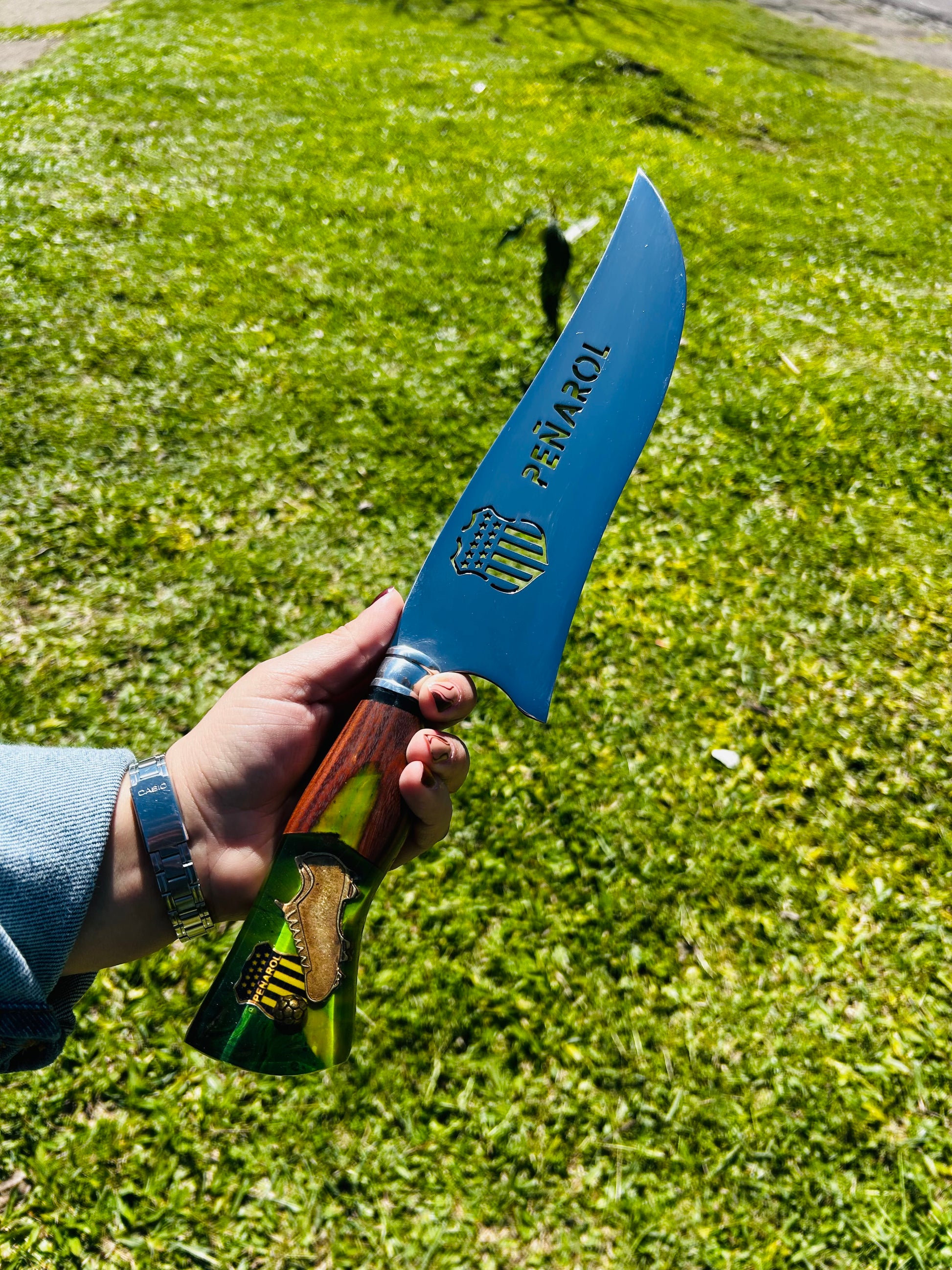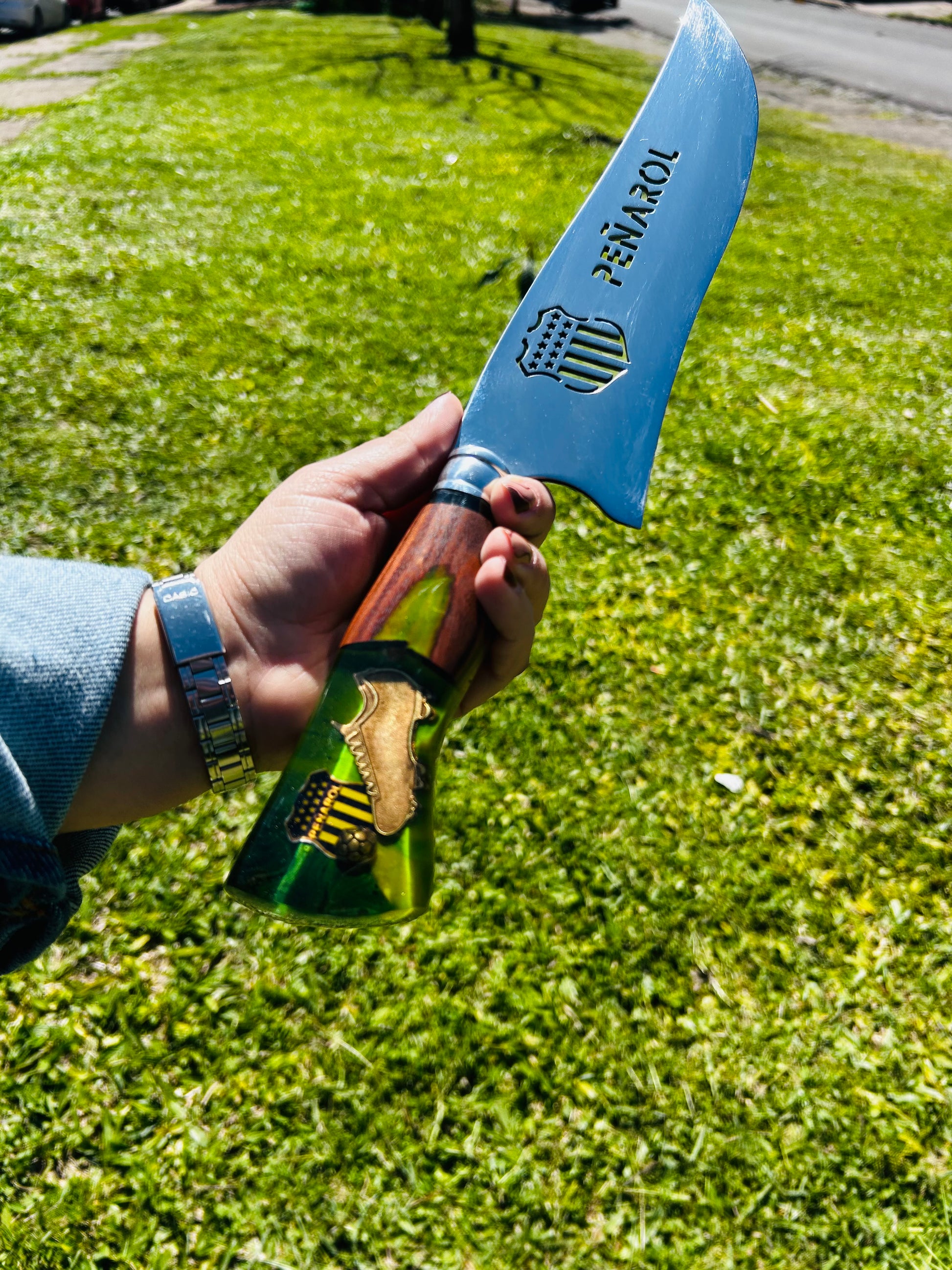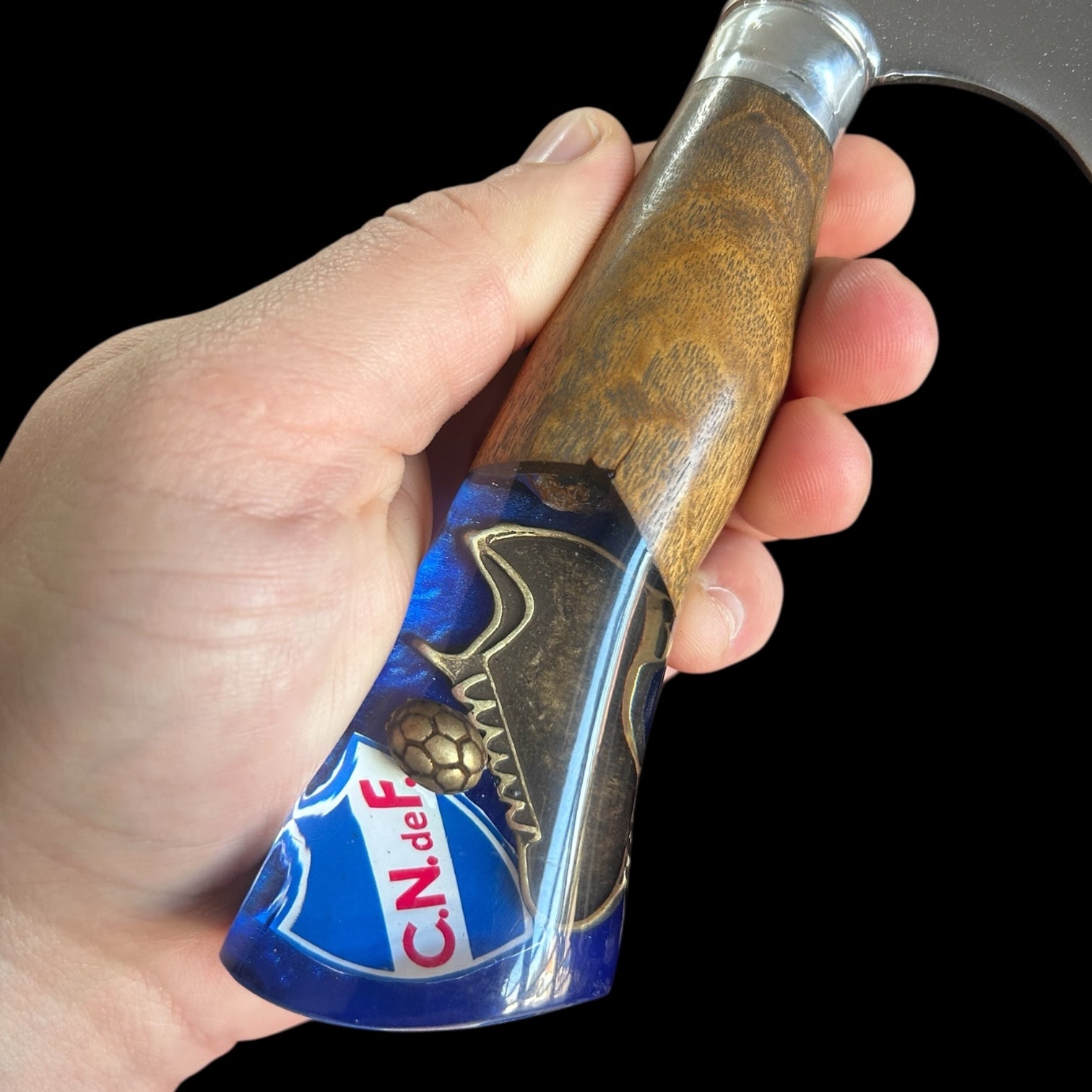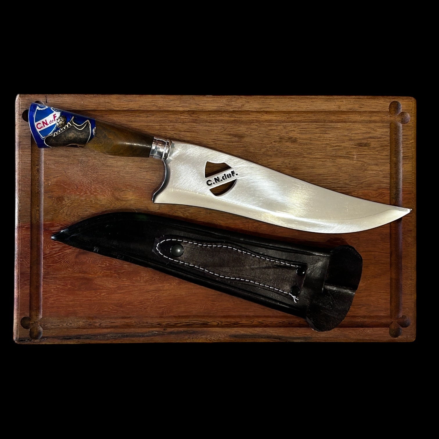 Cuchillo con mango de resina epoxi y lamina en acero inoxidable 420. Mango personalizo con la temática del Club de Futbol. Acompaña vaina y caja en madera.