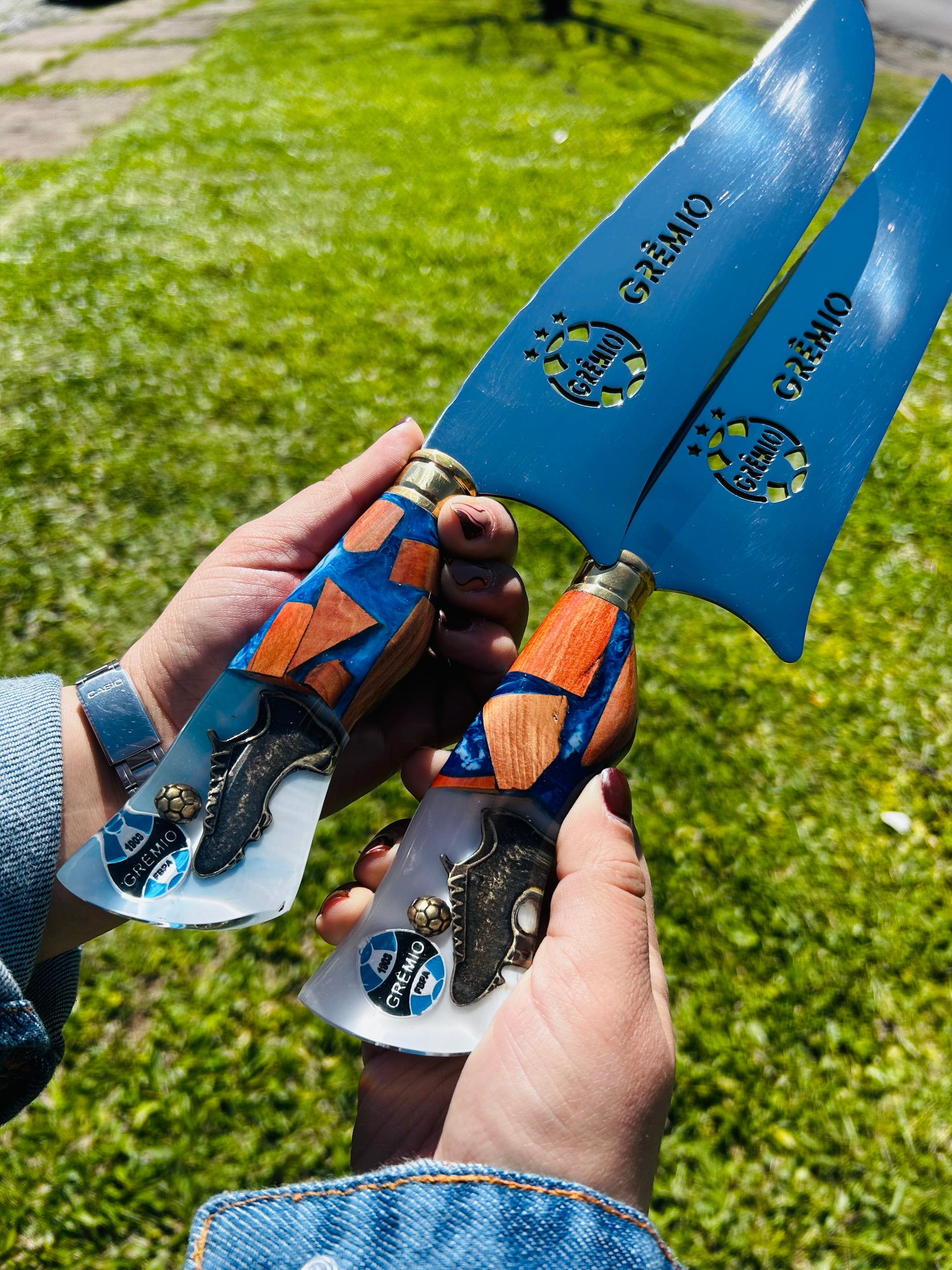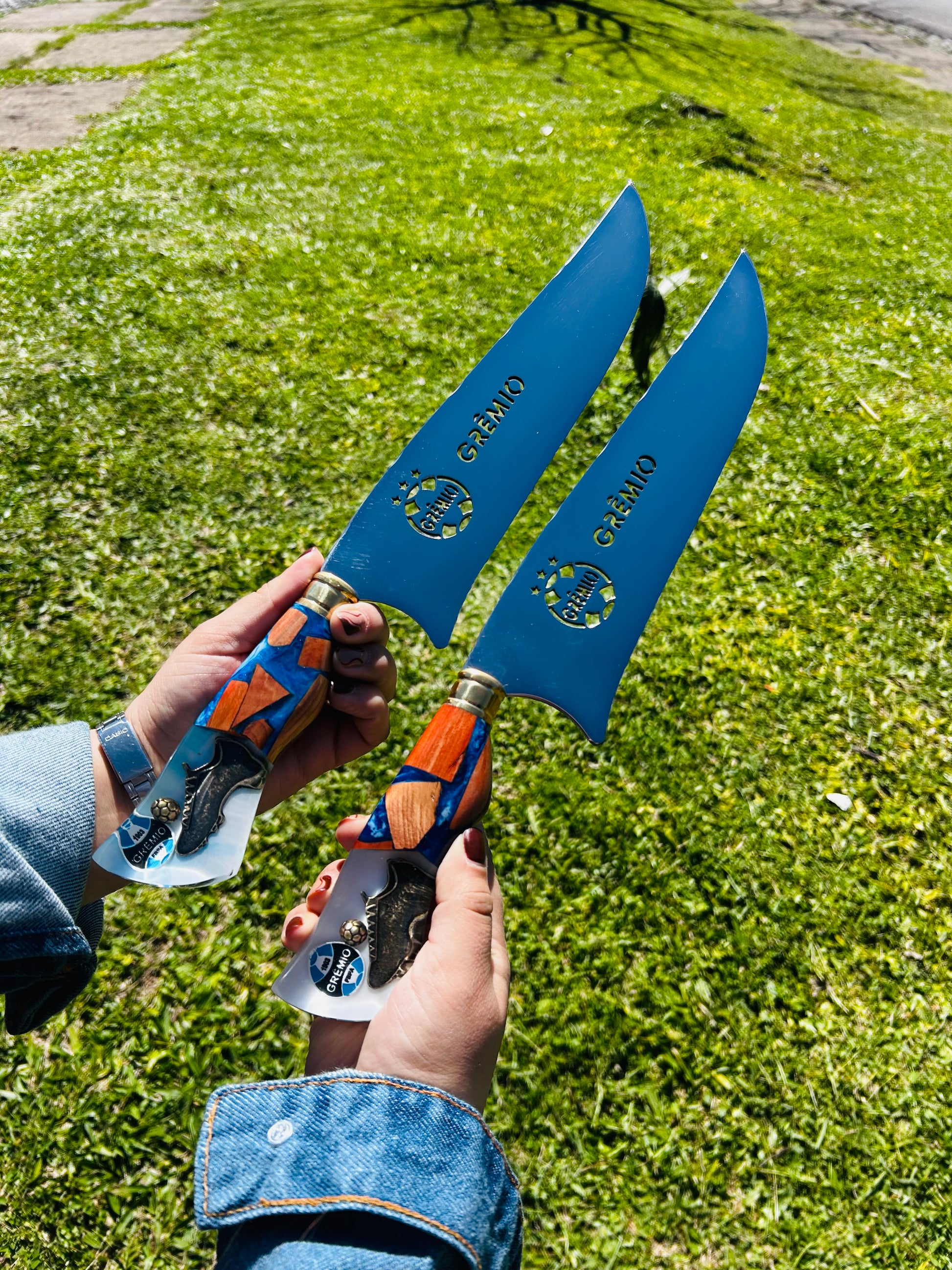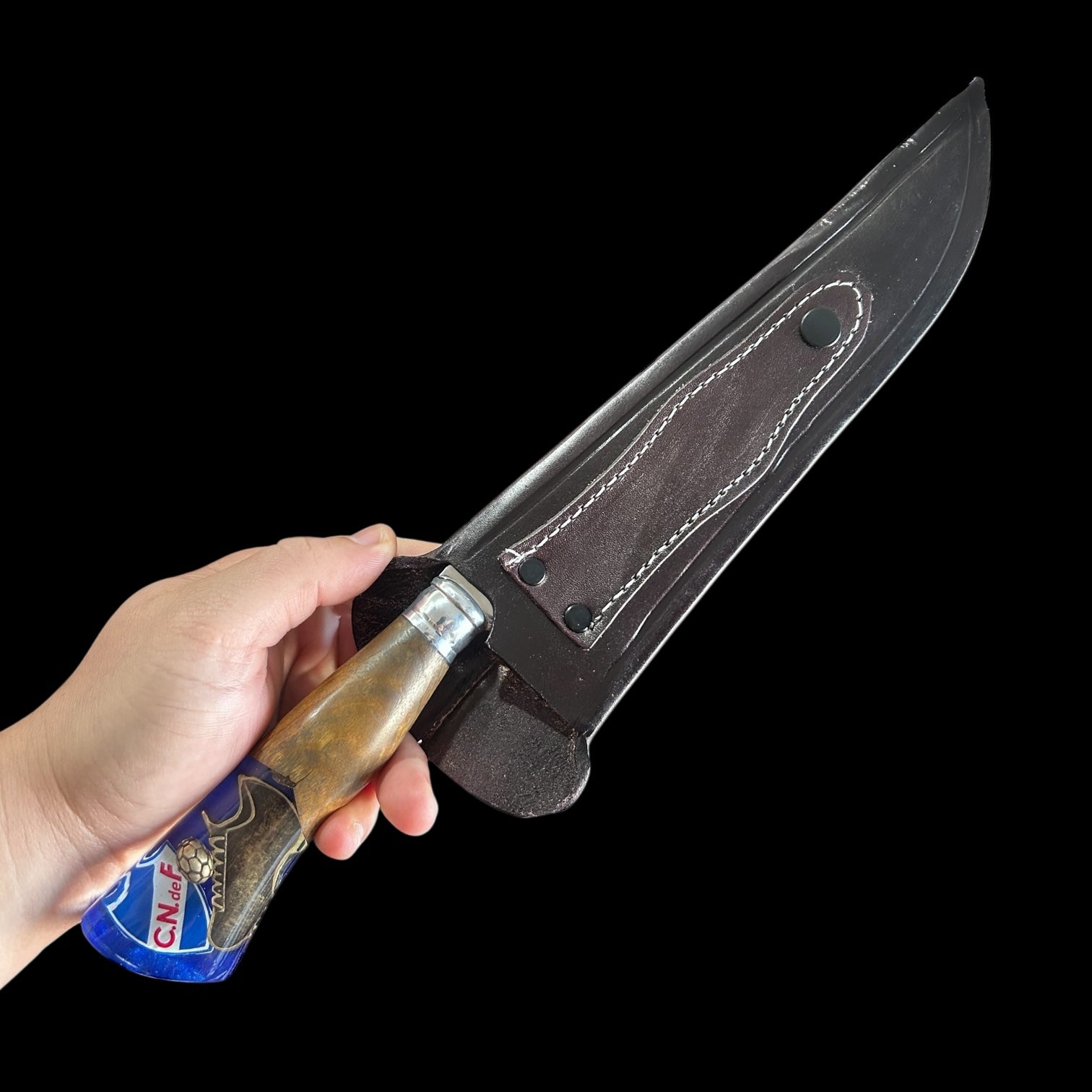 Cuchillo con mango de resina epoxi y lamina en acero inoxidable 420. Mango personalizo con la temática del Club de Futbol. Acompaña vaina y caja en madera.
