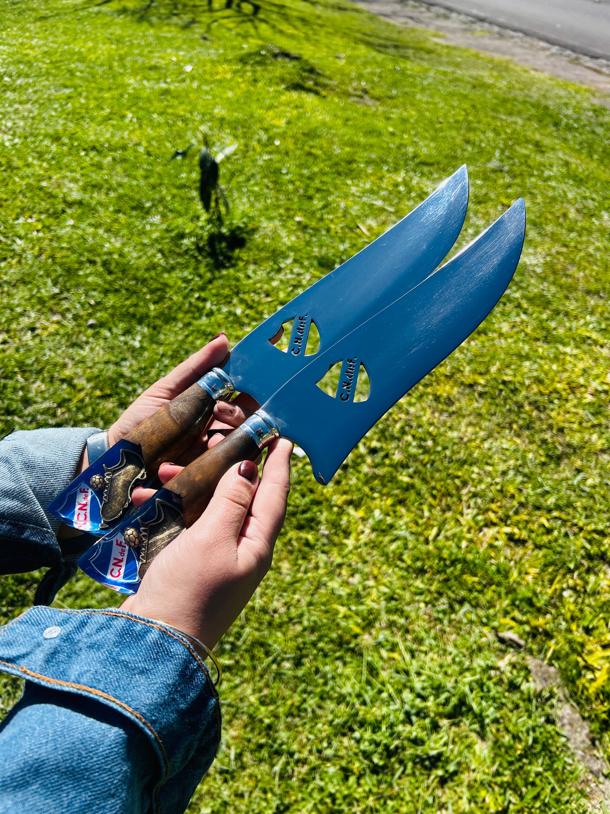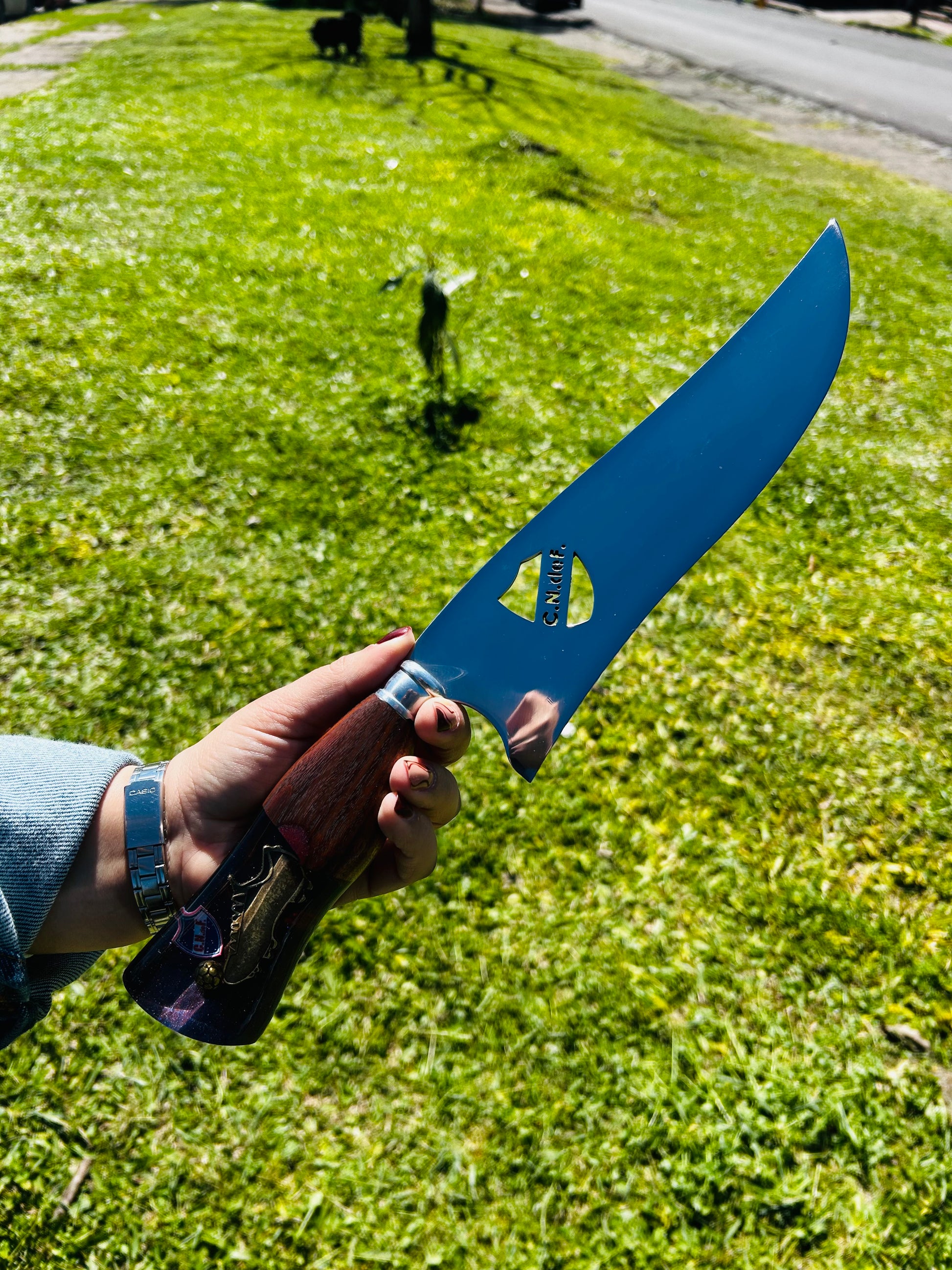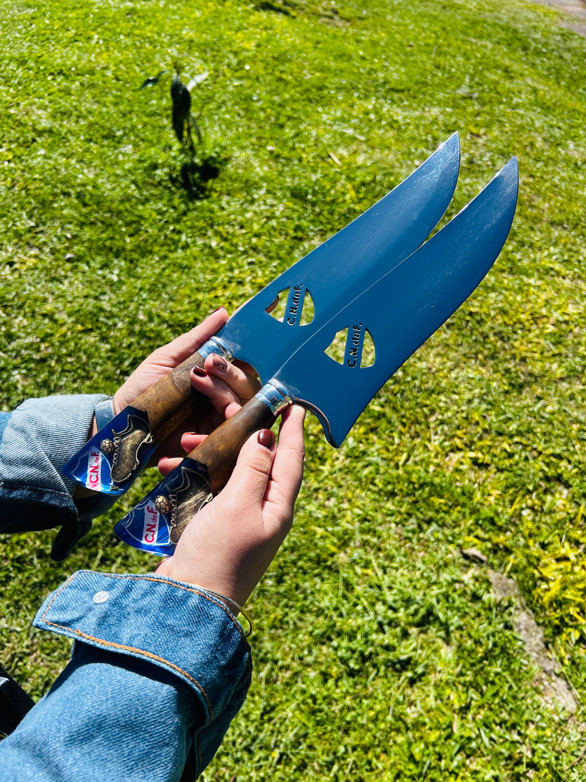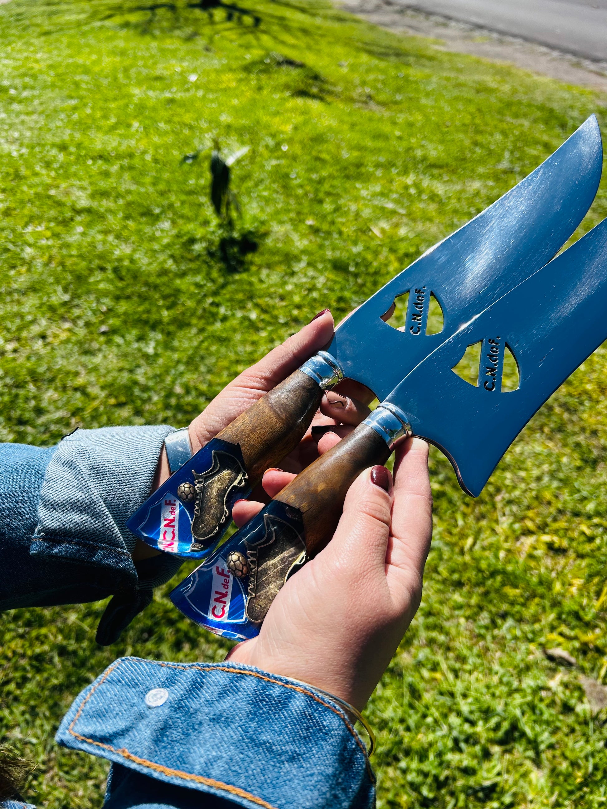 Cuchillo con mango de resina epoxi y lamina en acero inoxidable 420. Mango personalizo con la temática del Club de Futbol. Acompaña vaina y caja en madera.