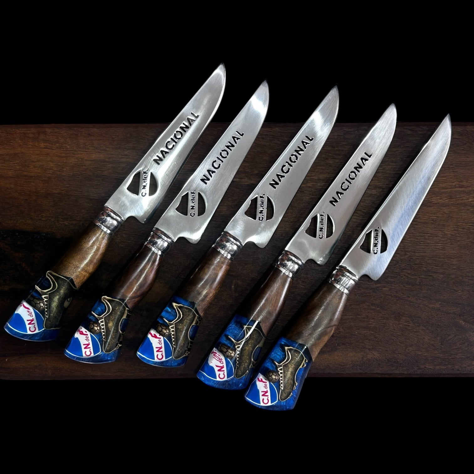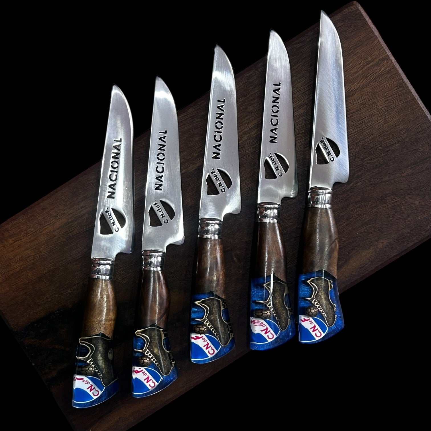 Cuchillo verijero temática Nacional, con mango de resina y hoja en acero inoxidable. Acompaña vaina en cuero.